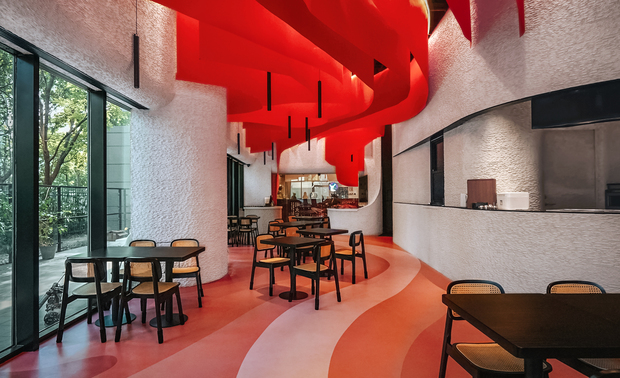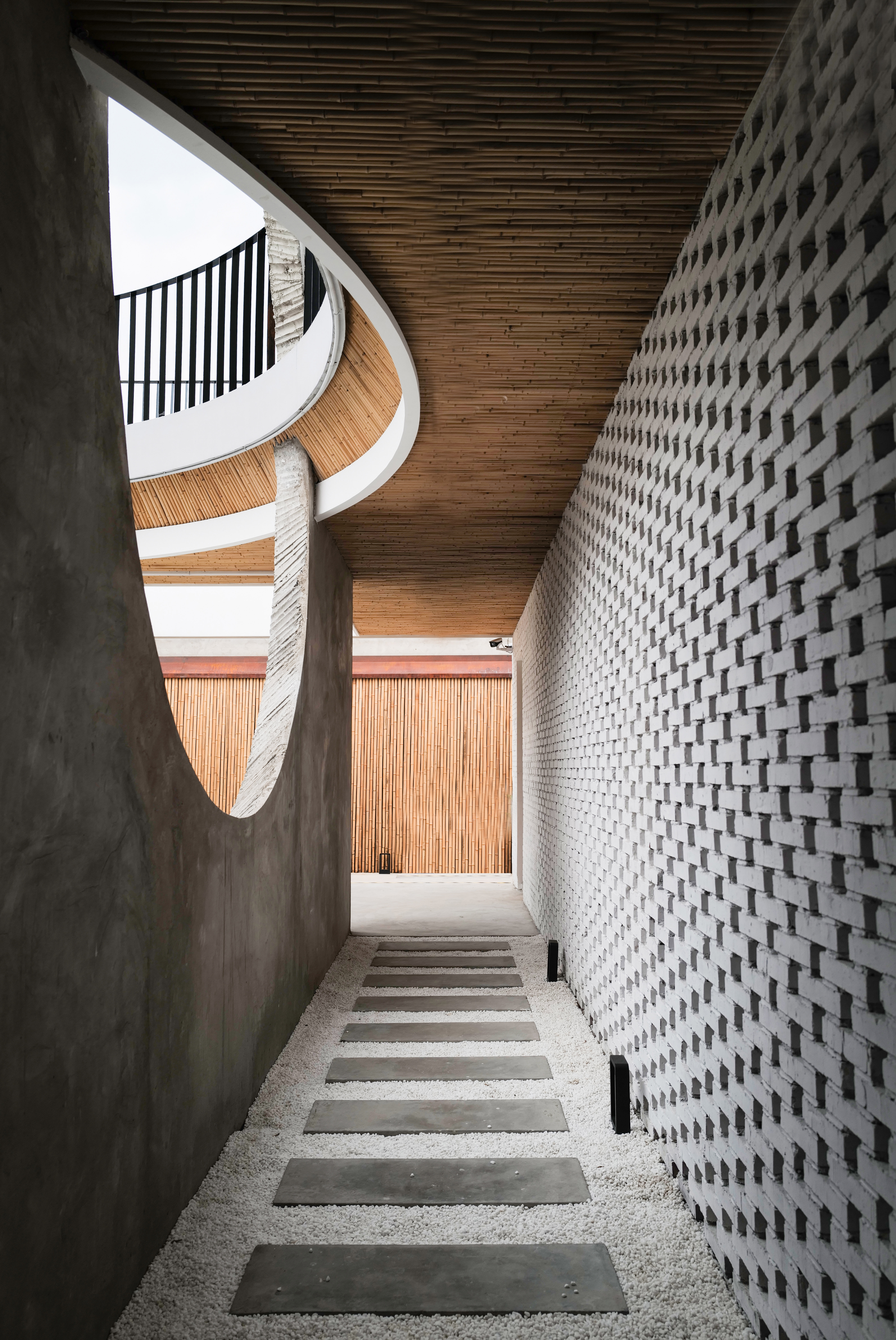 设计选材:建筑在材料的选择上与当地现状形成了较大反差,同时机理上融入村落形态,也形成了街道与公共空间。进入民宿首先进入到公共庭院中。庭院内用了竹子作为墙面材料, 营造了温馨自然的休息环境。