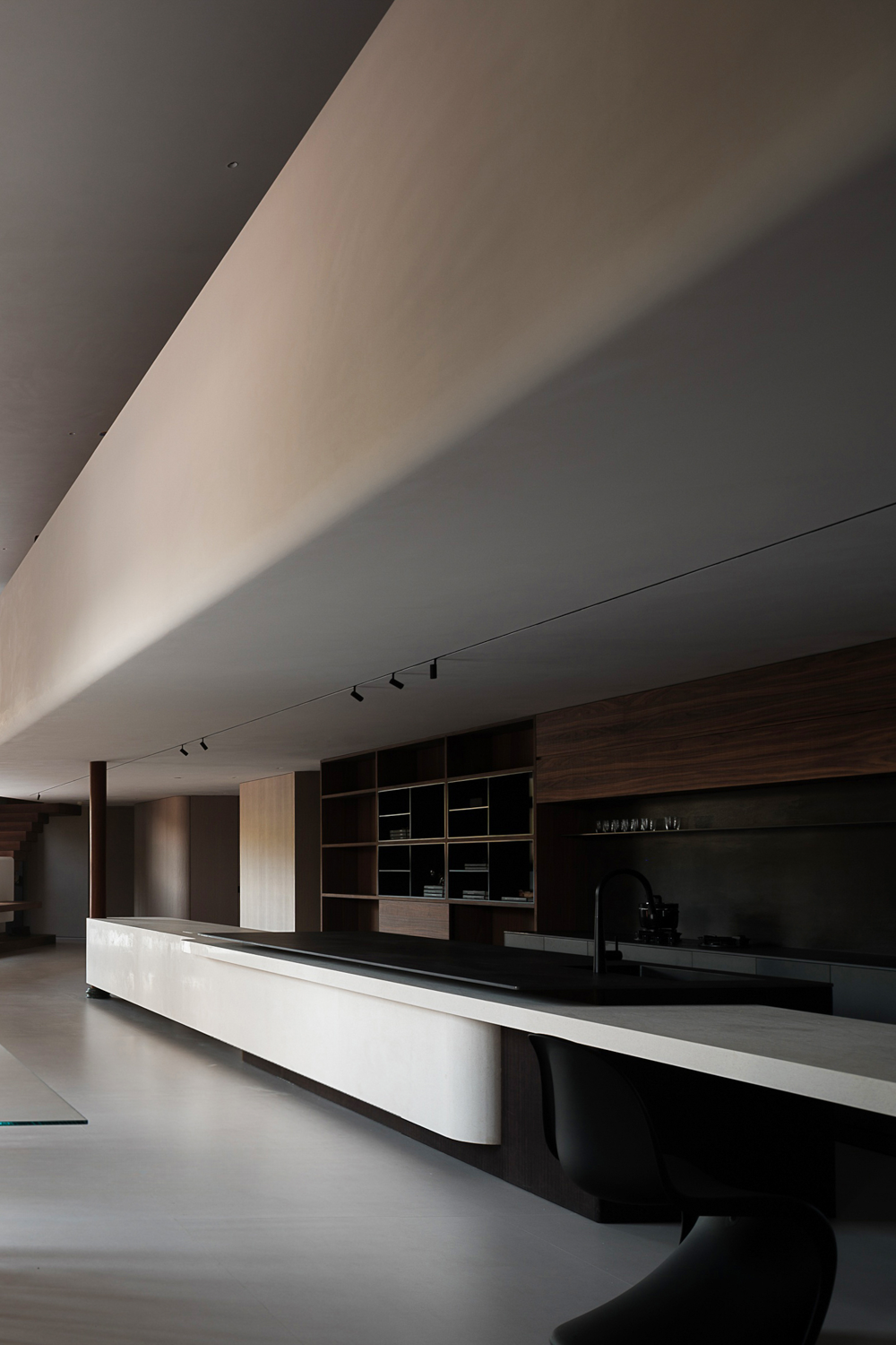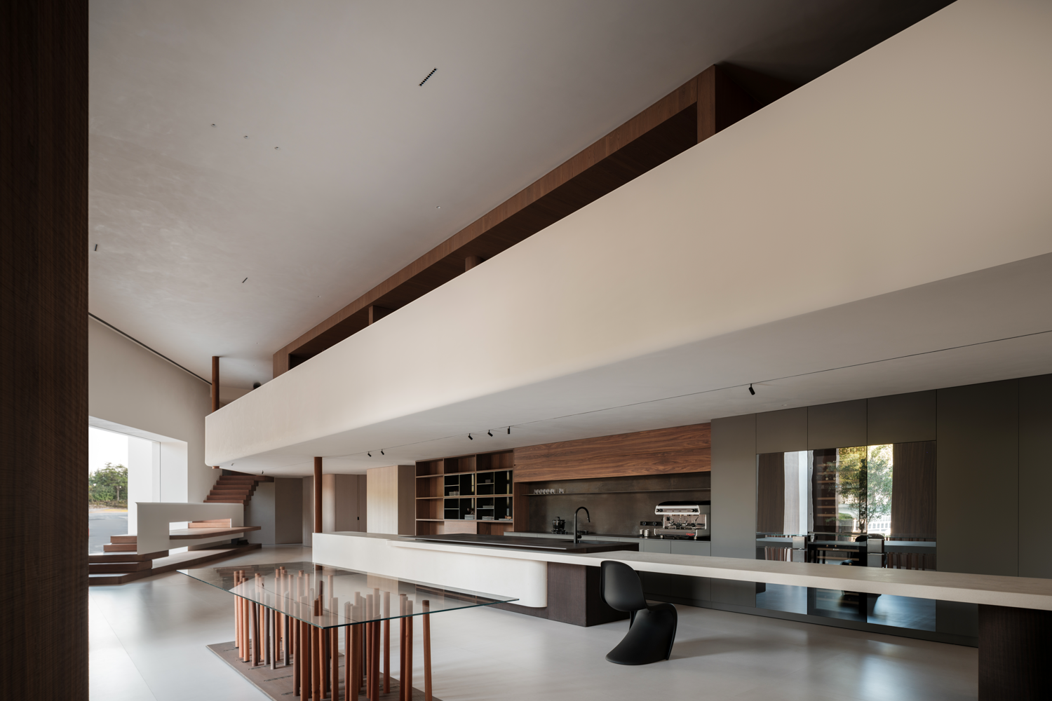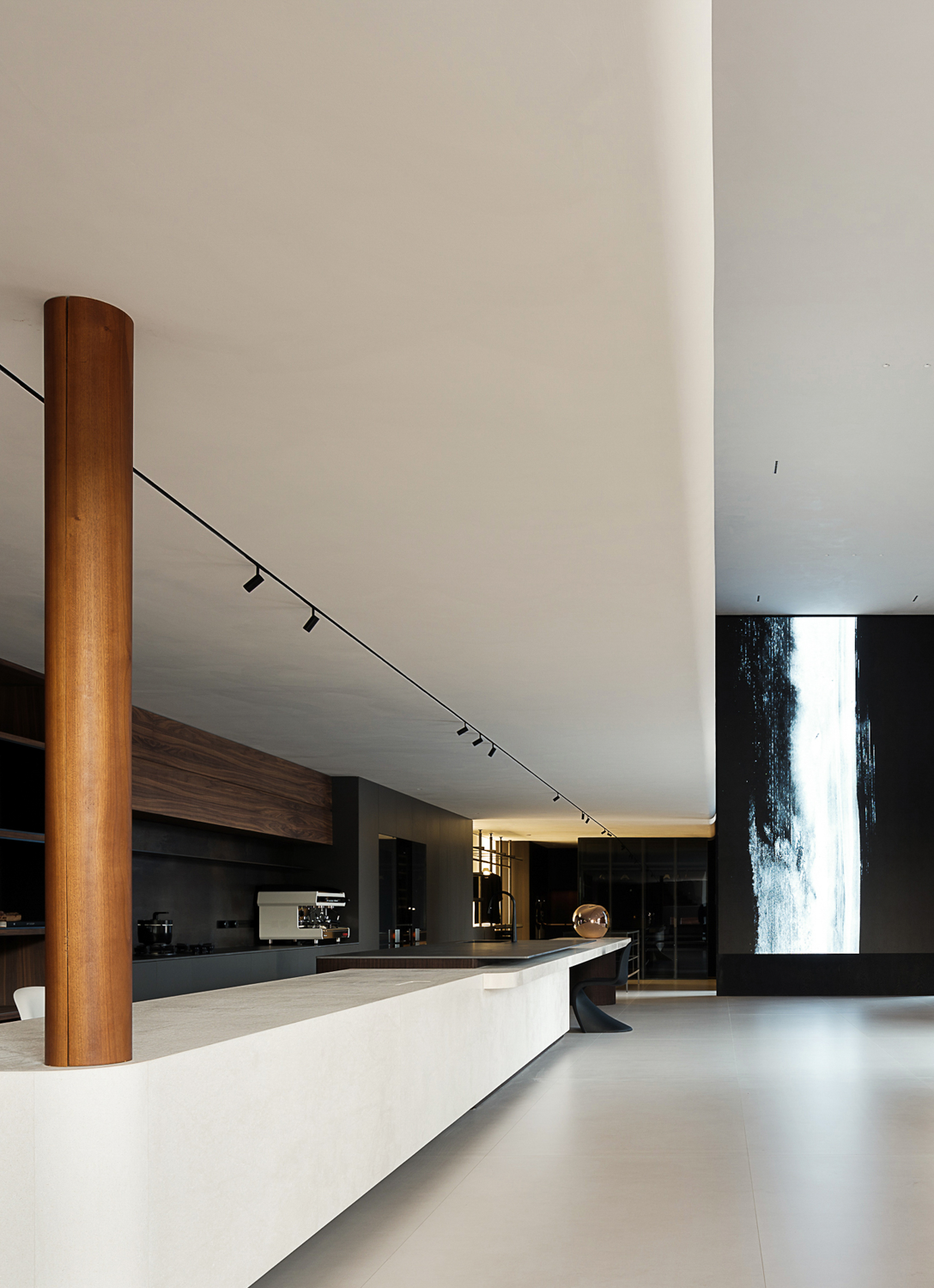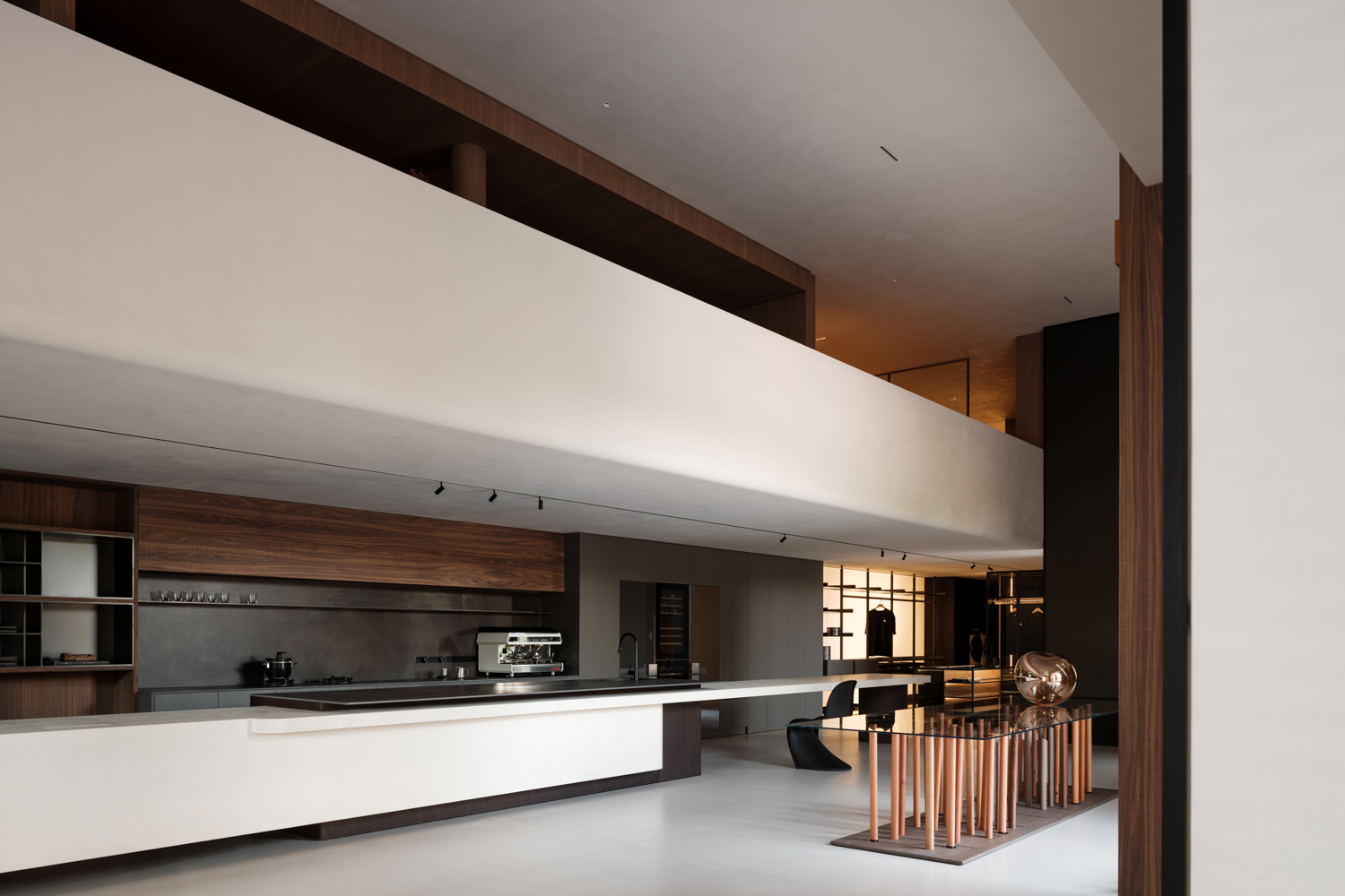 岛台作为西厨功能展示以外,兼任前台功能,一体岩板拉长空间纵深,引起目光向内延展透视。剥离出产品的内核,反向推导出存在的可行性,以美学的目光向消费者叙述产品在空间中的差异化本质。