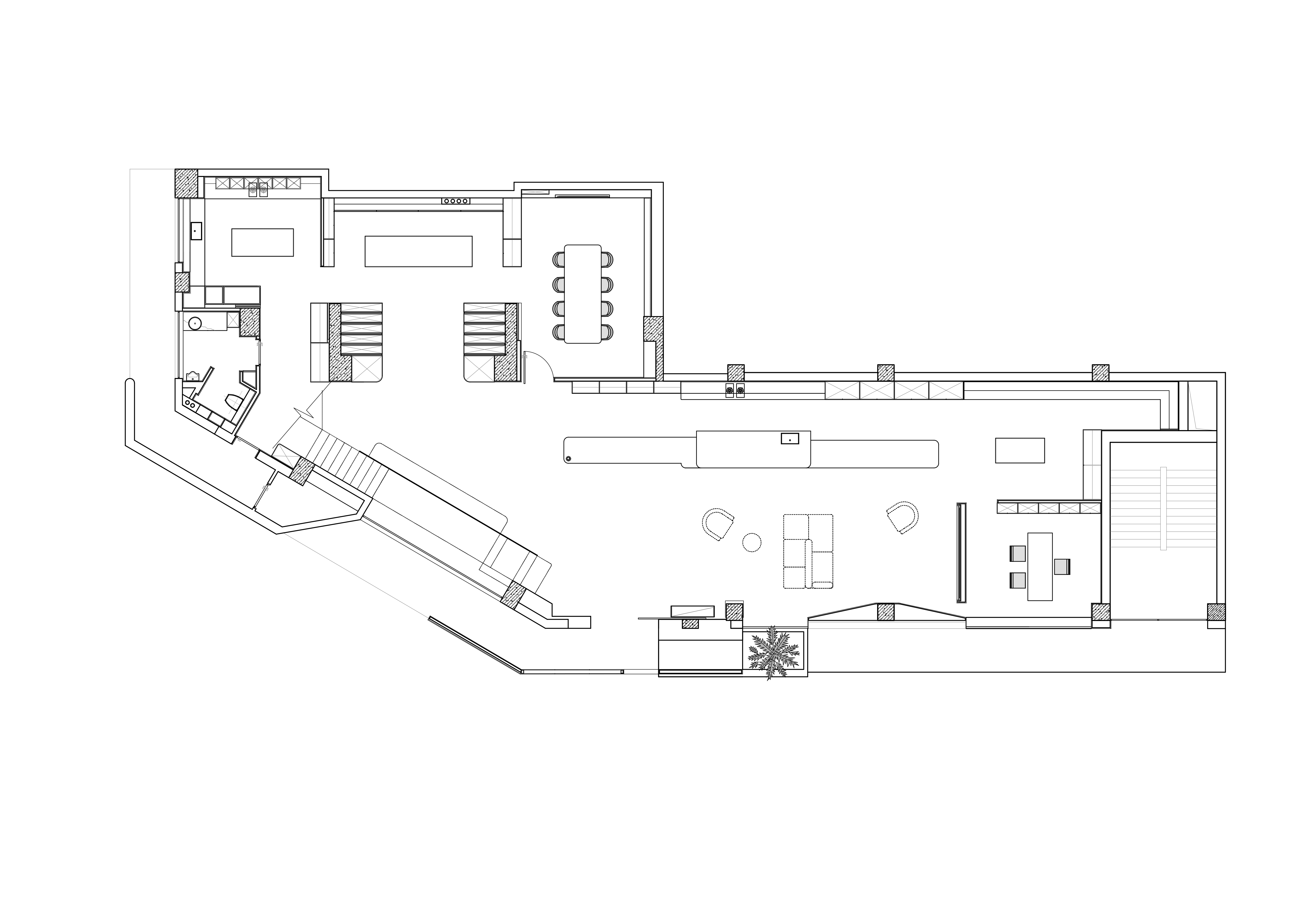 设计三向动线,以满足不同目的的到访。入门右侧用于满足初次到店的体验需求,左侧则为二次到店的选样与汇报区域,通过楼梯上行,则为设计师的办公场所。