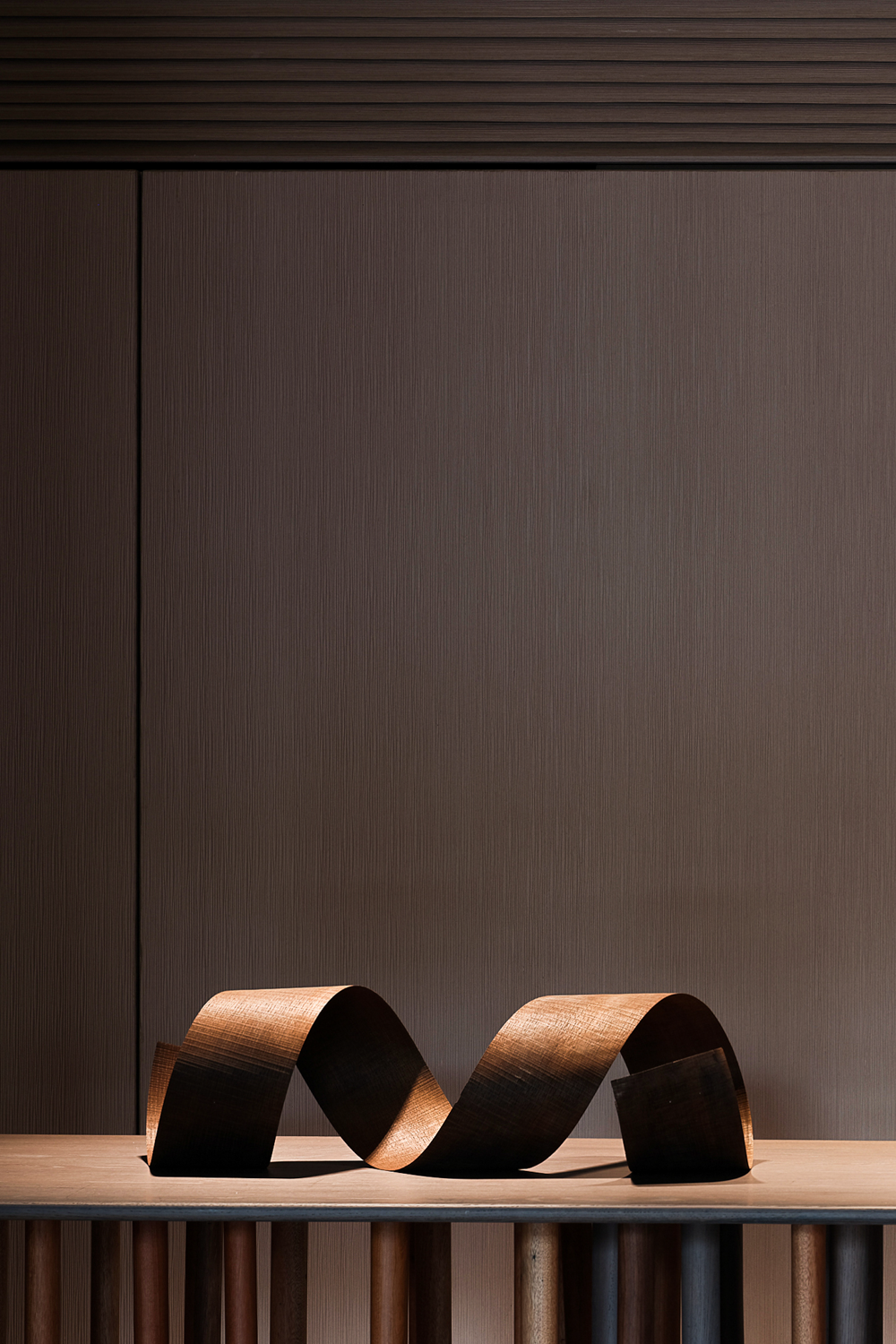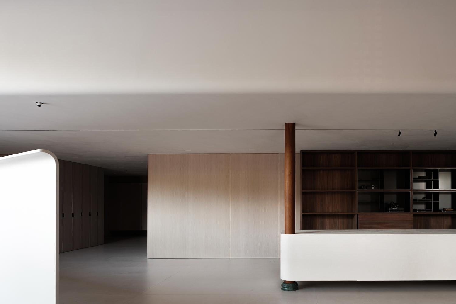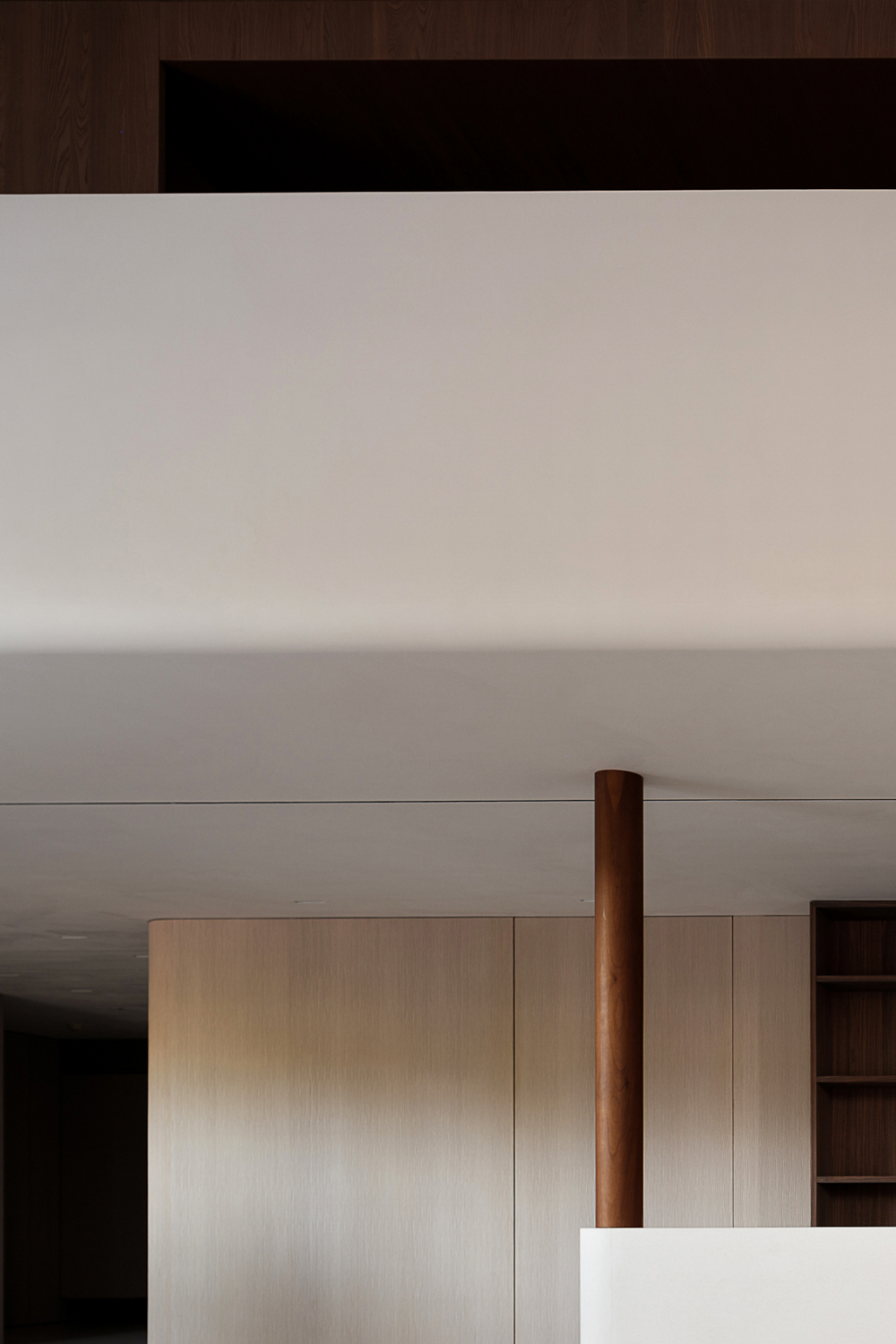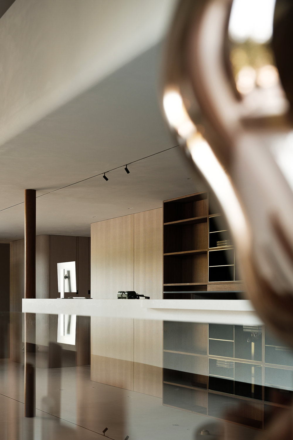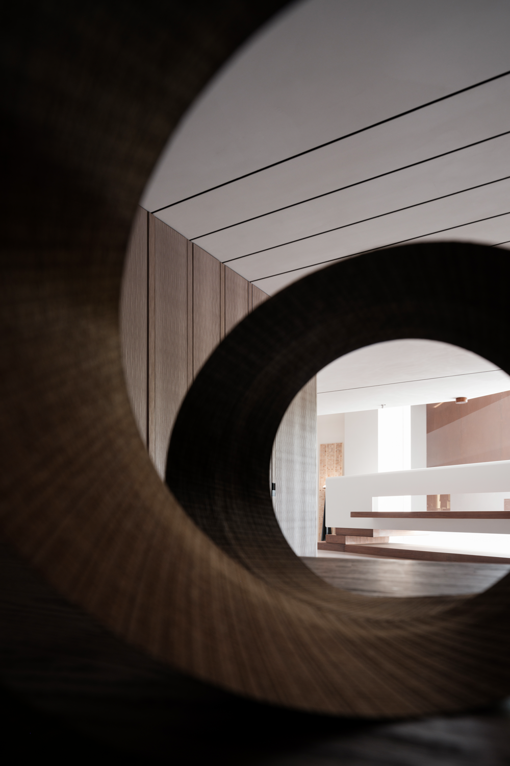 我们始终认为,木作与中式的传统审美不可分割,于是在极具现代化的极简线条中,置入些微的中国元素,例如前台处的圆形木柱、门边高处形似老式木刨的榫卯结构,以及场景中随处可见的中式摆件收藏……这些元素零散地分布在空间中,达成当下审美与传统意象的和解,重塑空间的时间维度。