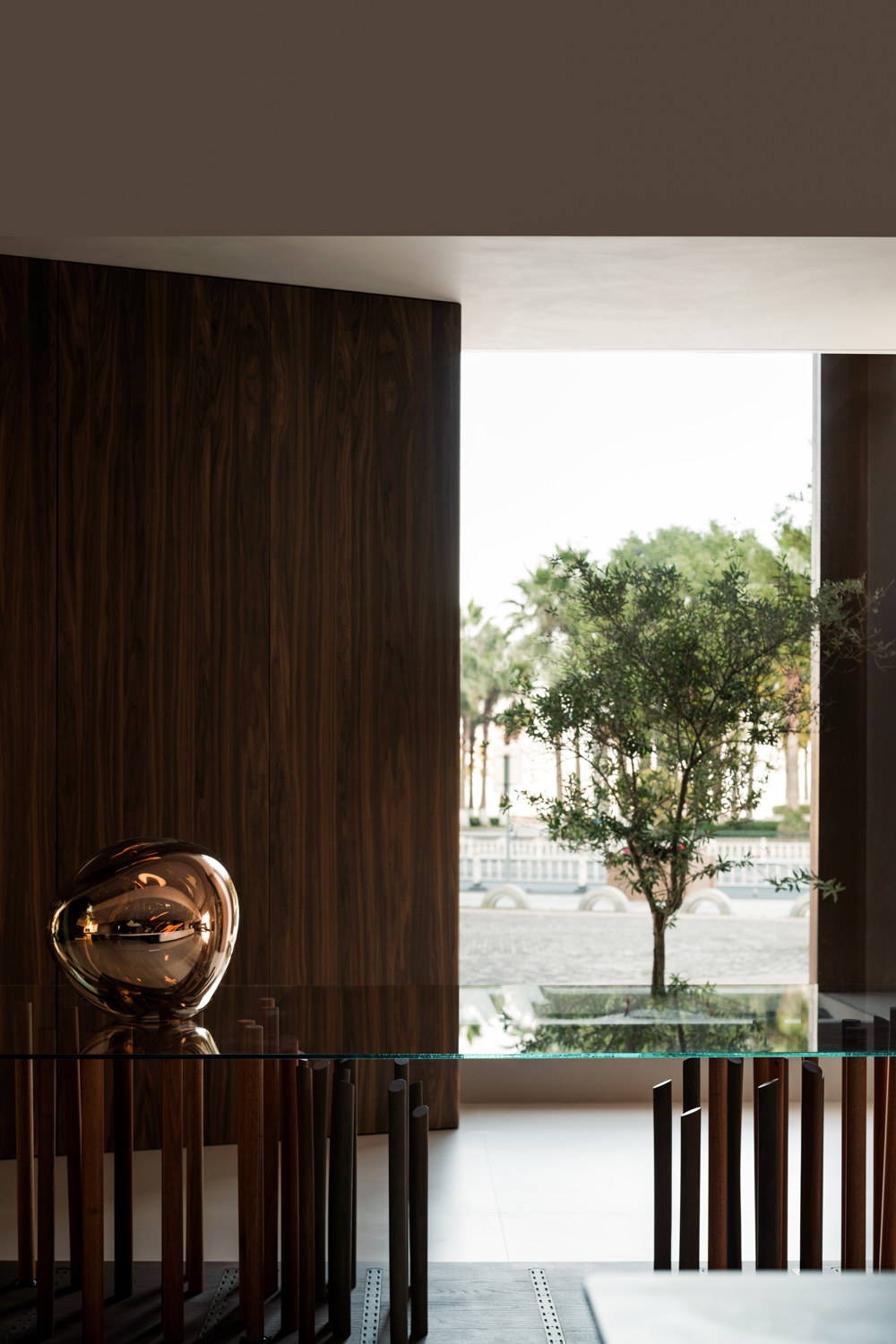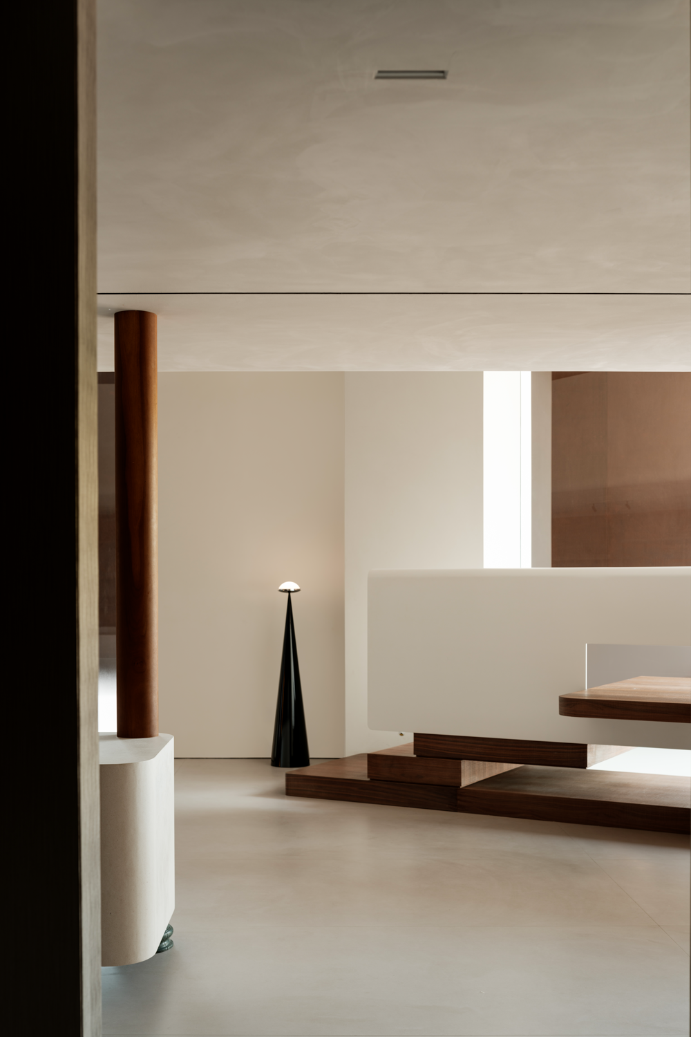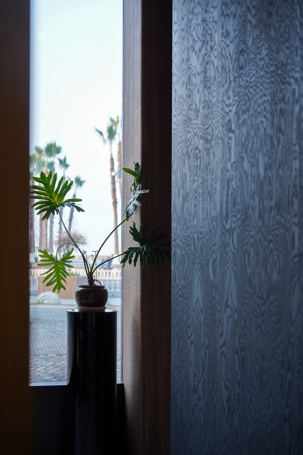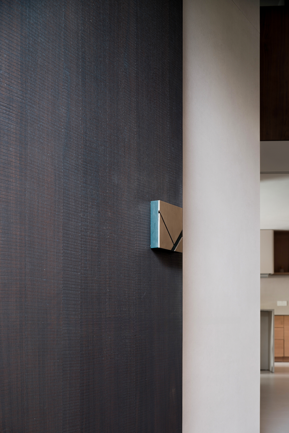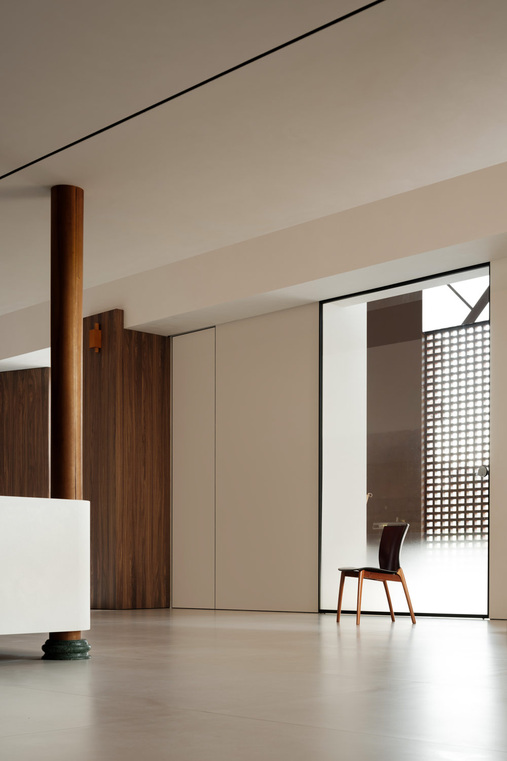 我们始终认为,木作与中式的传统审美不可分割,于是在极具现代化的极简线条中,置入些微的中国元素,例如前台处的圆形木柱、门边高处形似老式木刨的榫卯结构,以及场景中随处可见的中式摆件收藏……这些元素零散地分布在空间中,达成当下审美与传统意象的和解,重塑空间的时间维度。