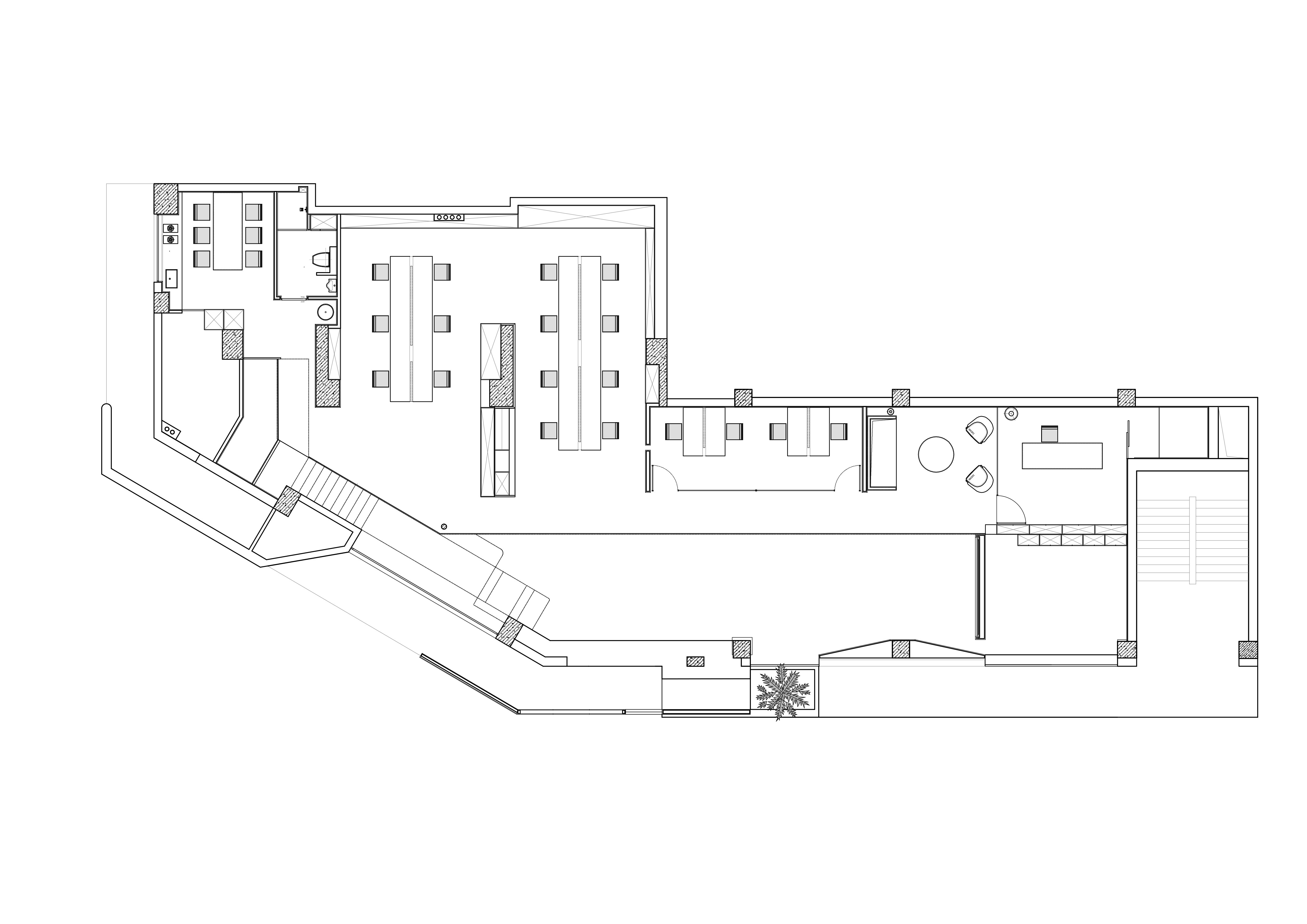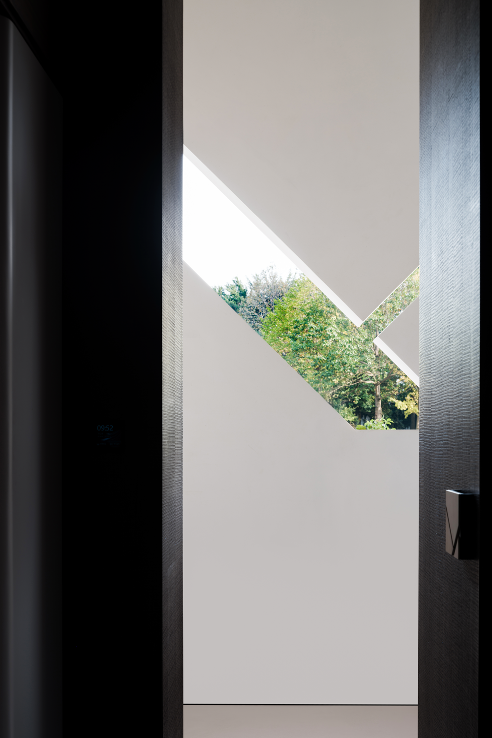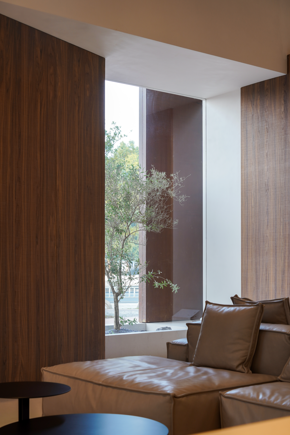 多方权衡后我们选择在钢板扶手下方打开空隙,让自然光得以进入,方便观察板材在自然光线下的色彩效果,而这一做法同时带来了令人意外的惊喜,白色的楼梯扶手恰好遮住了灰色的水泥马路,从室内向外观之,唯有绿色的植被参差生长,仿佛置身于植被茂密的丛林,而非繁华喧闹的现代化都市,反而为空间带来了更为舒适僻静的体验效果。