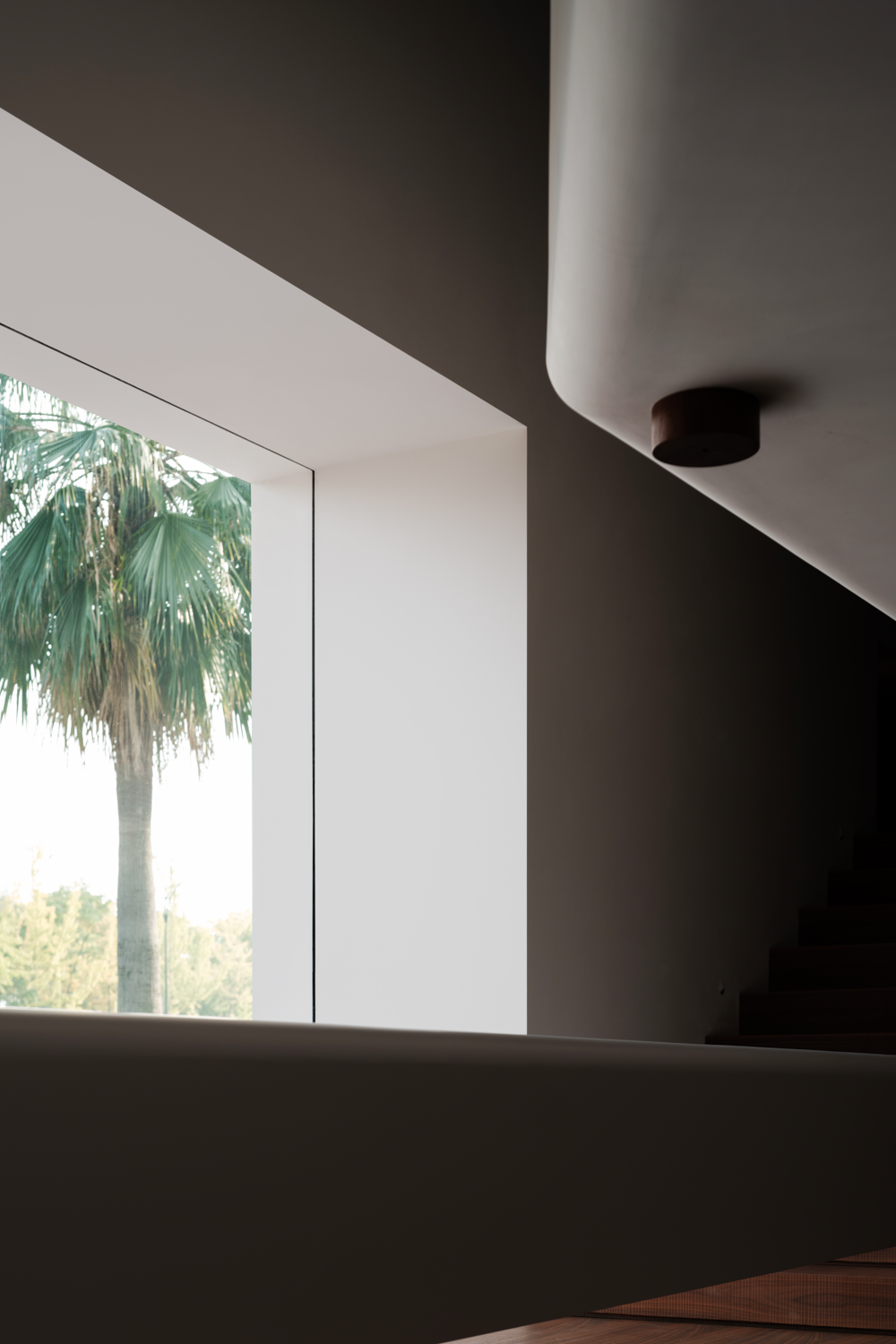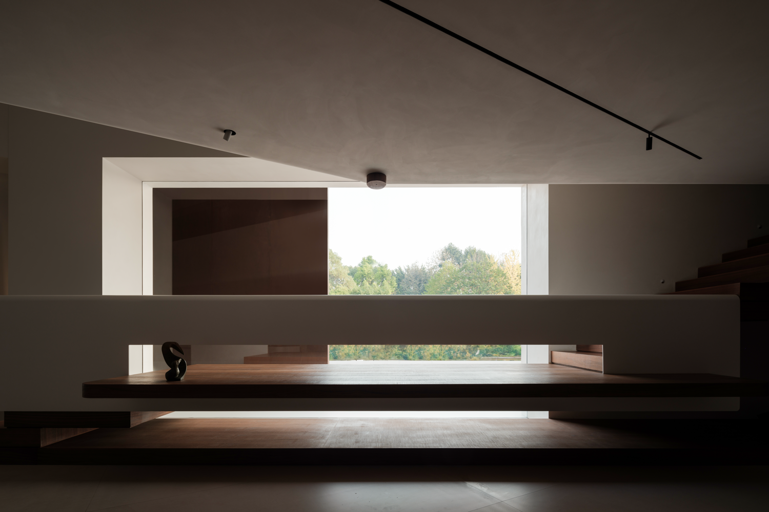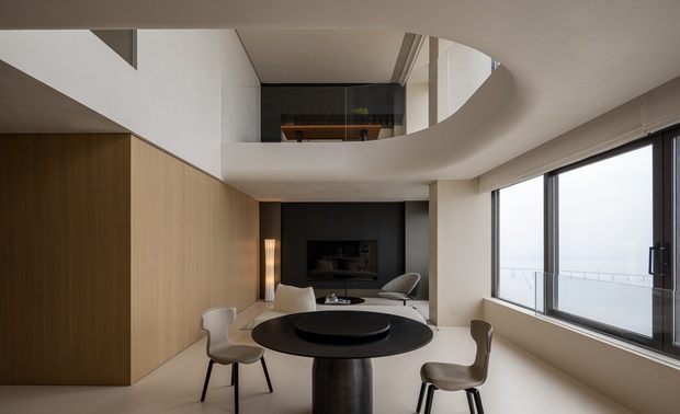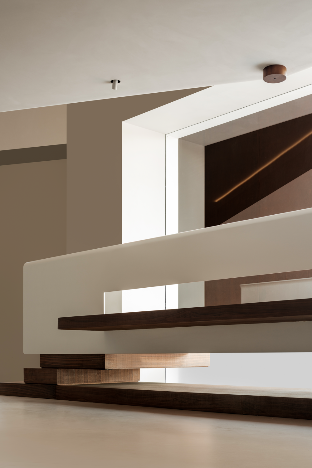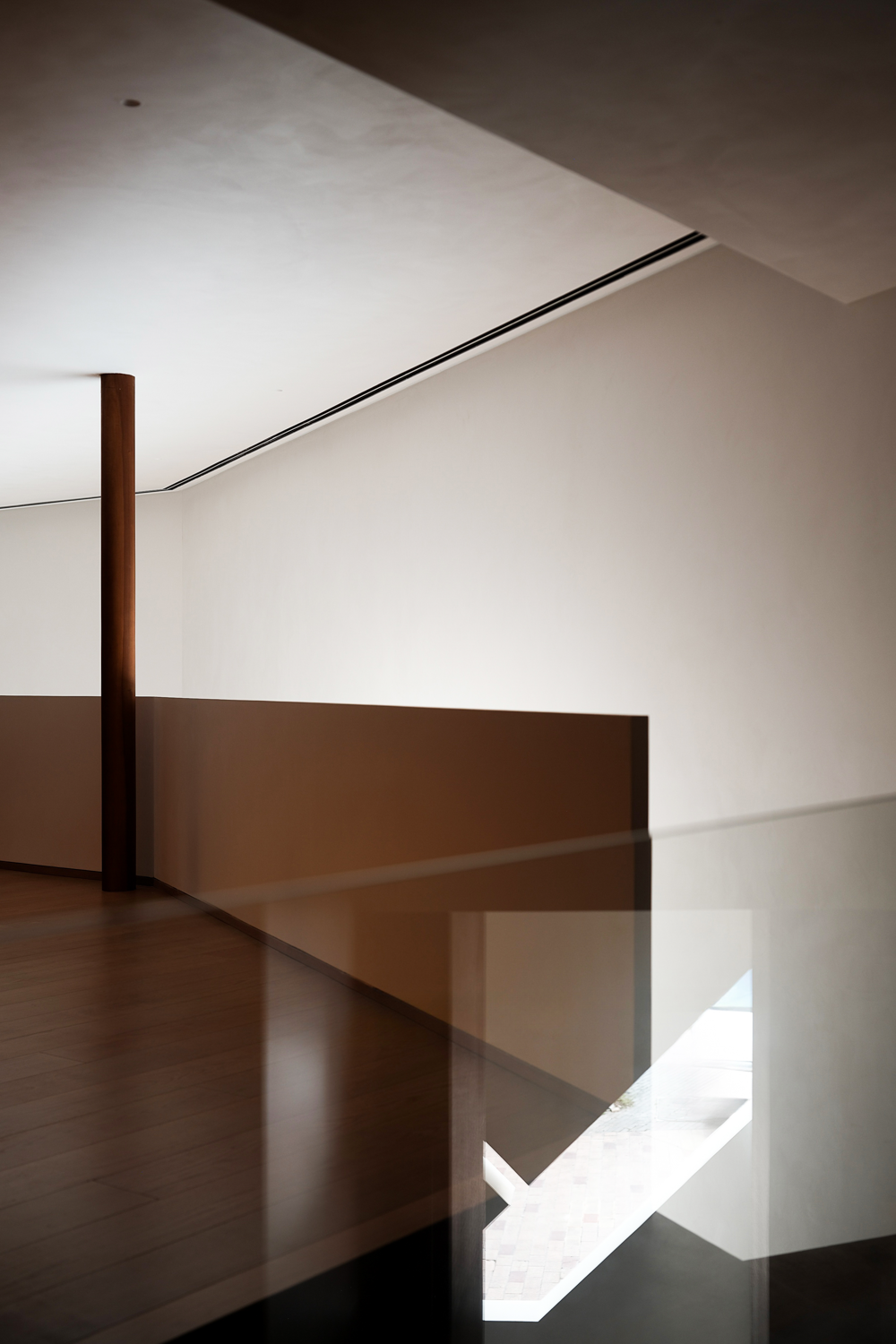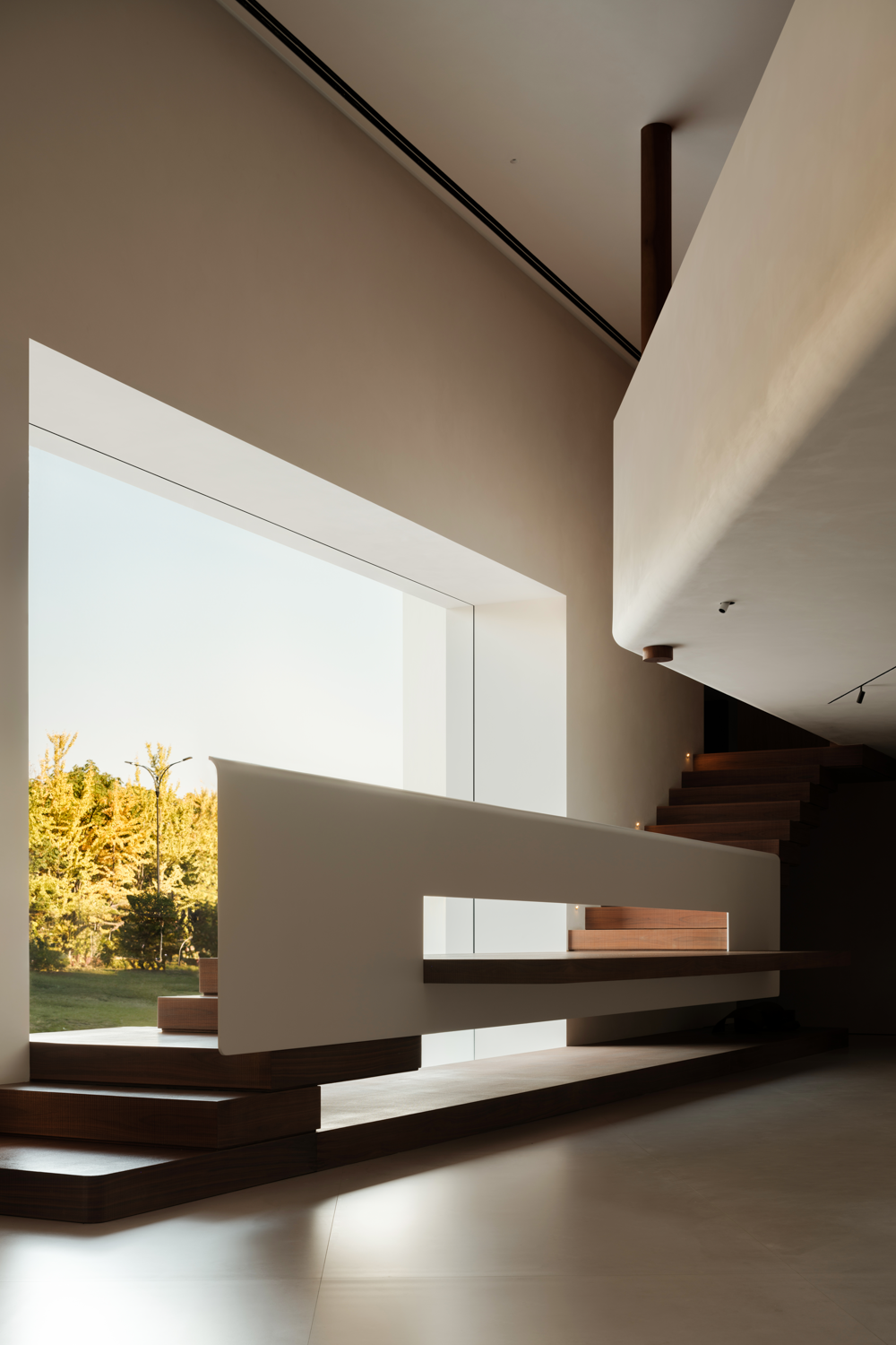通往二层的楼梯经过落地窗辗转向上,拾级而上的过程赏心悦目,但为保证行走的安全性,我们不得不在一侧设置扶手隔断,这种行为势必会对窗外的景观带来遮挡。