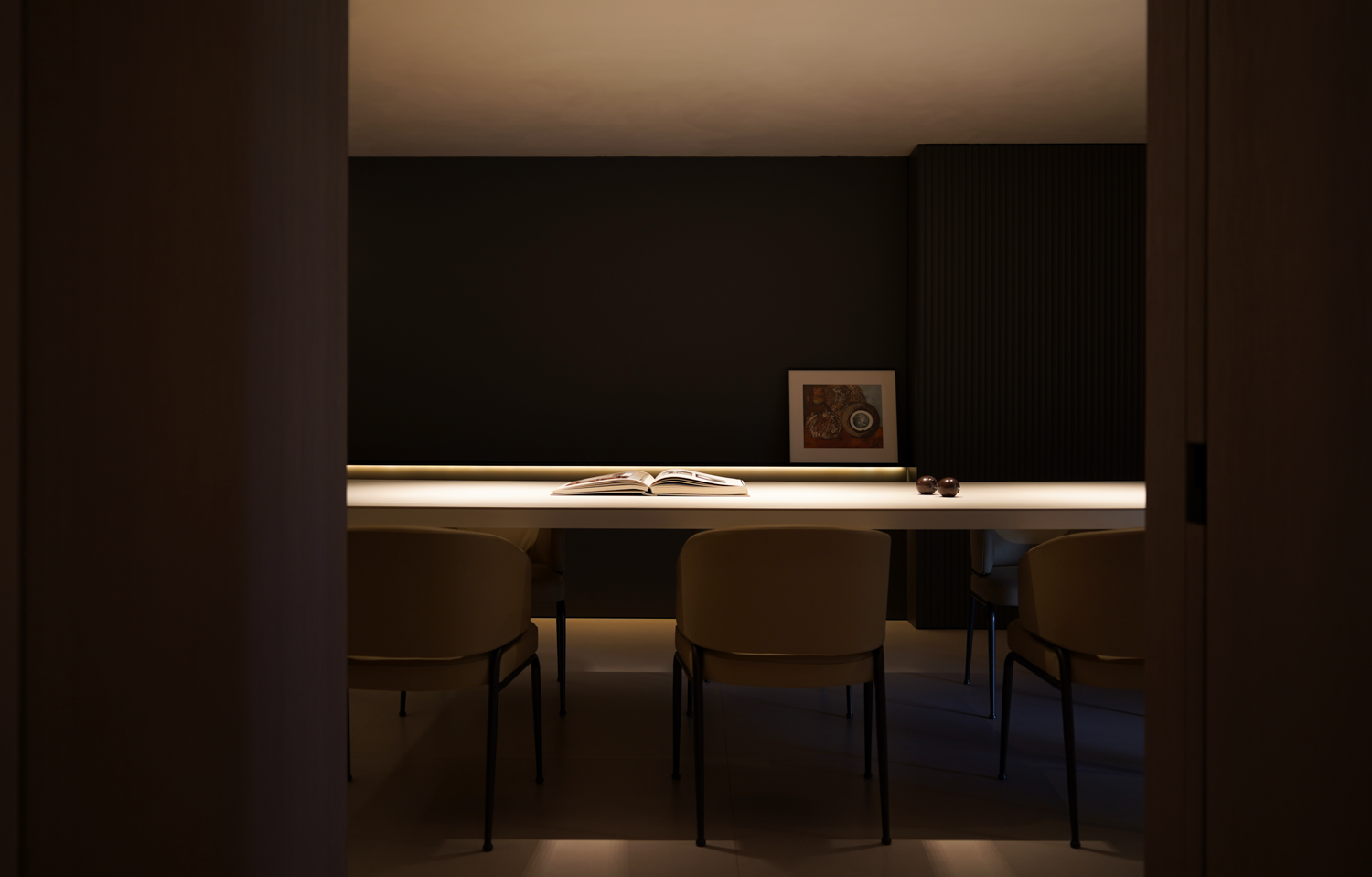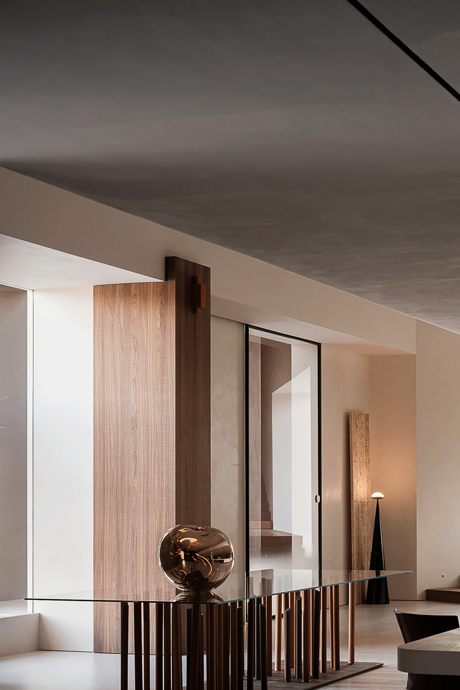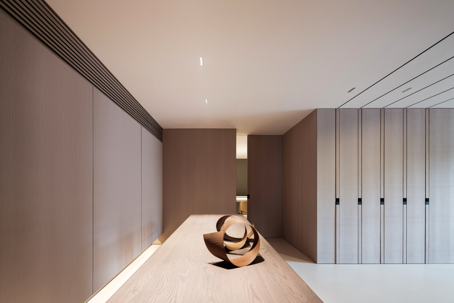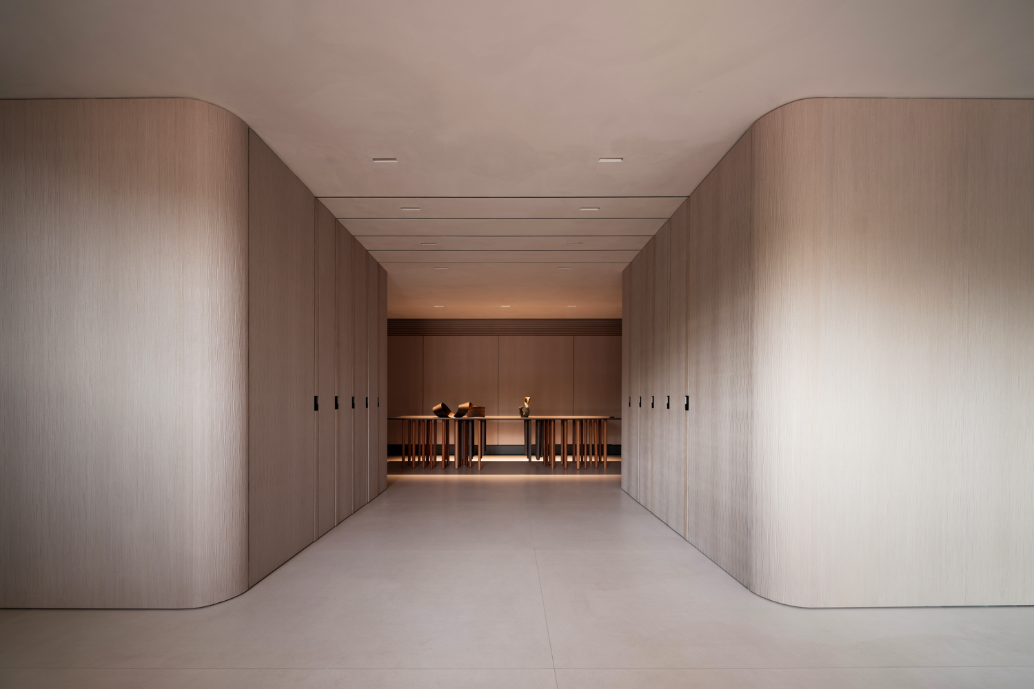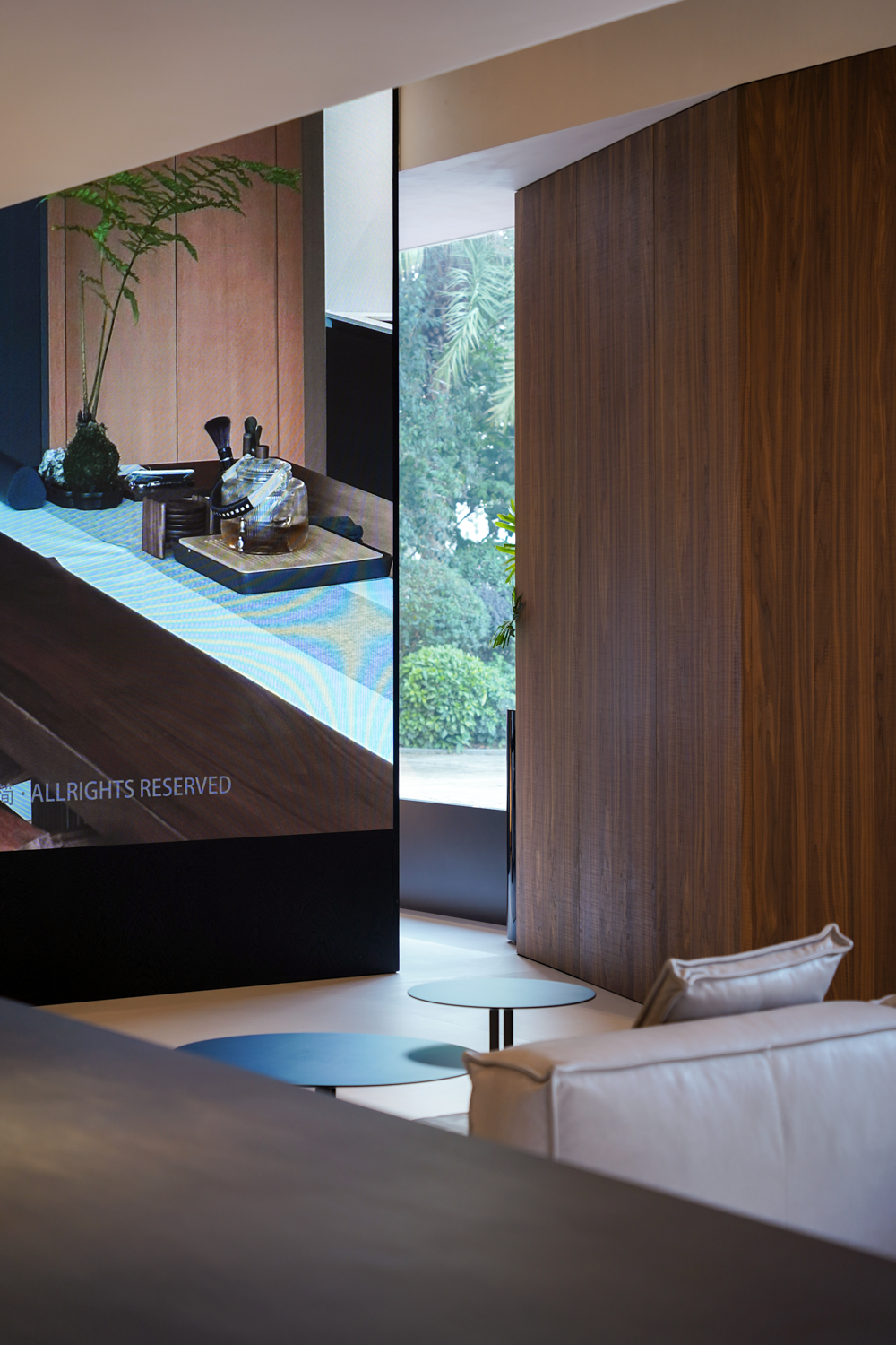 我们希望空间是简约的,同时也是东方内敛的。通过“内向化”展陈处理,将产品隐藏在柜门之中,墙体之内,只在需要被选择的时候呈现给特定的消费者,不影响日常的体验感受。