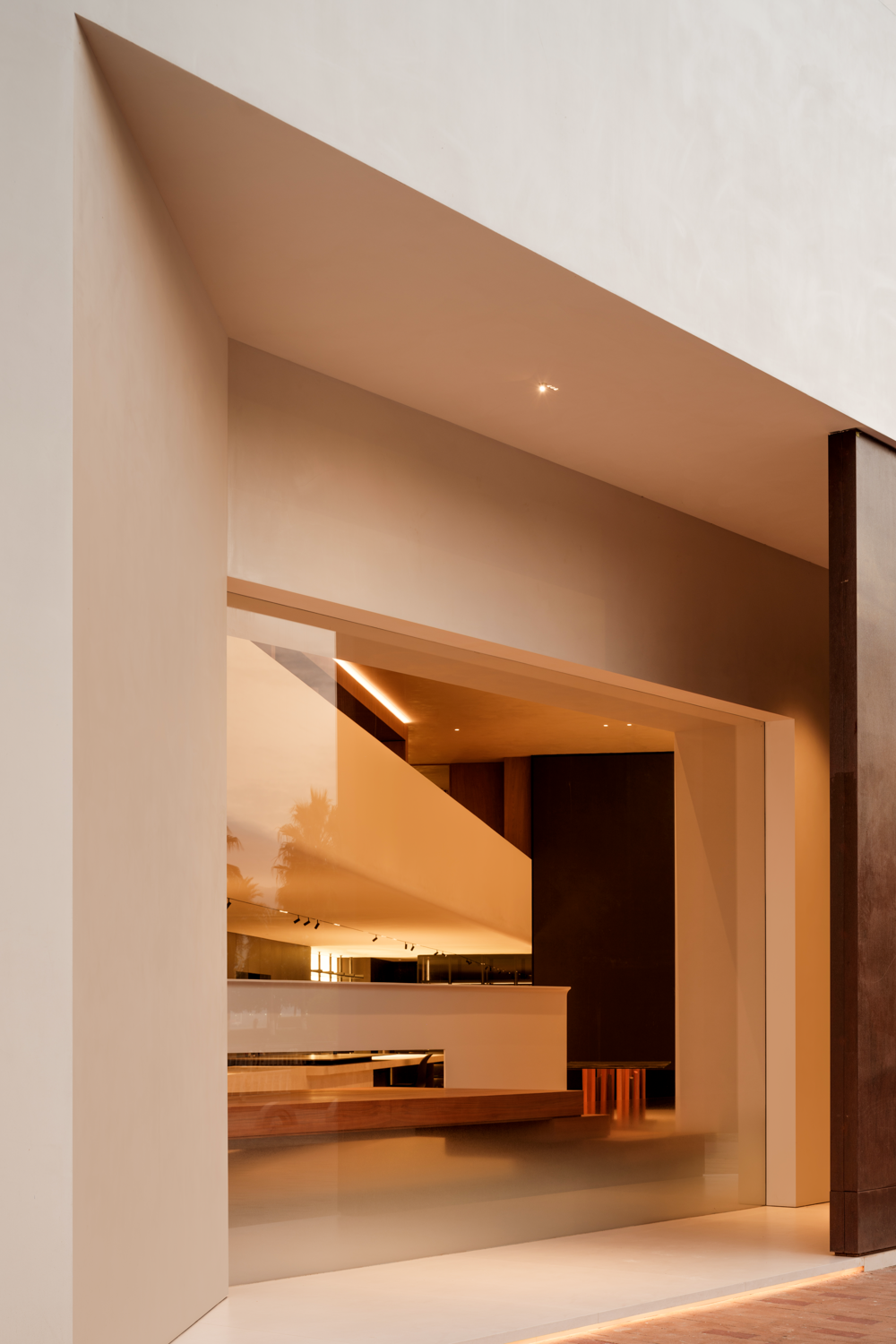 极简的艺术表达形式并不意味着随意发挥,力量与柔美的平衡考究才是设计的初衷。以大面积纯白艺术漆铺陈外立面,立体的几何形状内嵌形成主要入口,以力感十足的气势表达“简约”的理解与定位,足以引起消费者的驻足。