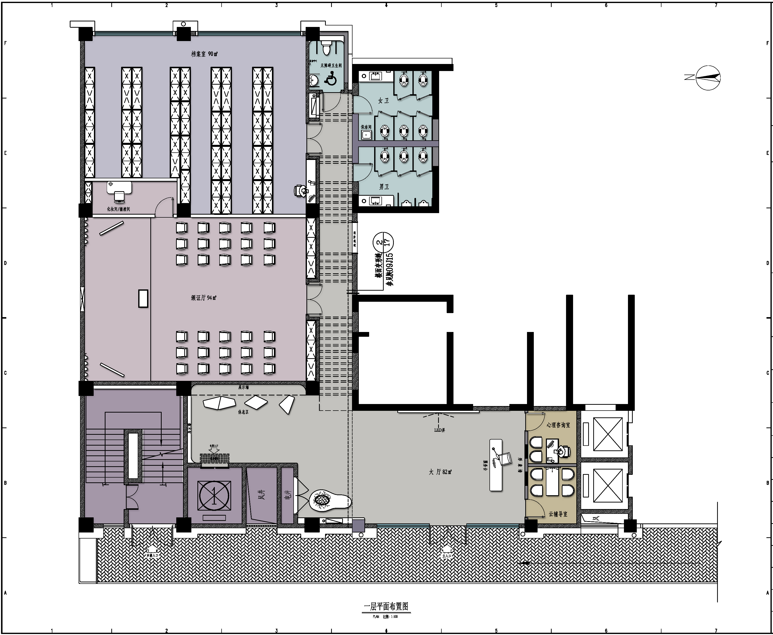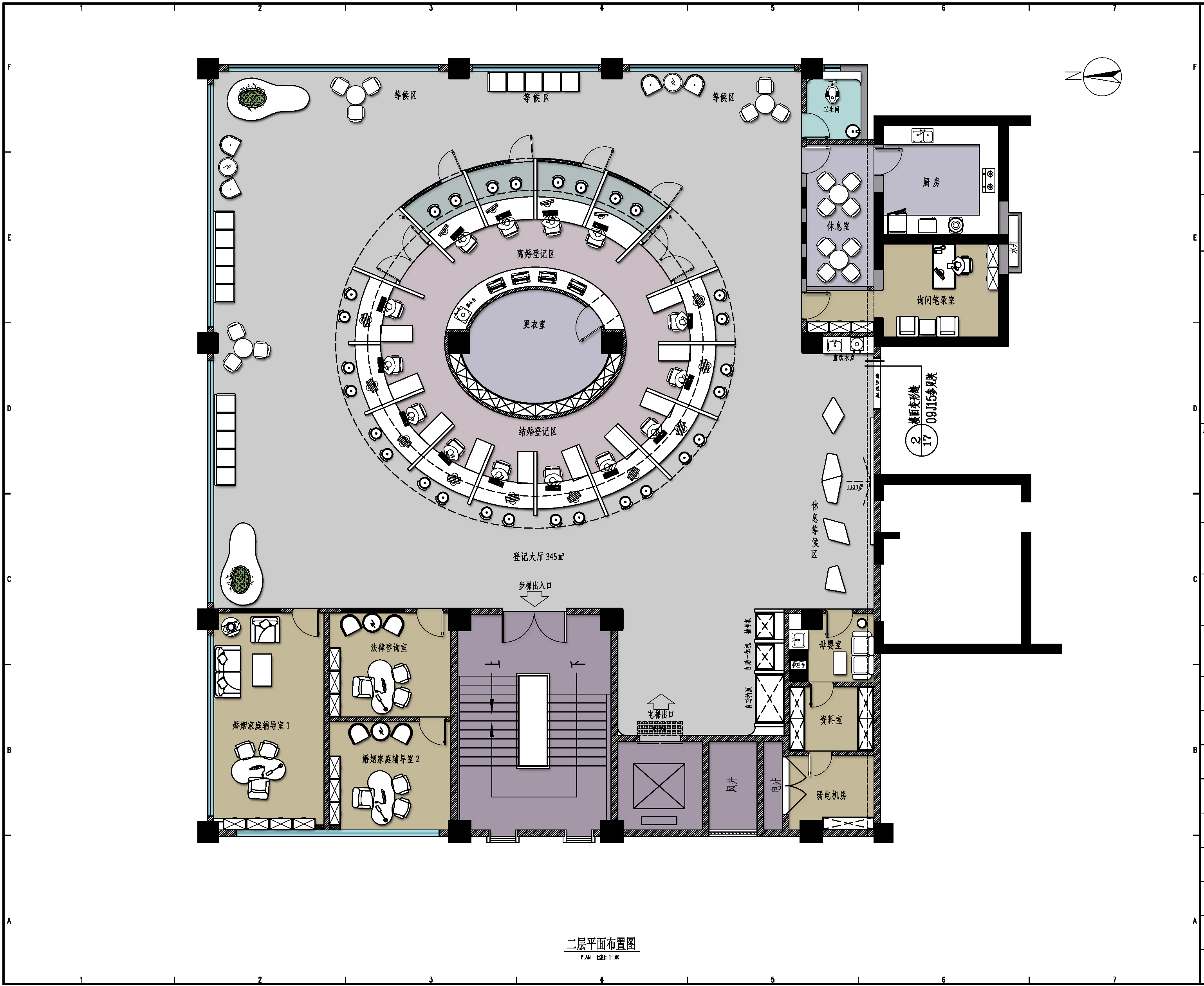空间布局:设计遵循人性化原则,满足不同需求,特别是考虑到不同文化背景和年龄段的来访者。通过精确的空间划分,确保动静分离,人流动线合理,业务办理便捷,同时保护个人隐私。