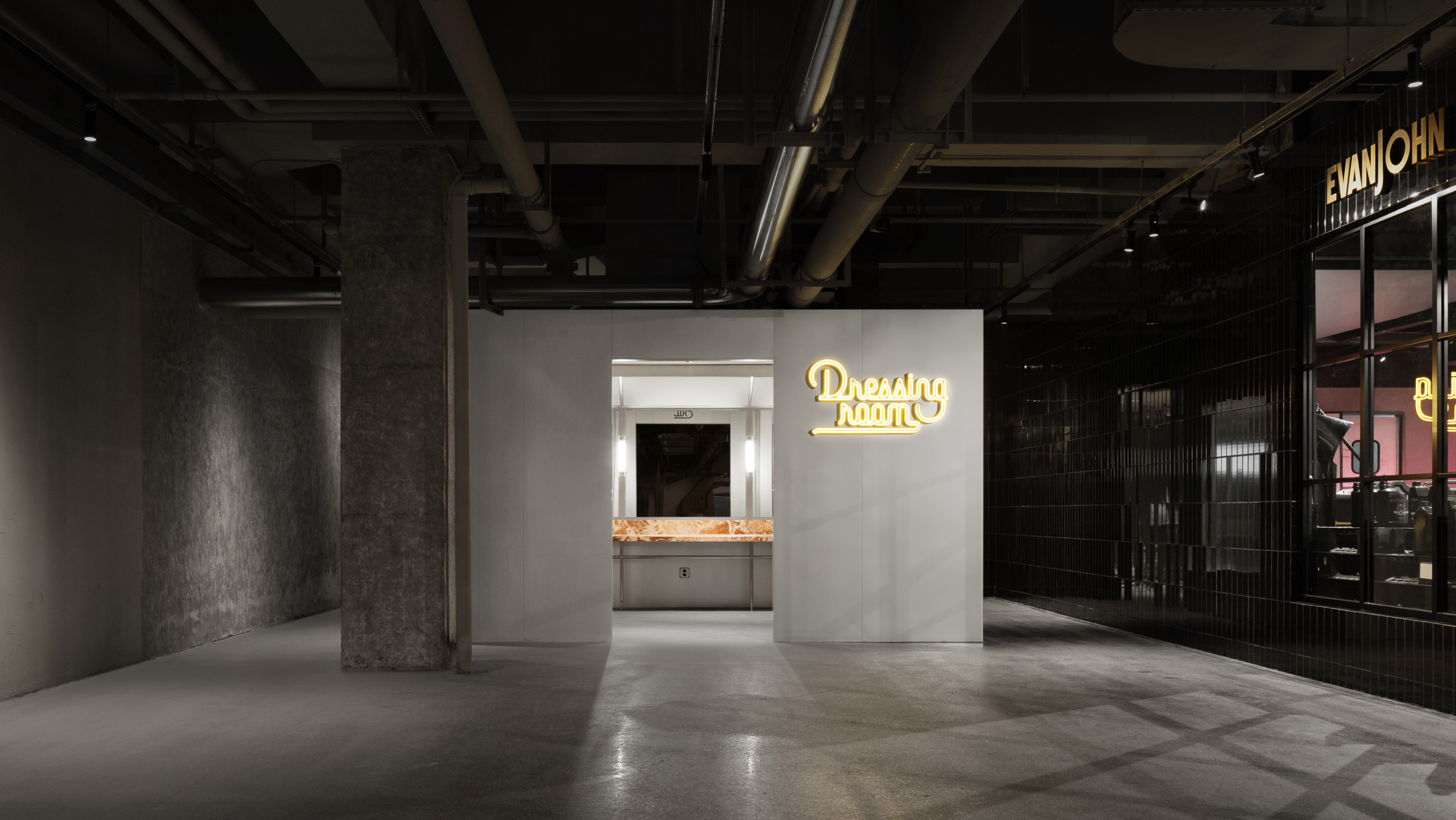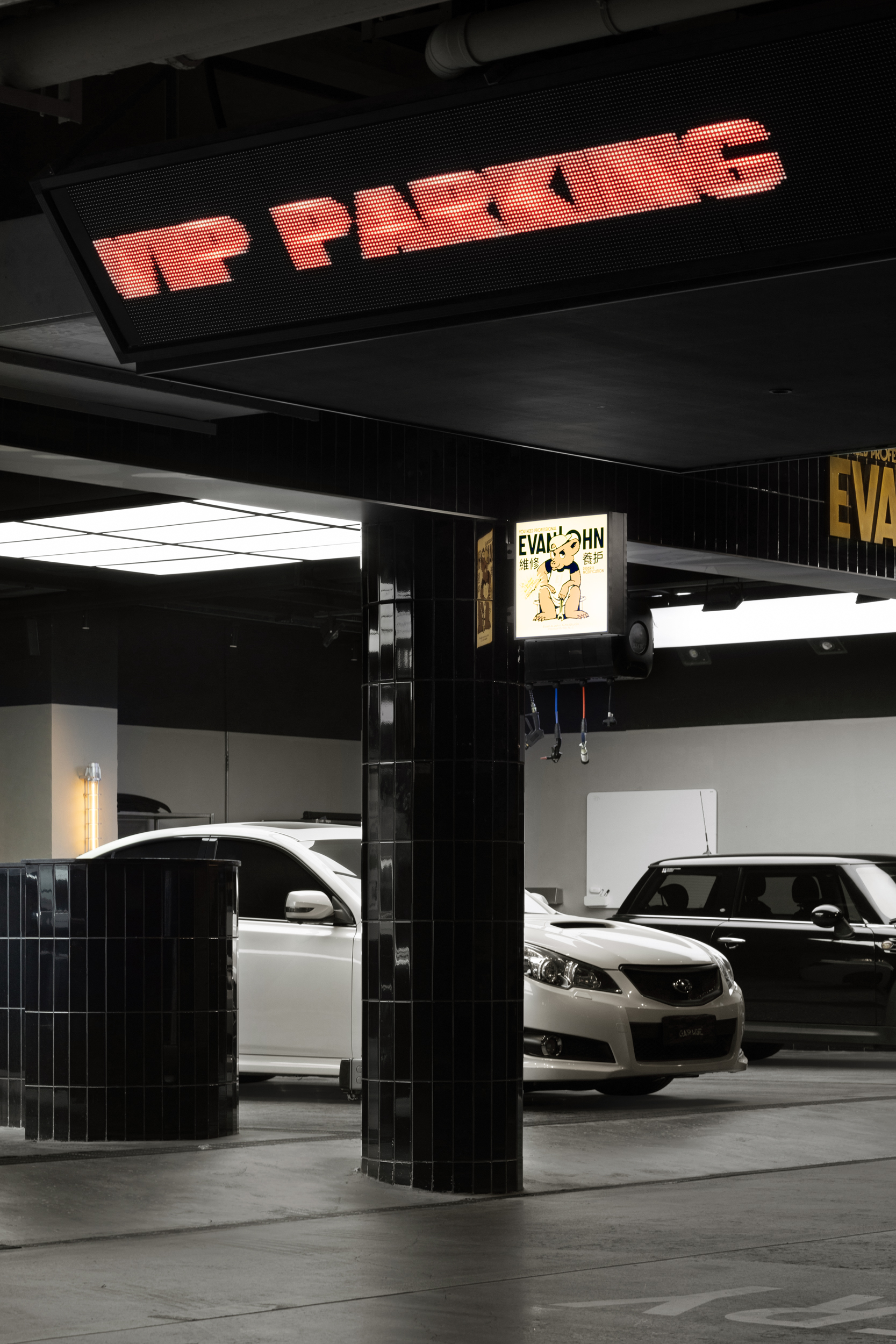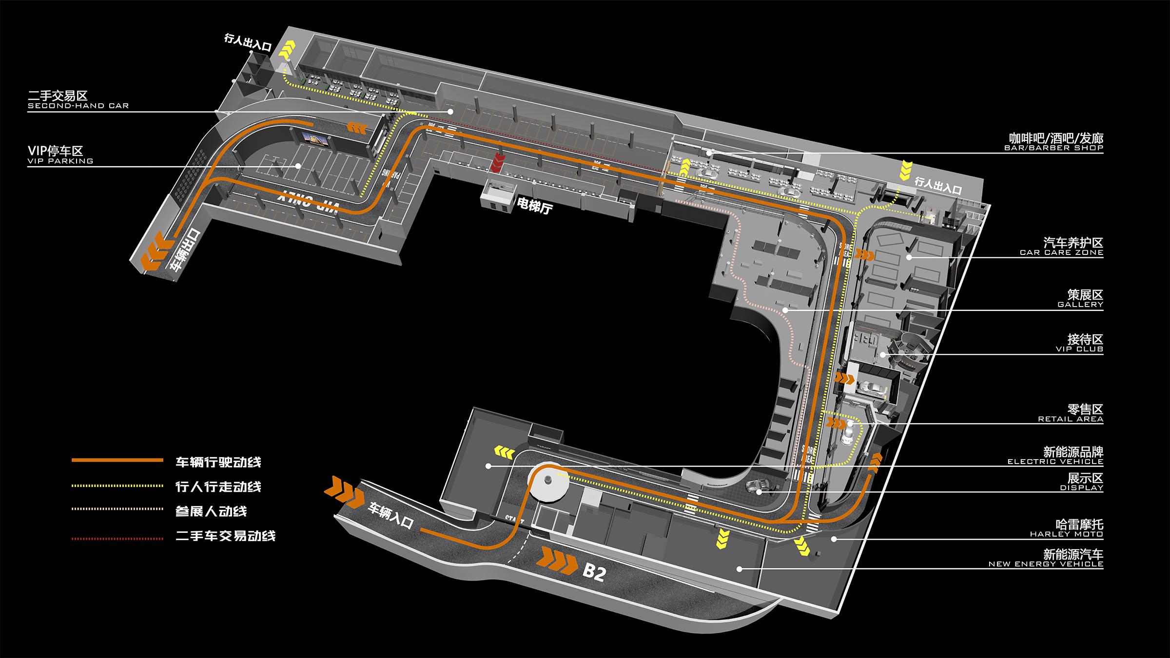 空间布局:超级车库的空间布局巧妙地分为三个层次,分别代表汽车交易员、街头车手、幕后老板三个阶层。空间中的每个区域都有明确的故事定位,增强了顾客的代入感和沉浸感。入口区域设有标志性的发光圆盘,既解决了原始柱子问题,又带来强烈的视觉冲击。空间规划以未来感与复古感的双重对比为核心,配合功能性强的展示与互动空间,让每个顾客都能体验到与汽车文化相关的多重场景。