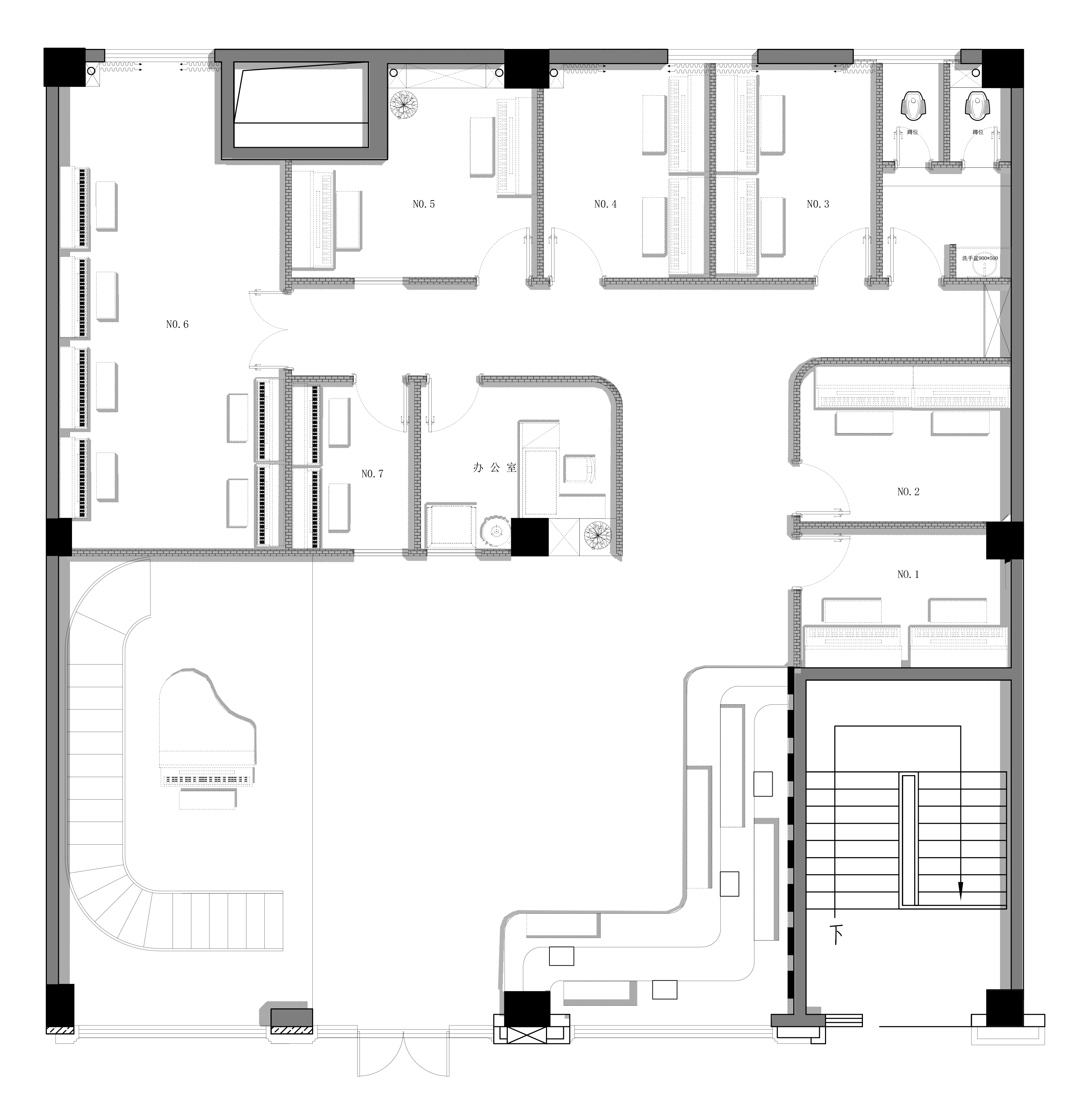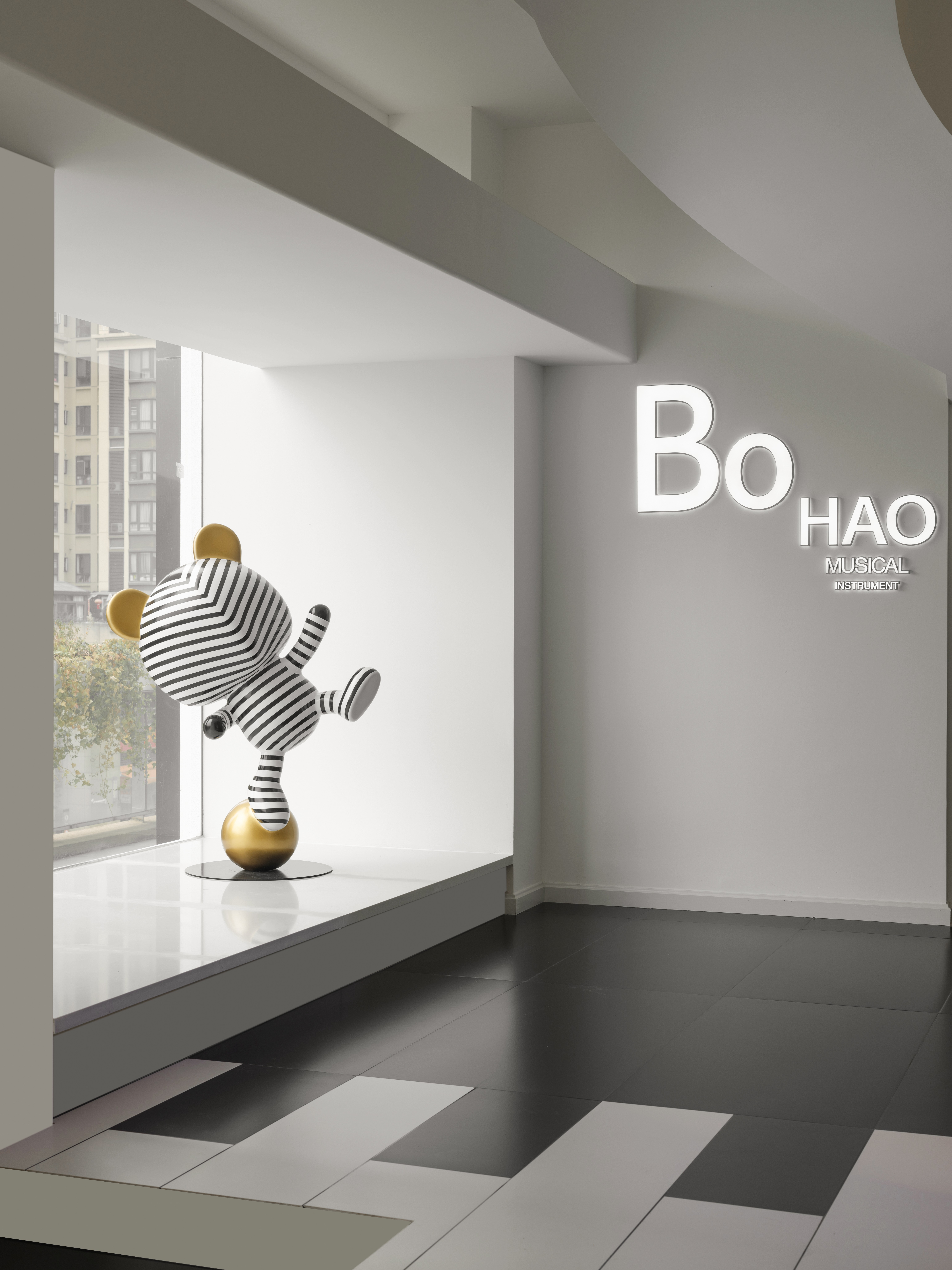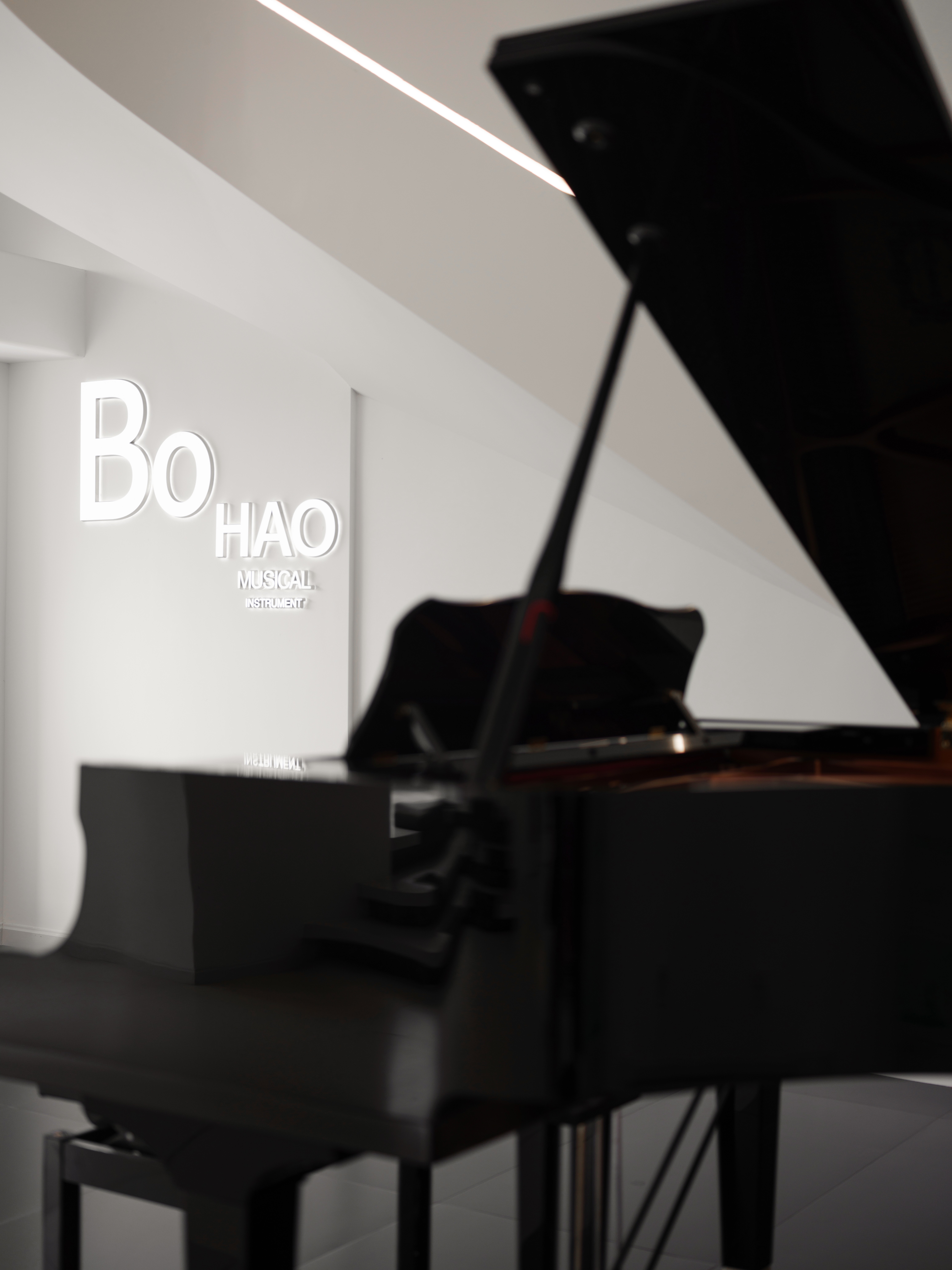 空间布局:通透的大面积自然采光,构出一个丰富想象力的演奏舞台。从外部充分展示出演奏的力量。脱离了普通教培机构的刻板空间规划,接待与签到在办公室与办公室完成,整个厅为孩子和家长提供了宽松的尺度动线。