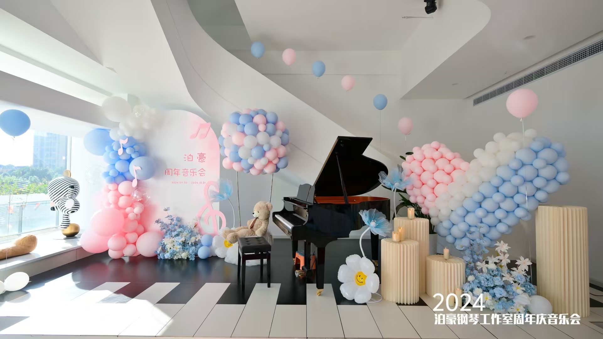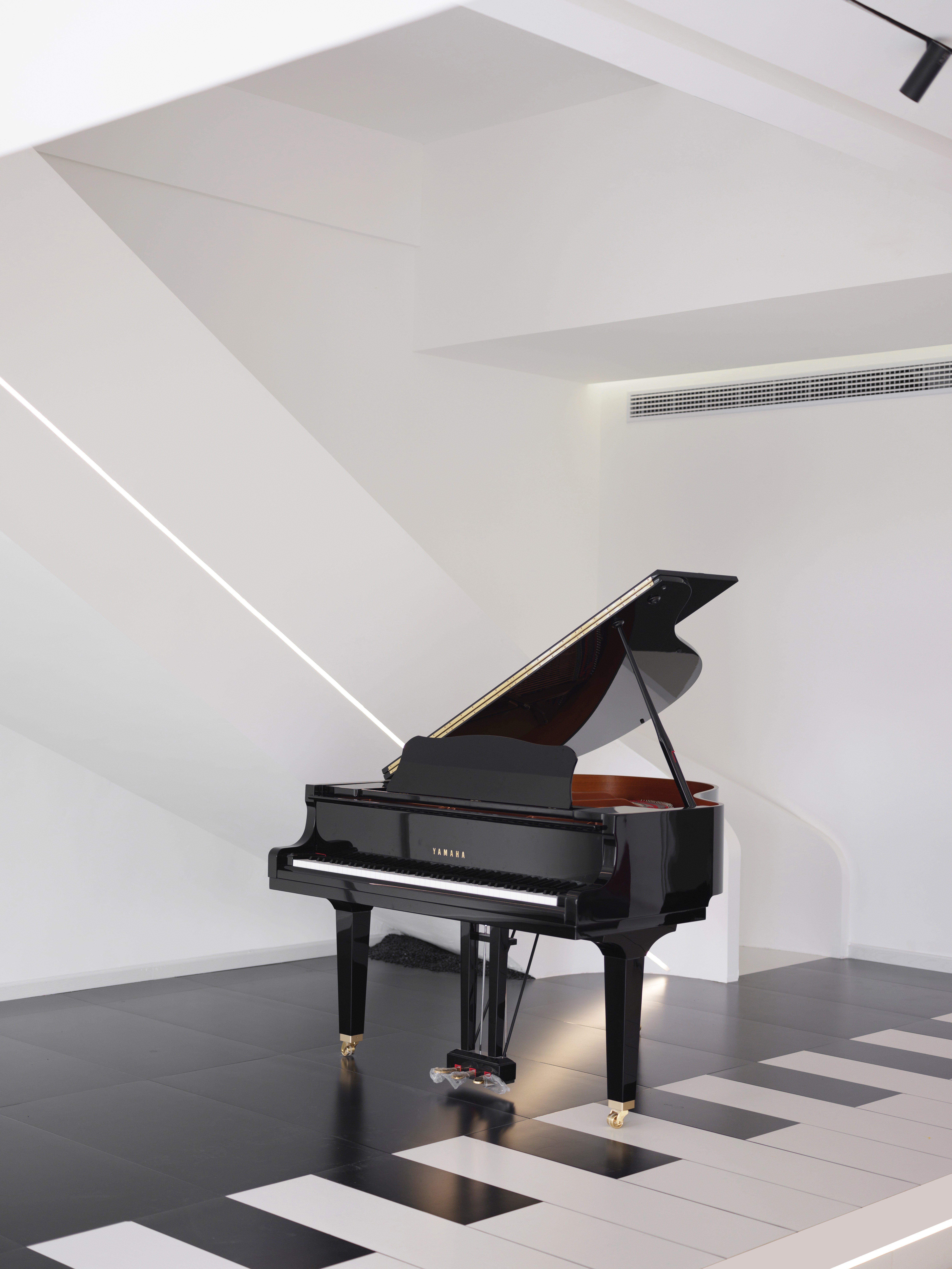 舞台地面采用黑白色瓷砖,让空间的氛围更能容易钢琴氛围