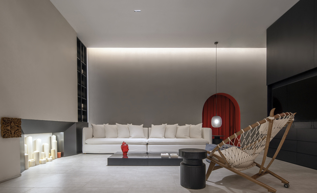 顶面是由三个空间组成,舞台的顶面与楼梯结合形成一个椭圆形的顶部,所以观众席也做了同样大小的形状,中间平顶,让空间的顶部完整且有层次