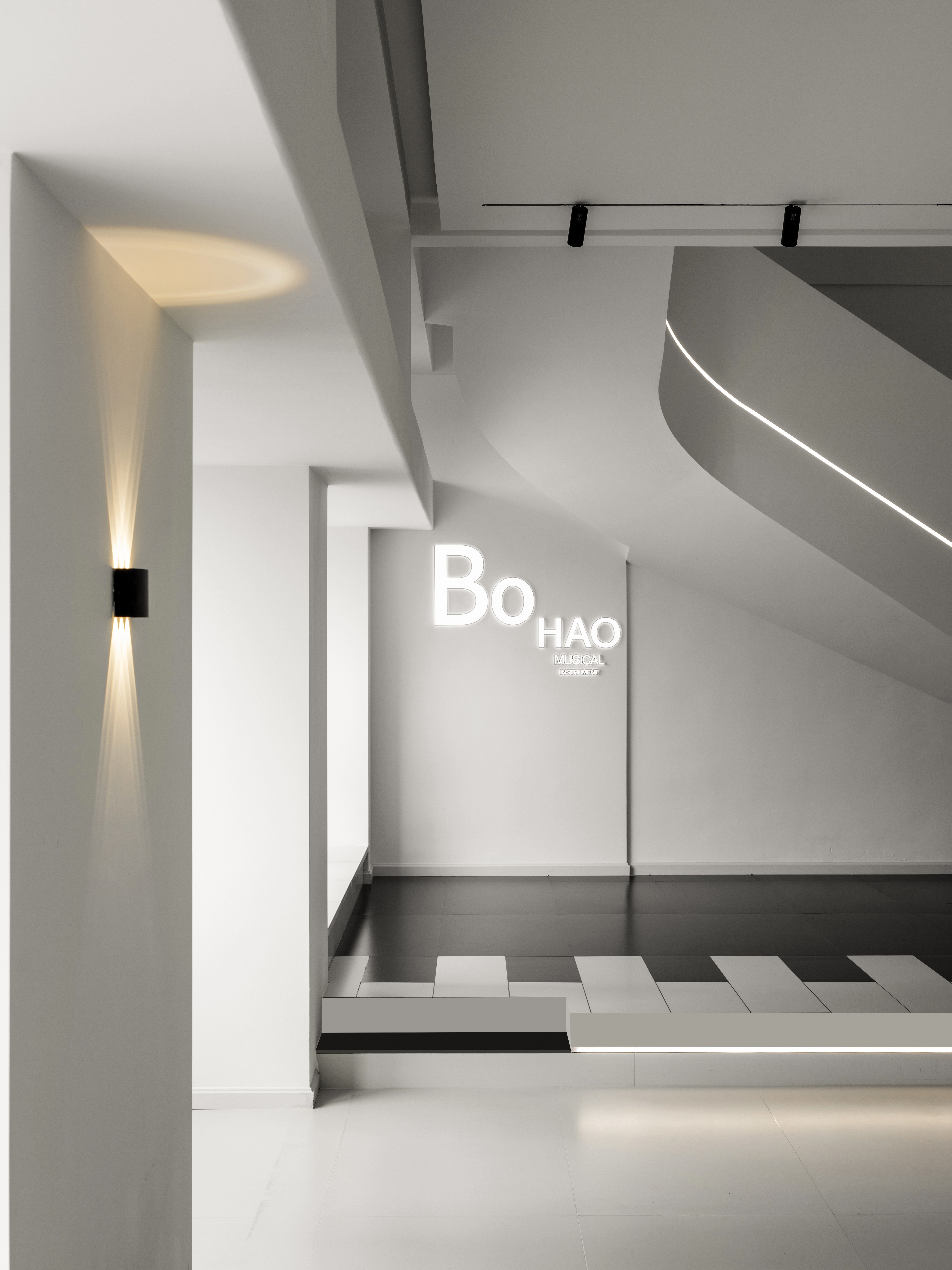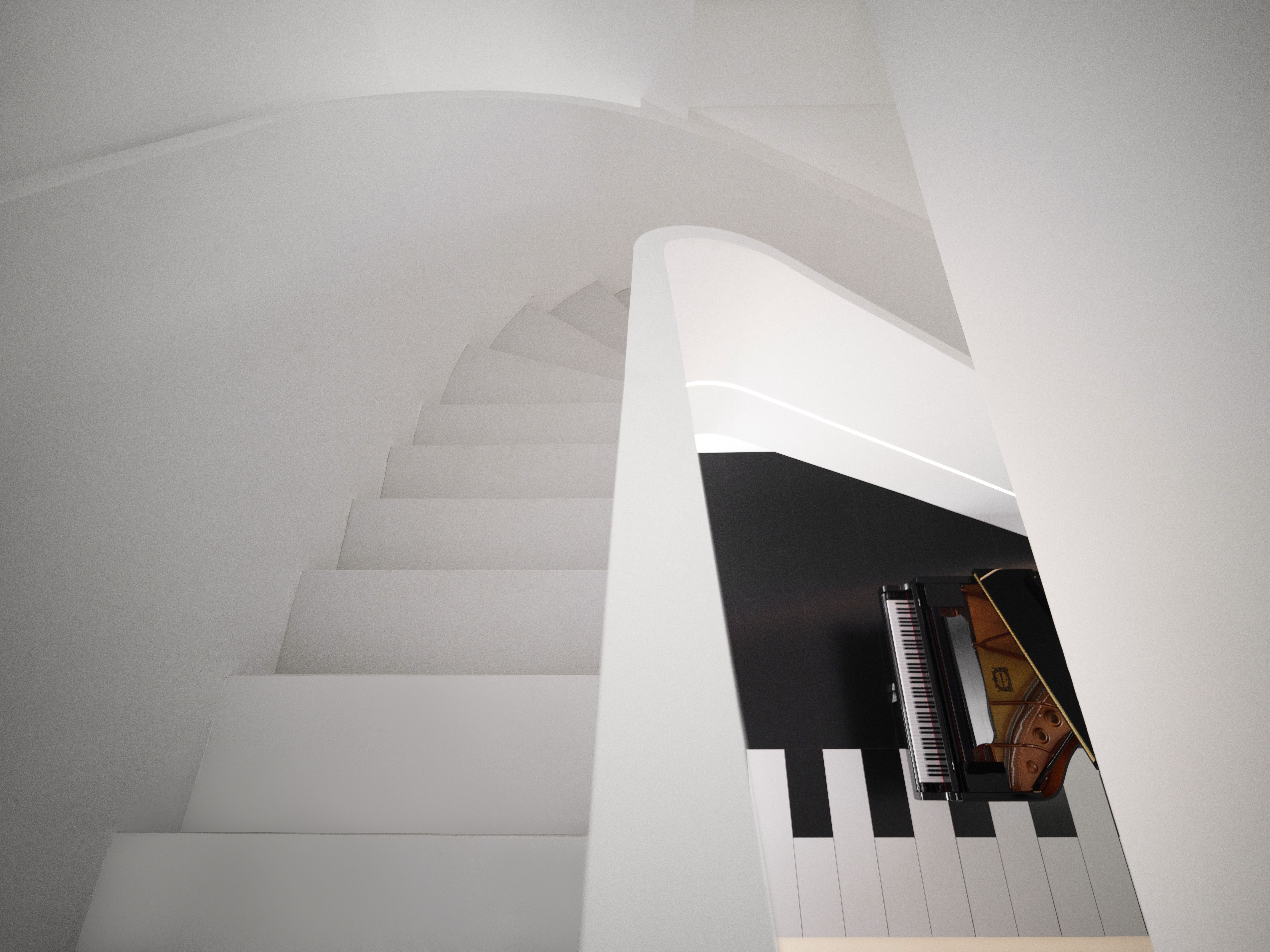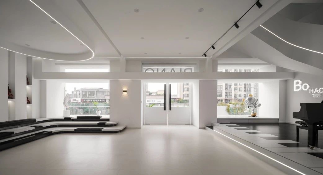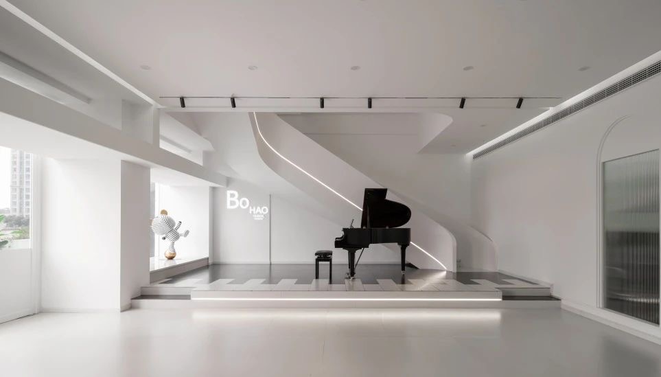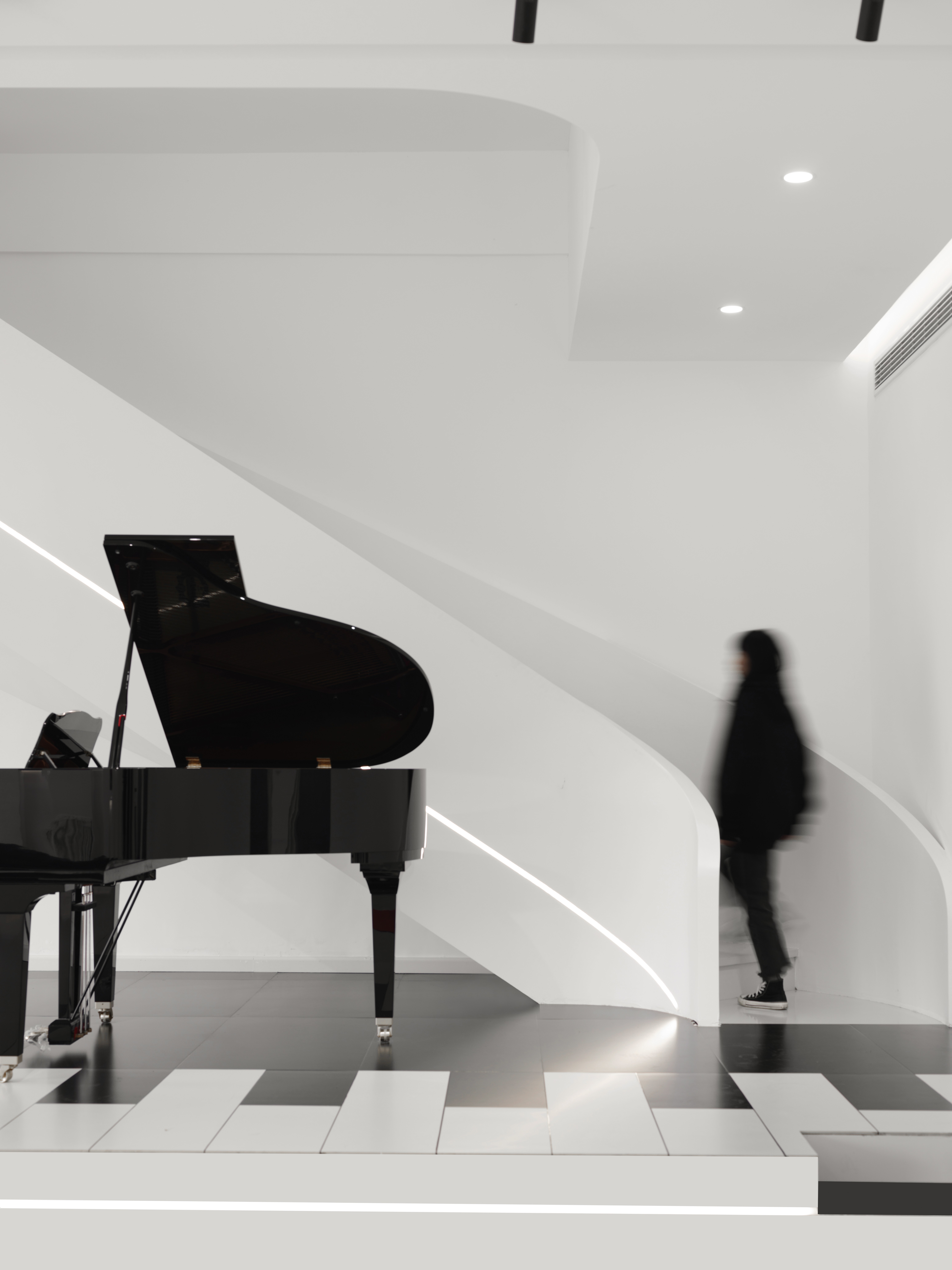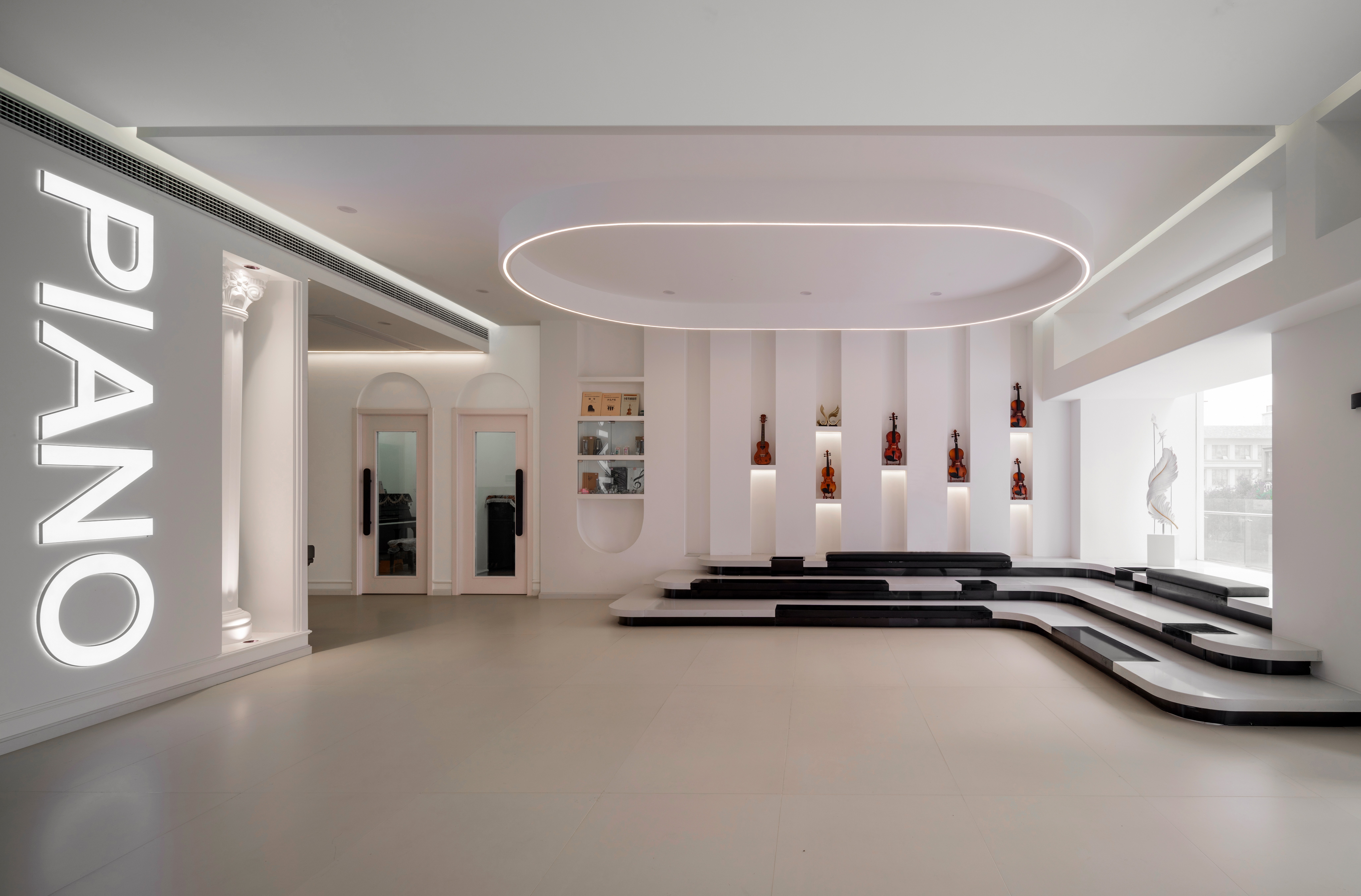 空间意境:音乐厅以钢琴黑白琴键主导了空间色和序列构成,结合楼梯流线在演奏台中间,成全了舞台构图层次及动态条件。空间没有使用多余的装饰,没有童稚化空间色彩,开阔的空间内,宽敞明亮干净,光线成为一大核心。大面积白色块面纵横联系,简洁的处理弱化了留白的空旷,使得空间有更大的包容性,大厅和办公室内共享了主理人喜爱的经典法式点缀,从全新角度出发定义教育培训空间。