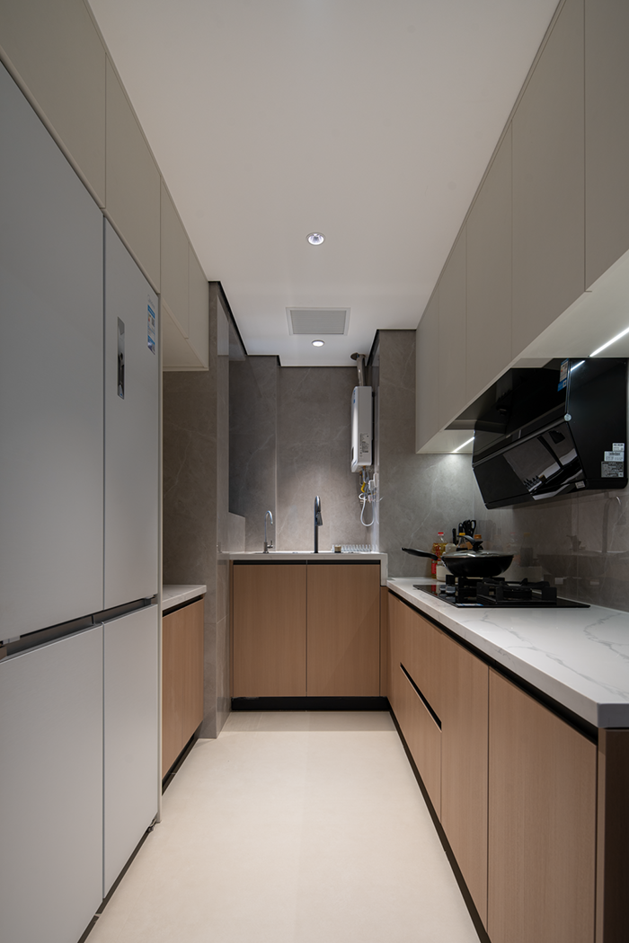 厨房洗菜和操作台面是根据男女主人的身高量身定制,男主人较高180+,女主人150+,男主人负责洗菜洗碗,女主人负责炒菜,台面根据其具体情况来定制。 -