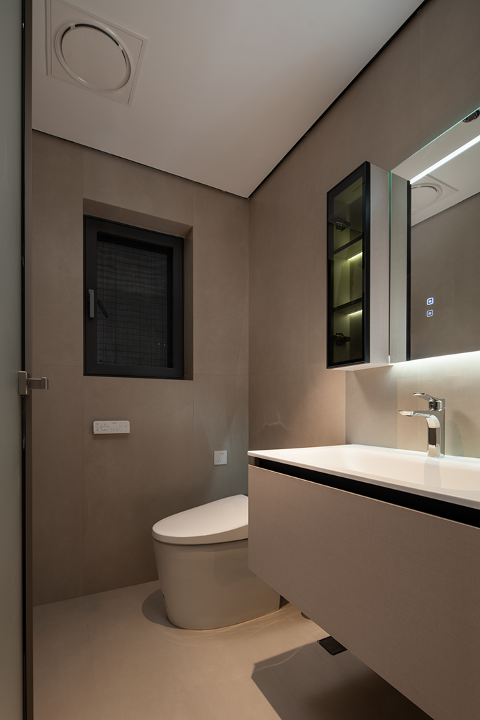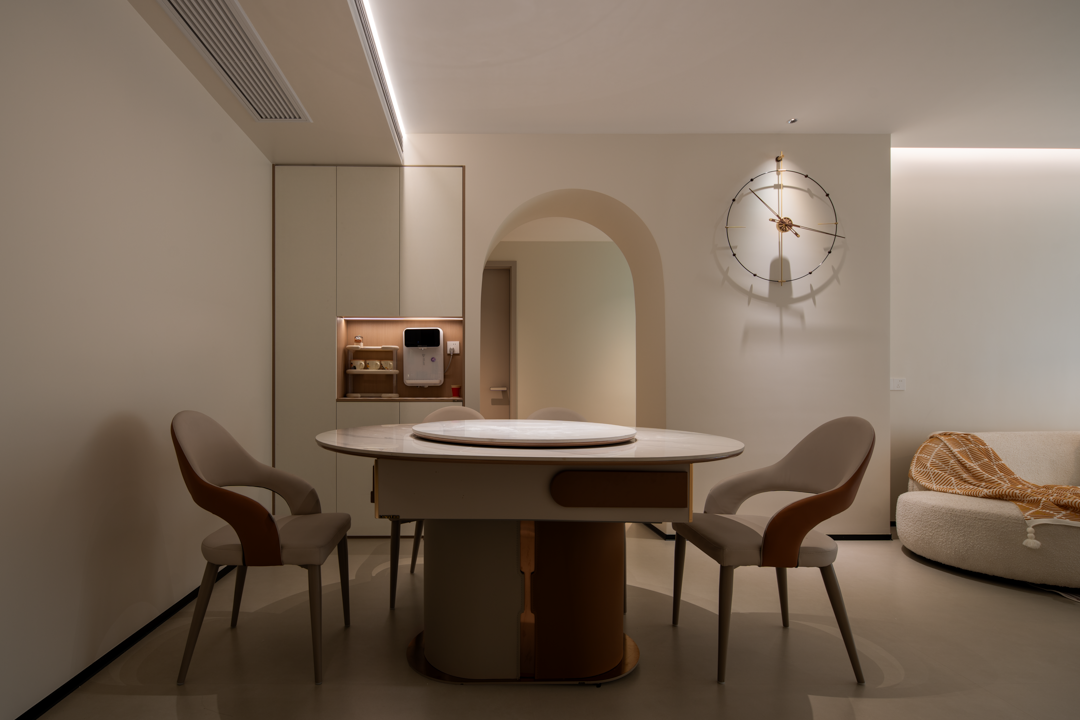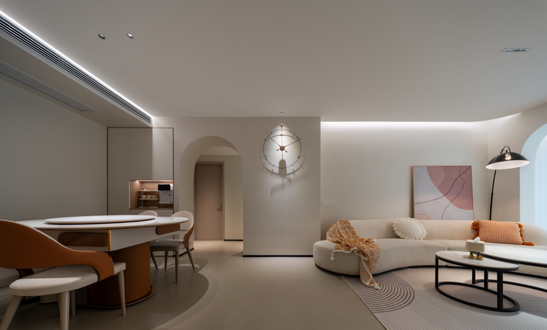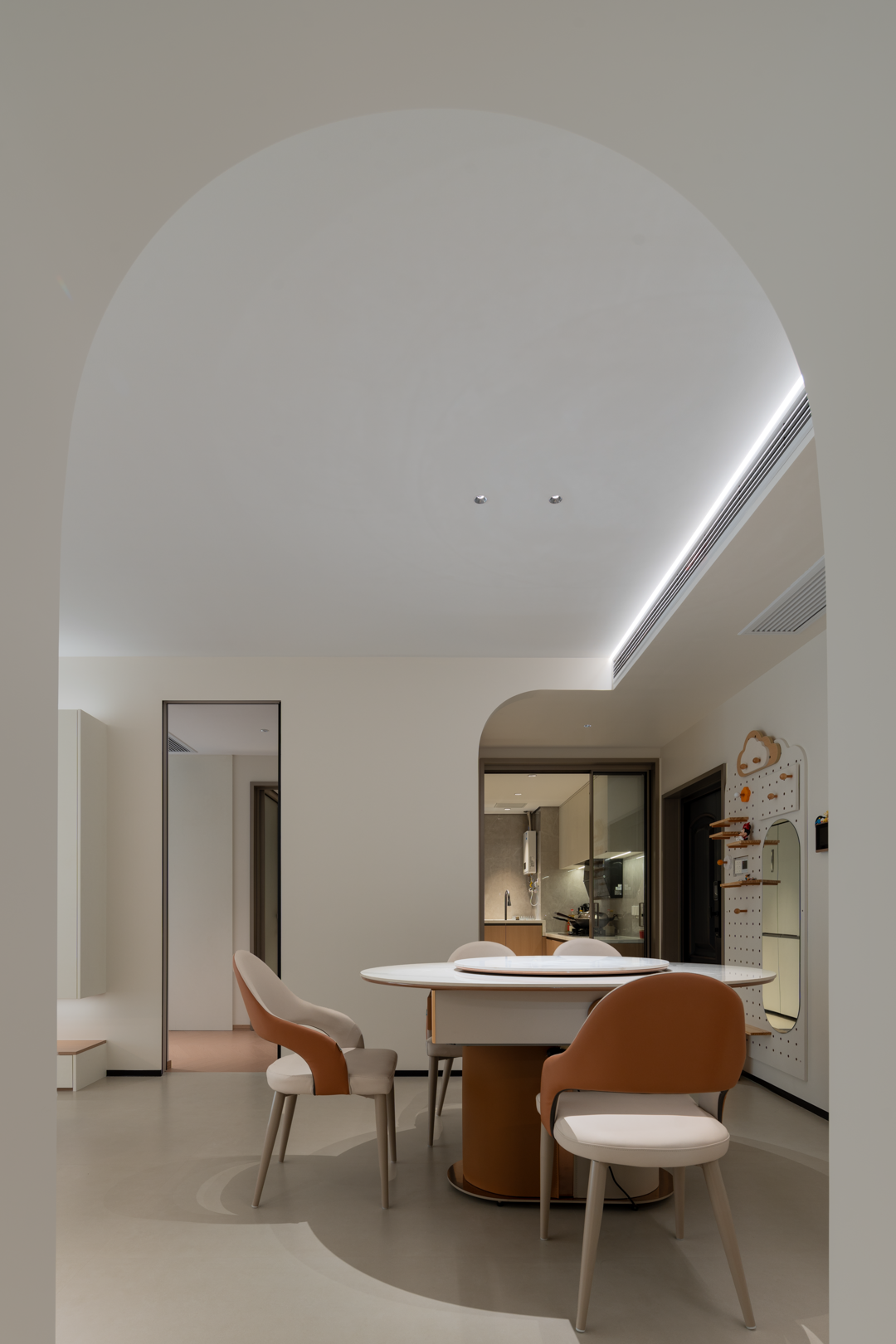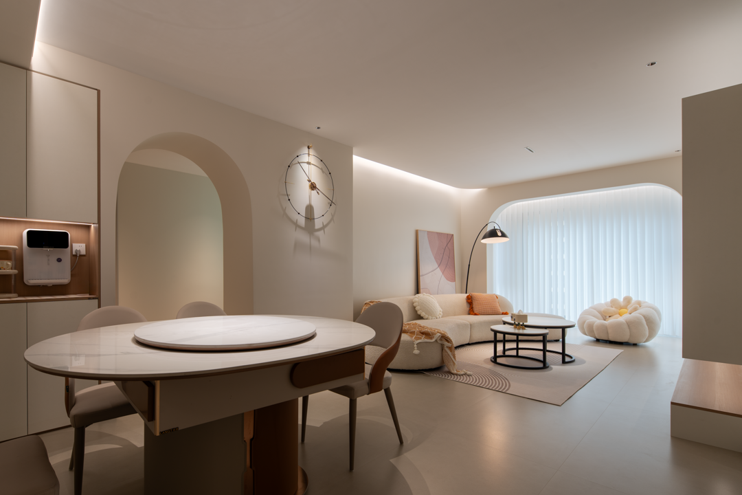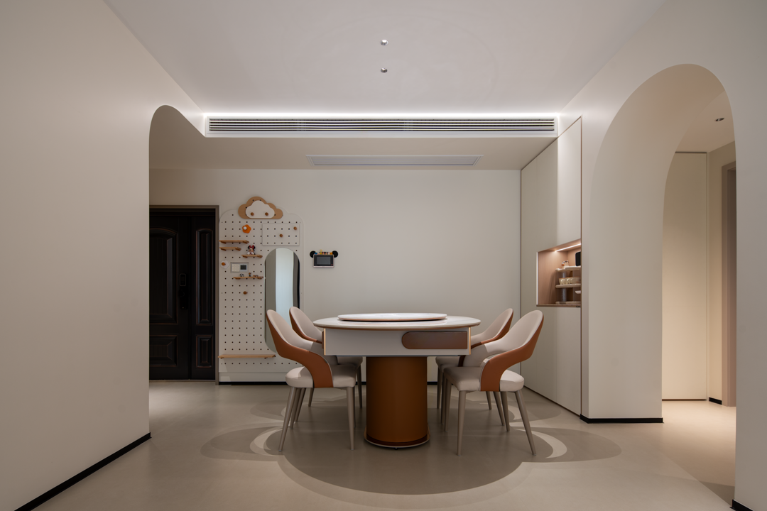 2.全开放式的客餐厅布局,极大地延伸了视线,给人通透、开阔之感。设计师为了使公区能充分得到利用,更改门厅位置,将其改造成过道式卫生间,使客餐厅一眼望去拥有奶呼呼的质感,满眼都是温柔治愈。