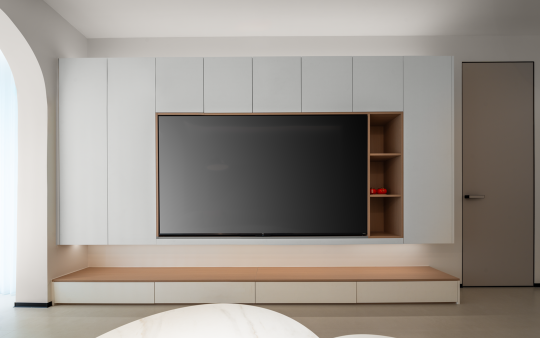 空间布局:1.入户设计玄关。进门左手边墙壁加入洞洞板和镜子,不仅为日常生活带来便利性,同时也使玄关更具设计与艺术性。对门打造通顶柜,悬浮柜体设计,视觉上更轻盈的同时更具氛围感。