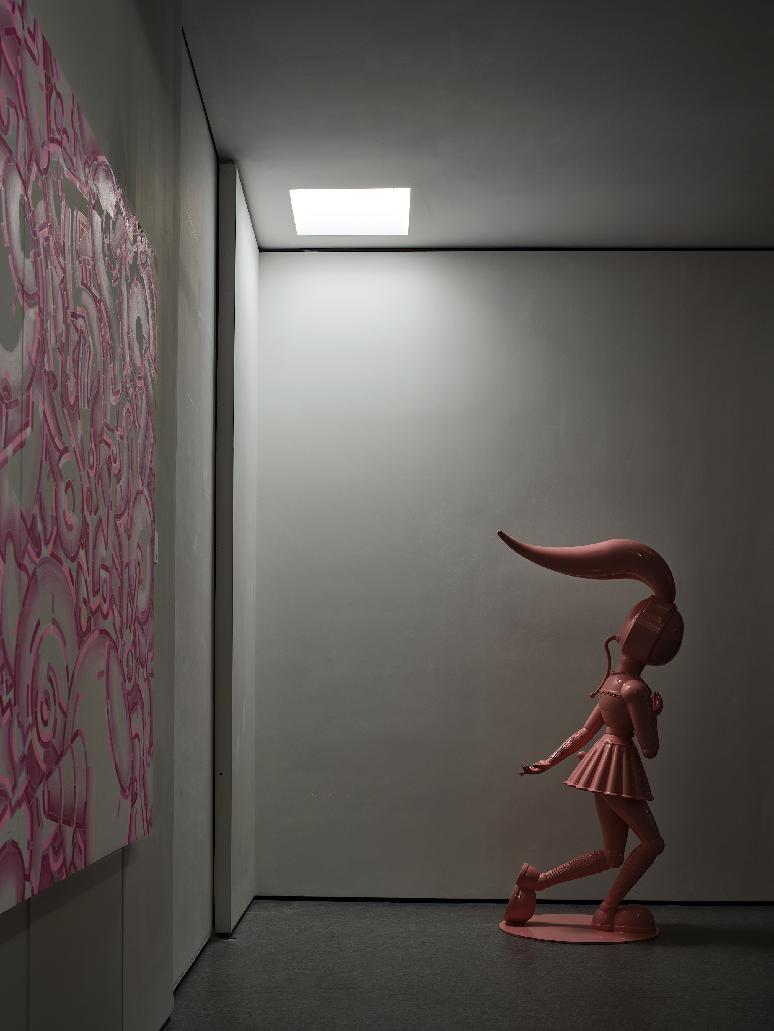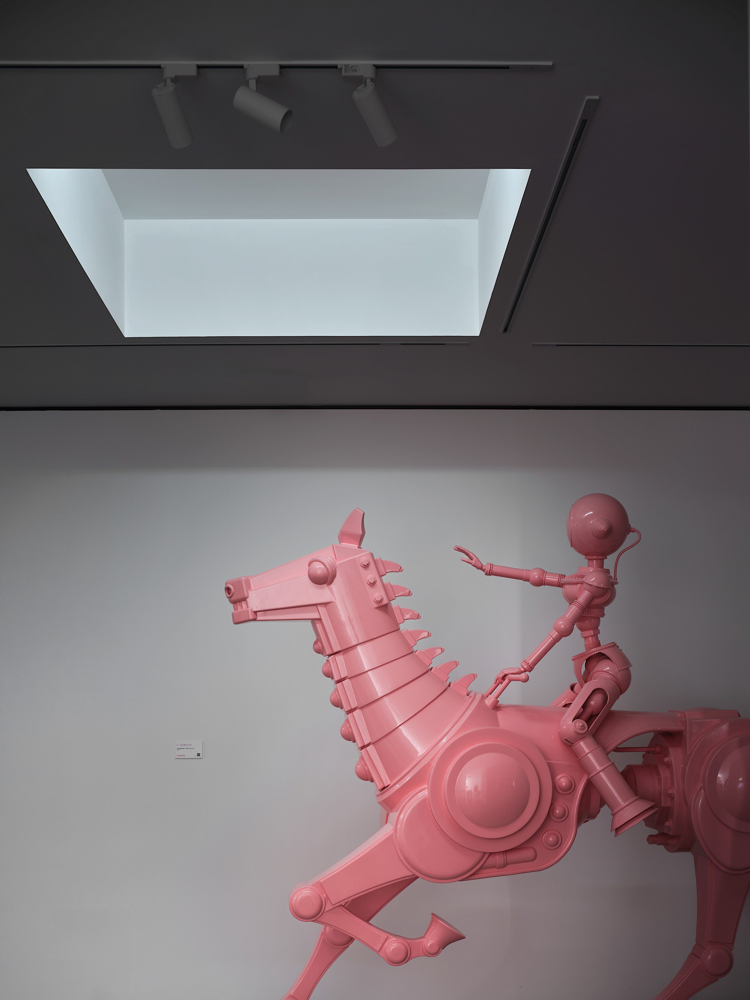 以建筑为载体,使用简洁的线条和几何形状,大面积的玻璃幕墙和混凝土结构营造出一种开放、通透的视觉效果。金属雕塑和不锈钢装饰细节不仅提升了视觉上的质感,还增加了空间的层次感和艺术性,使整体设计更具现代感和未来感。入口处采用了开放式设计,增强了空间的连续性和流动性。