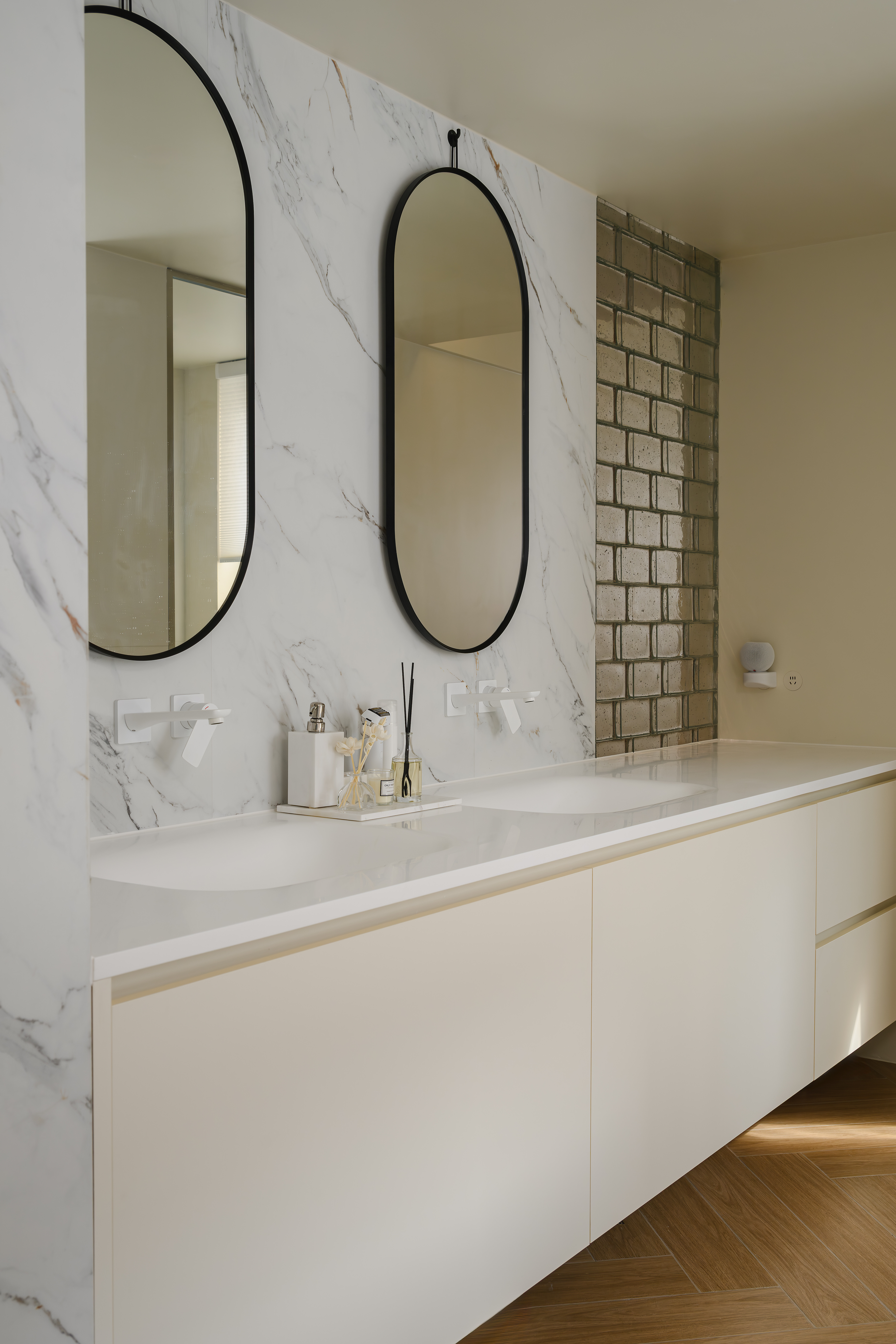 主卫采用干湿分离设计,双台盆设计让洗漱更高效。玻璃砖作为了主卫双台盆岩板墙的衍生,光影效果绝美,空间氛围感瞬间拉满!
