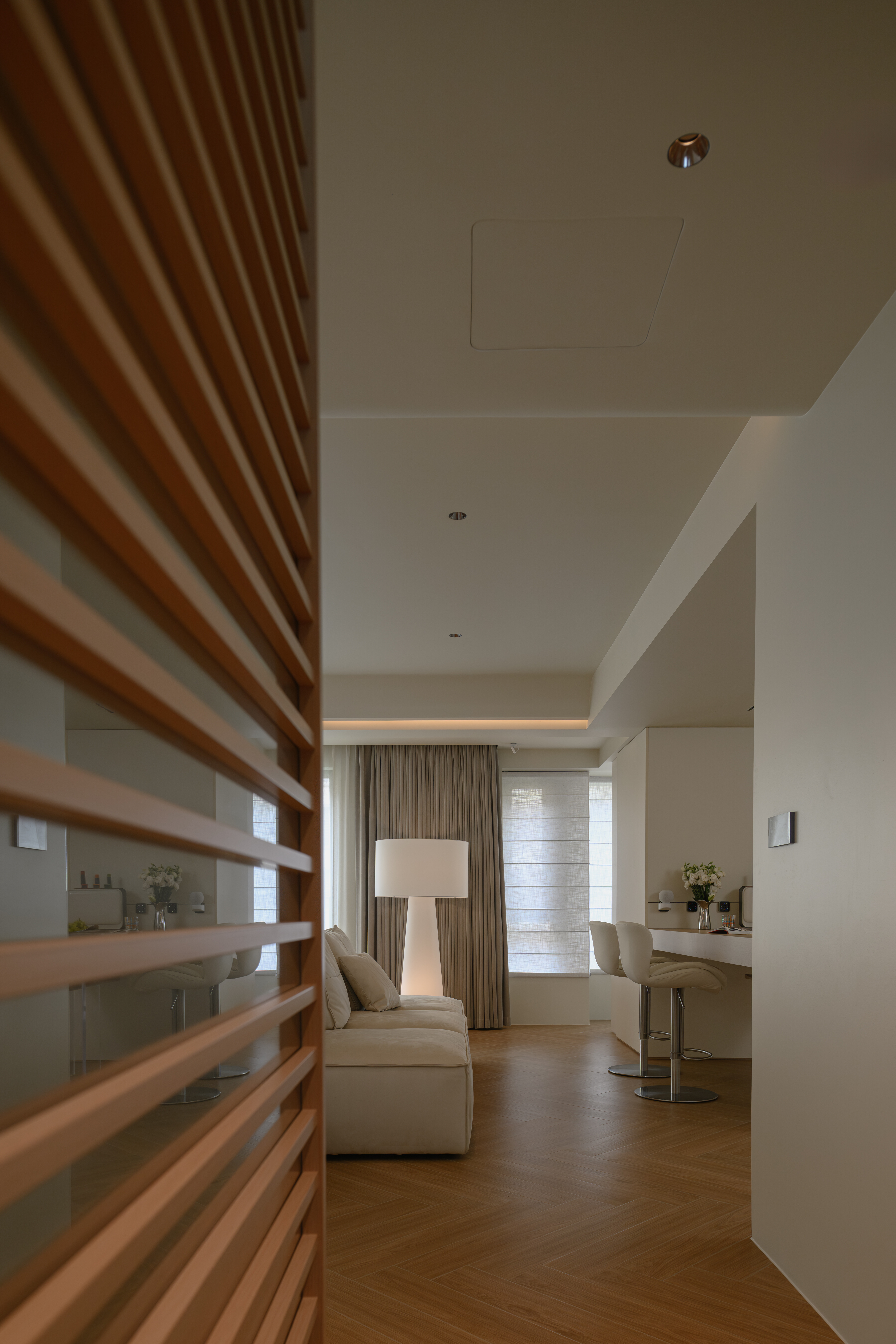 我们打通了家中不必要的隔墙,让空间变得开阔而通透。三扇滑门的巧妙运用,让空间功能随心切换。滑门关上后,瞬间变身高效工作室;另一扇滑门后则成为亲友相聚的理想之地,与客卫相连,闭合时可形成独立套间。