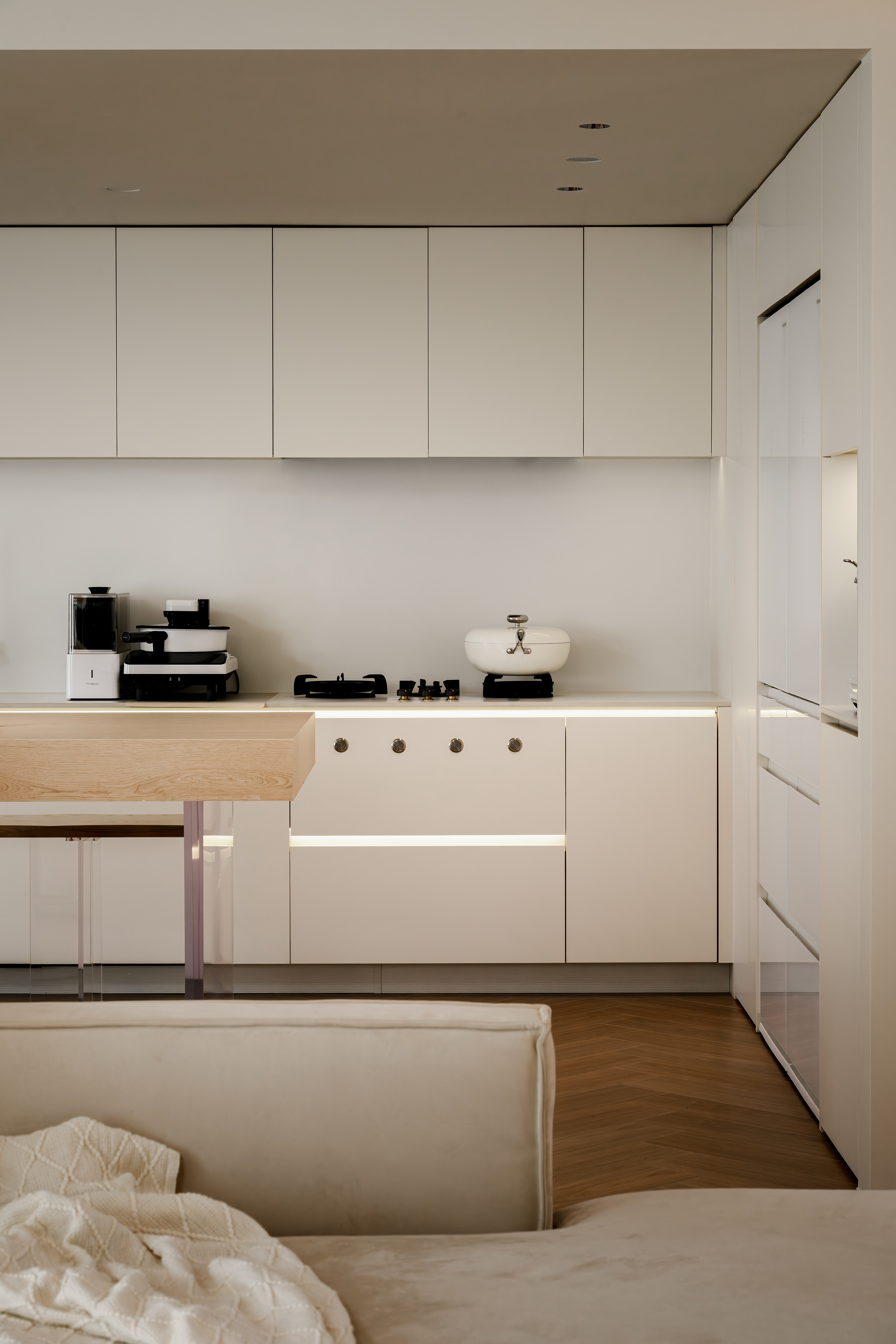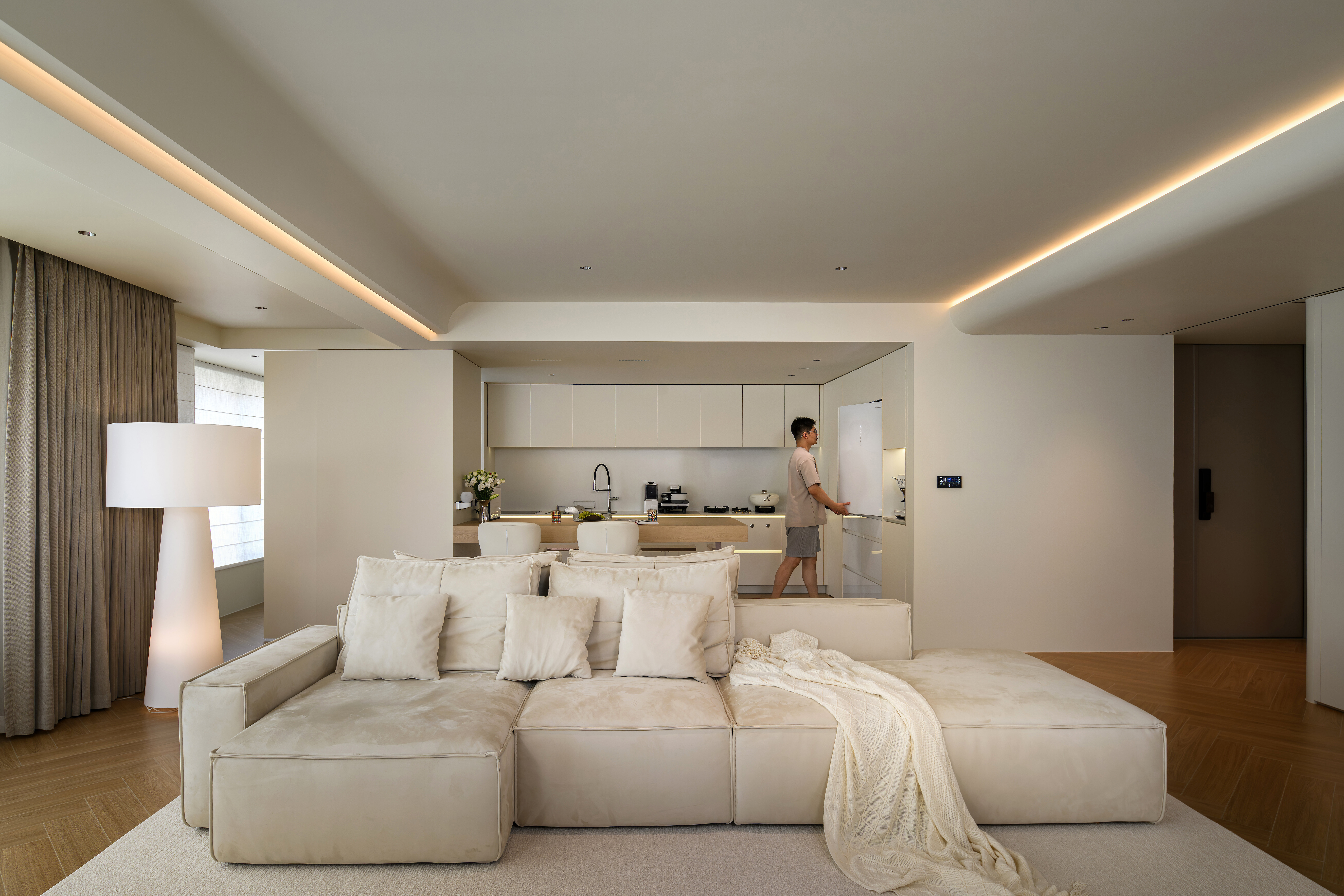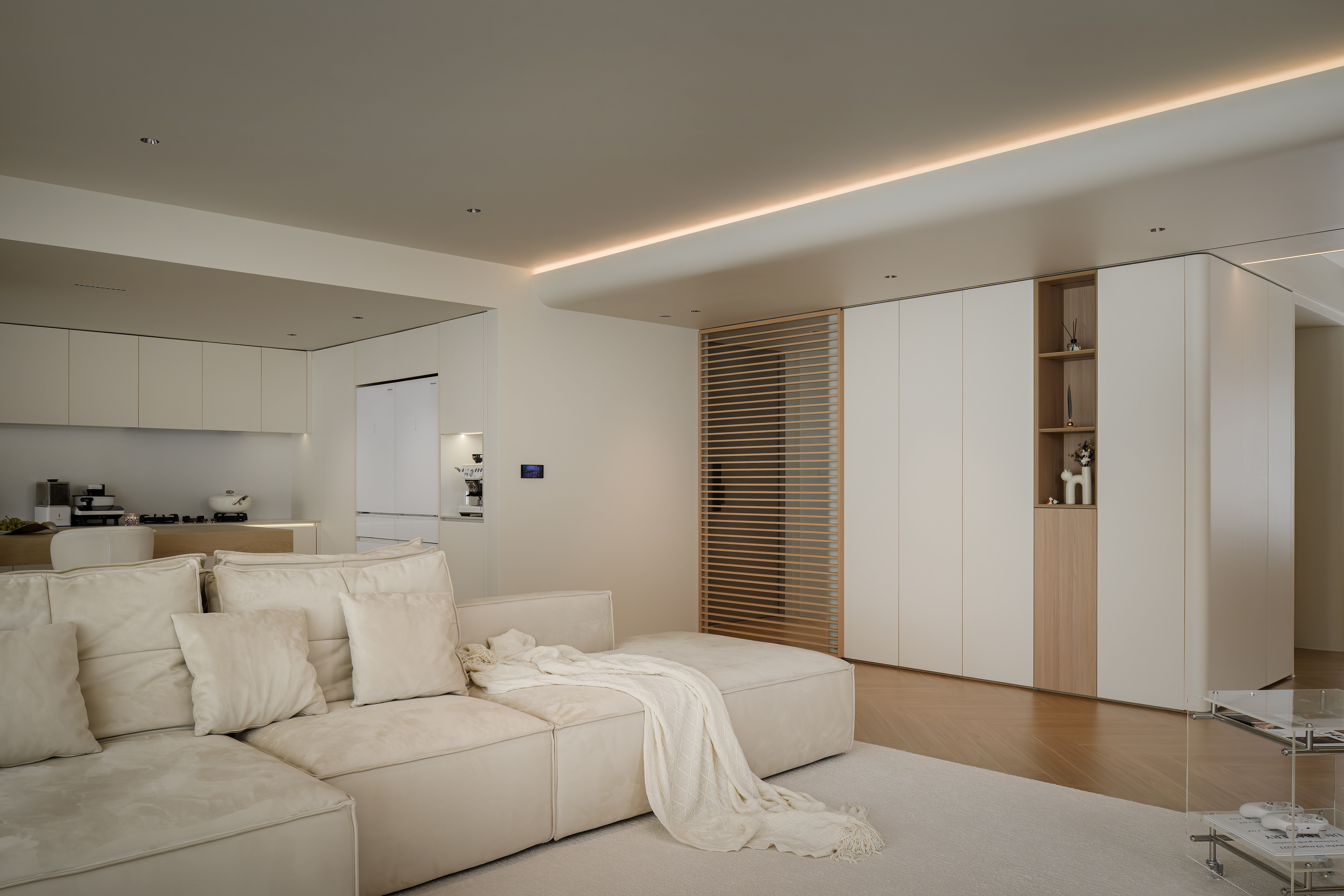 客餐厨一体化设计不仅空间开阔明亮,还能增进家人之间的互动。客厅做无主灯设计,隐藏式灯带作为辅助光源,满足不同场景的要求,给予生活满满的氛围感。