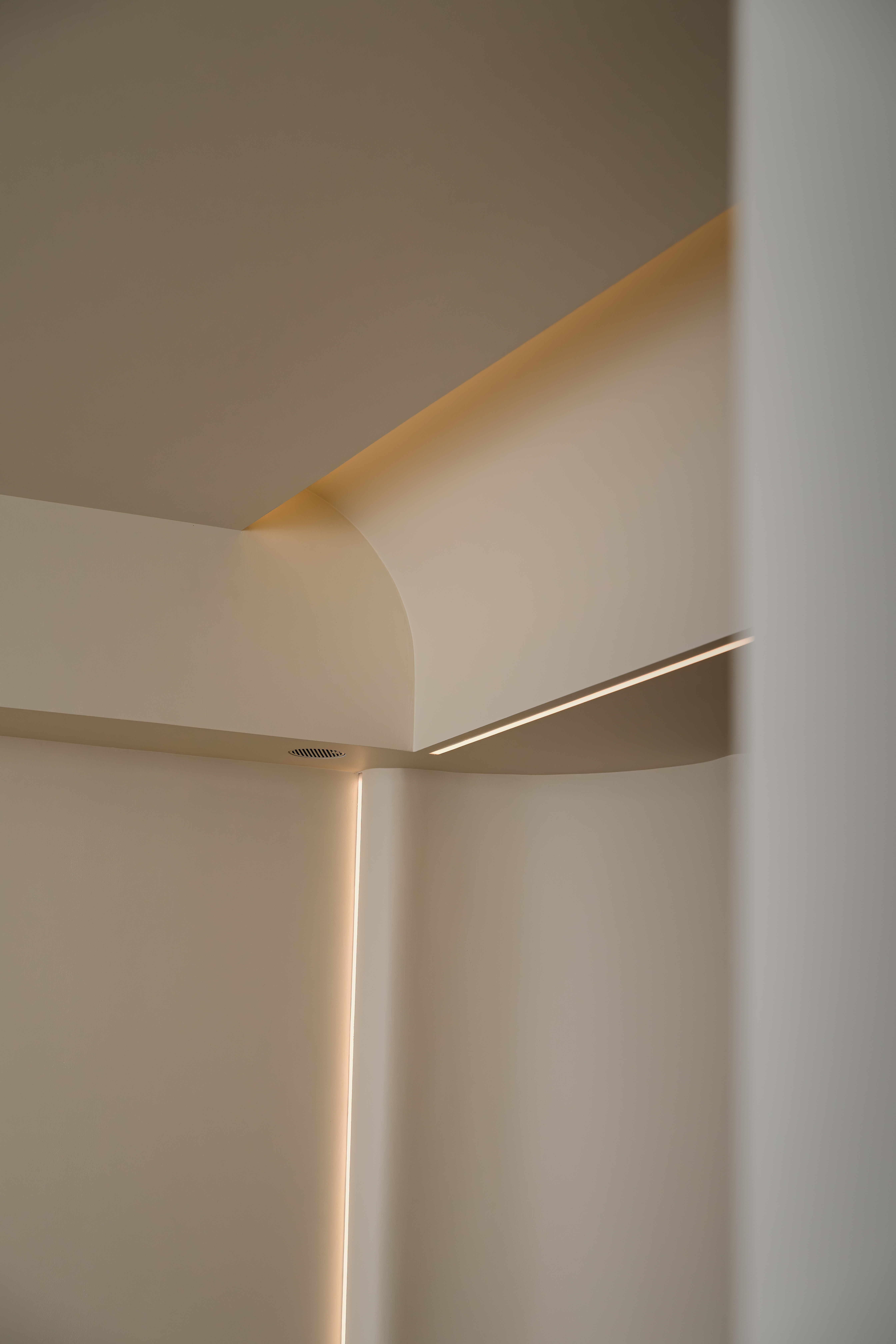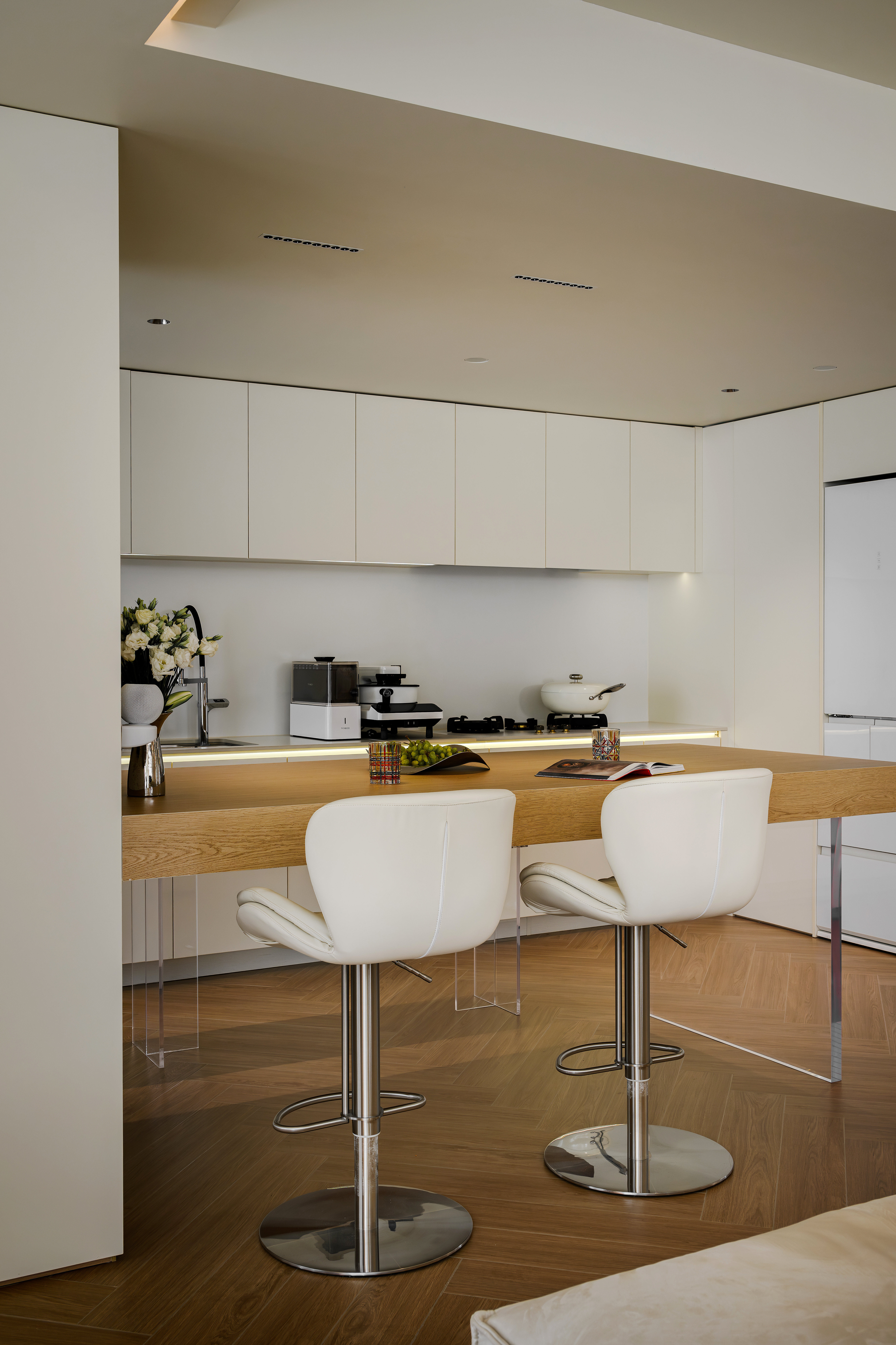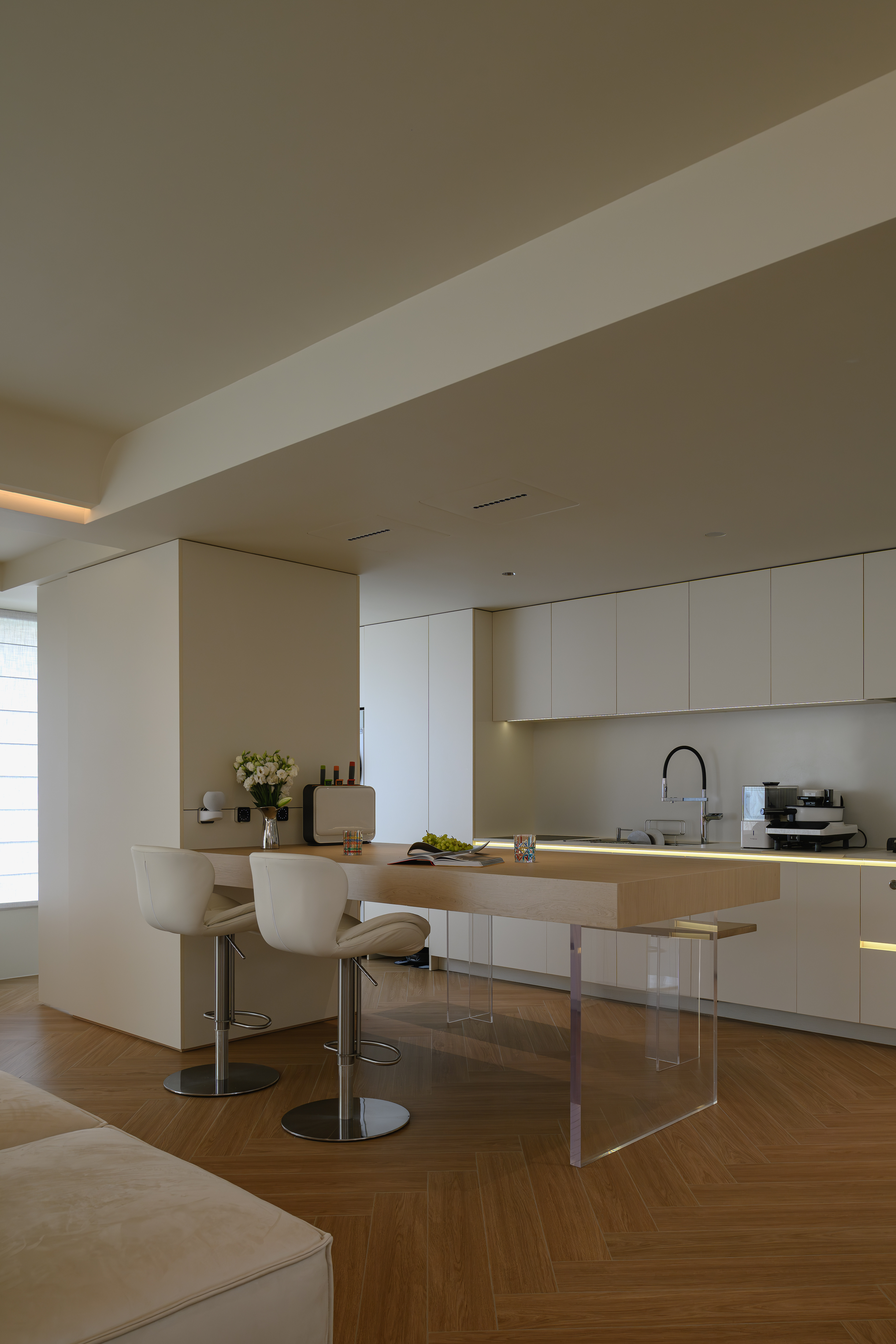 客餐厨一体化设计不仅空间开阔明亮,还能增进家人之间的互动。客厅做无主灯设计,隐藏式灯带作为辅助光源,满足不同场景的要求,给予生活满满的氛围感。