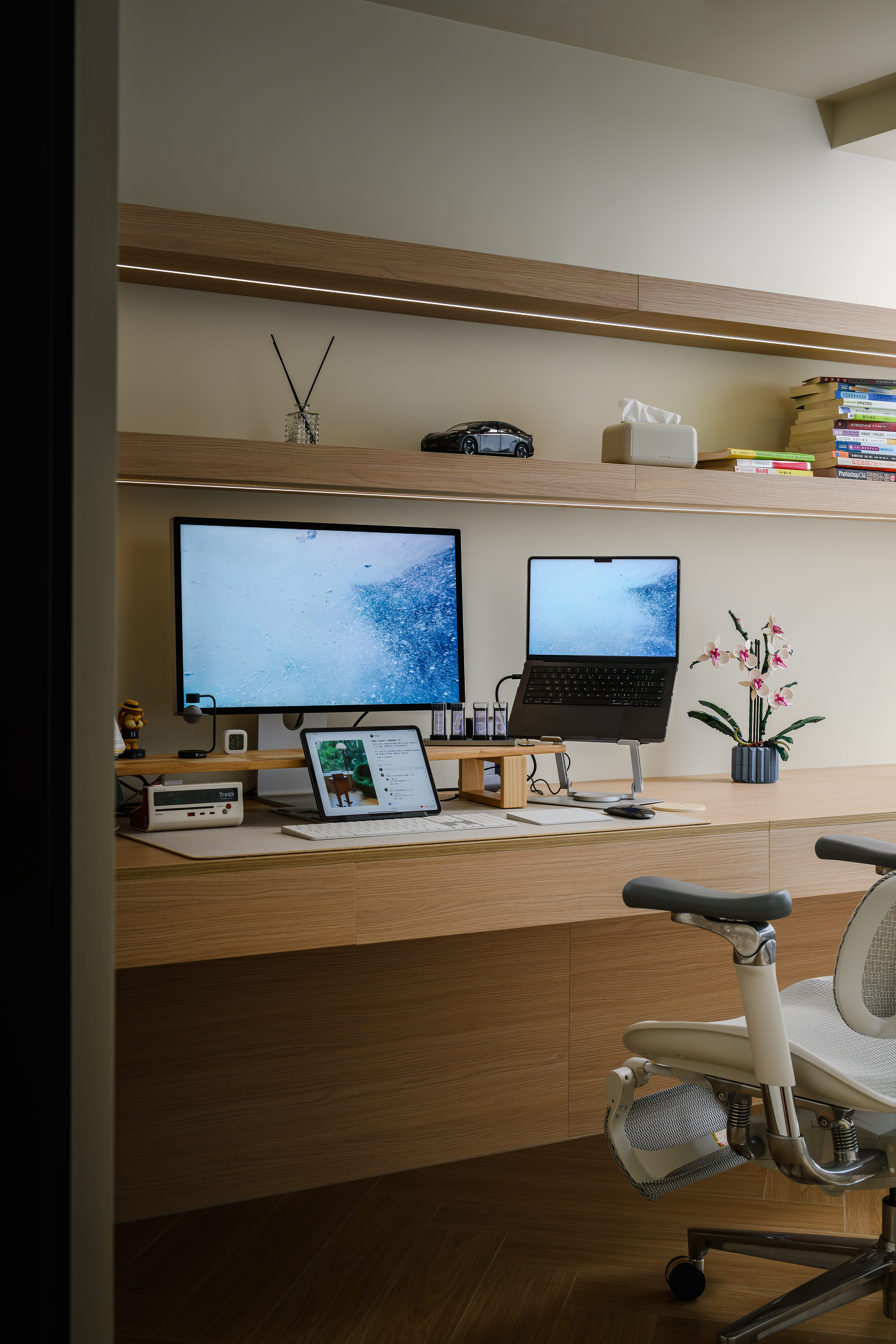 书房,作为小哥哥的专属领地,沉浸于一份难得的宁静与自在,目光所及都是他平日珍爱办公物件。我们为其特别定制的超长原木悬浮书桌,不仅是空间的焦点,更是灵感的源泉。当盛夏来临,窗外蝉鸣编织成自然的乐章,斑驳的阳光轻柔地洒落,每一刻都显得格外珍贵与和谐。