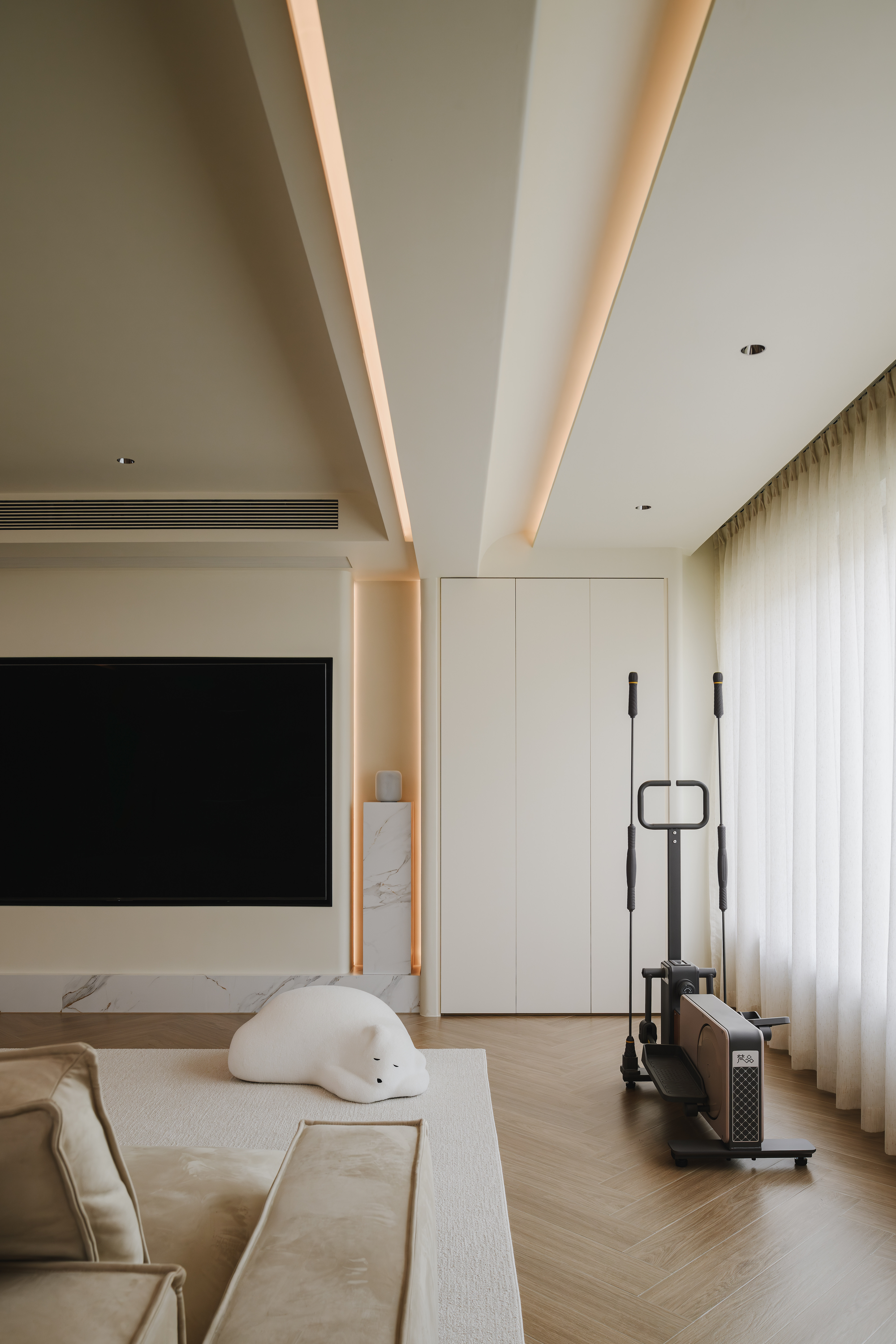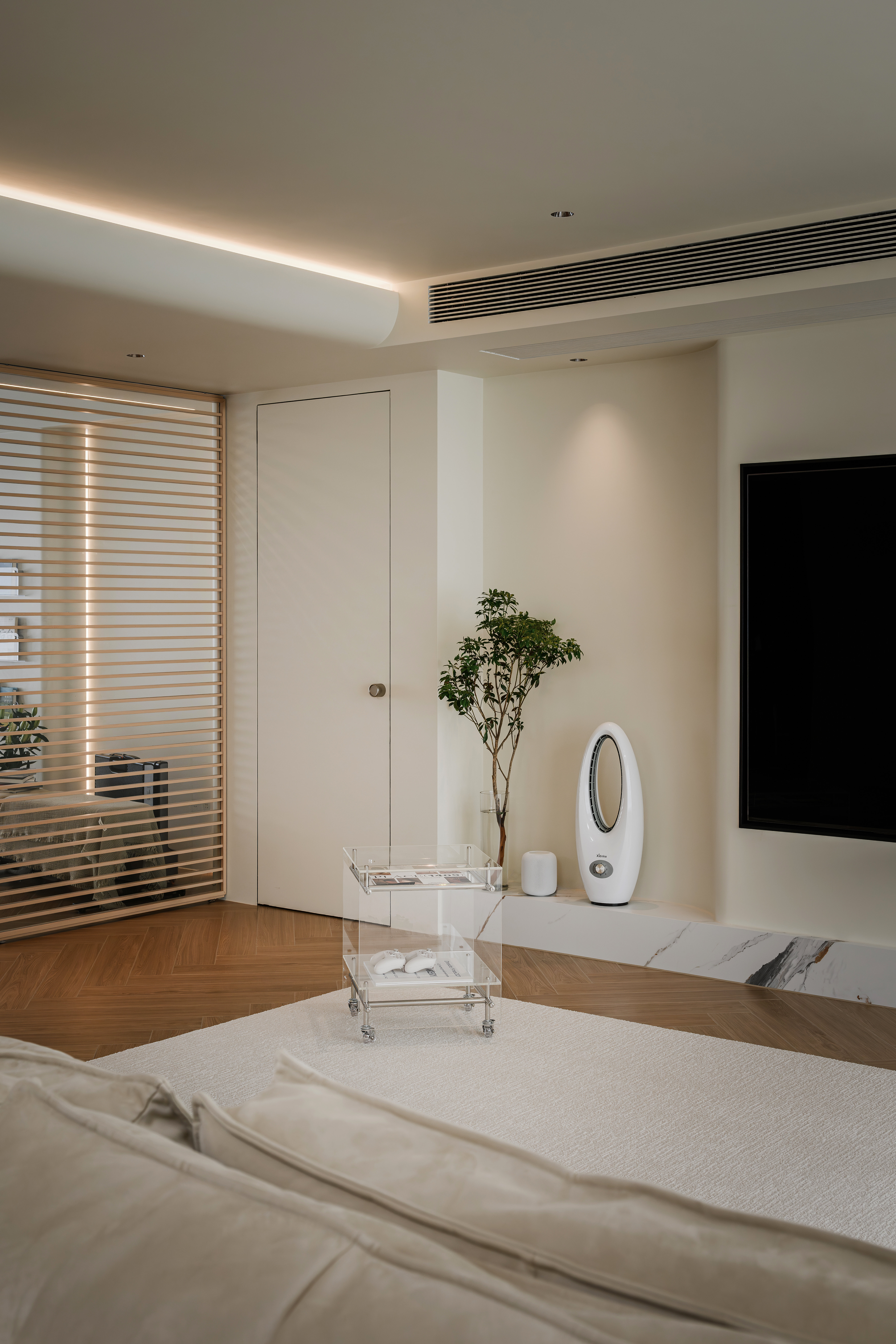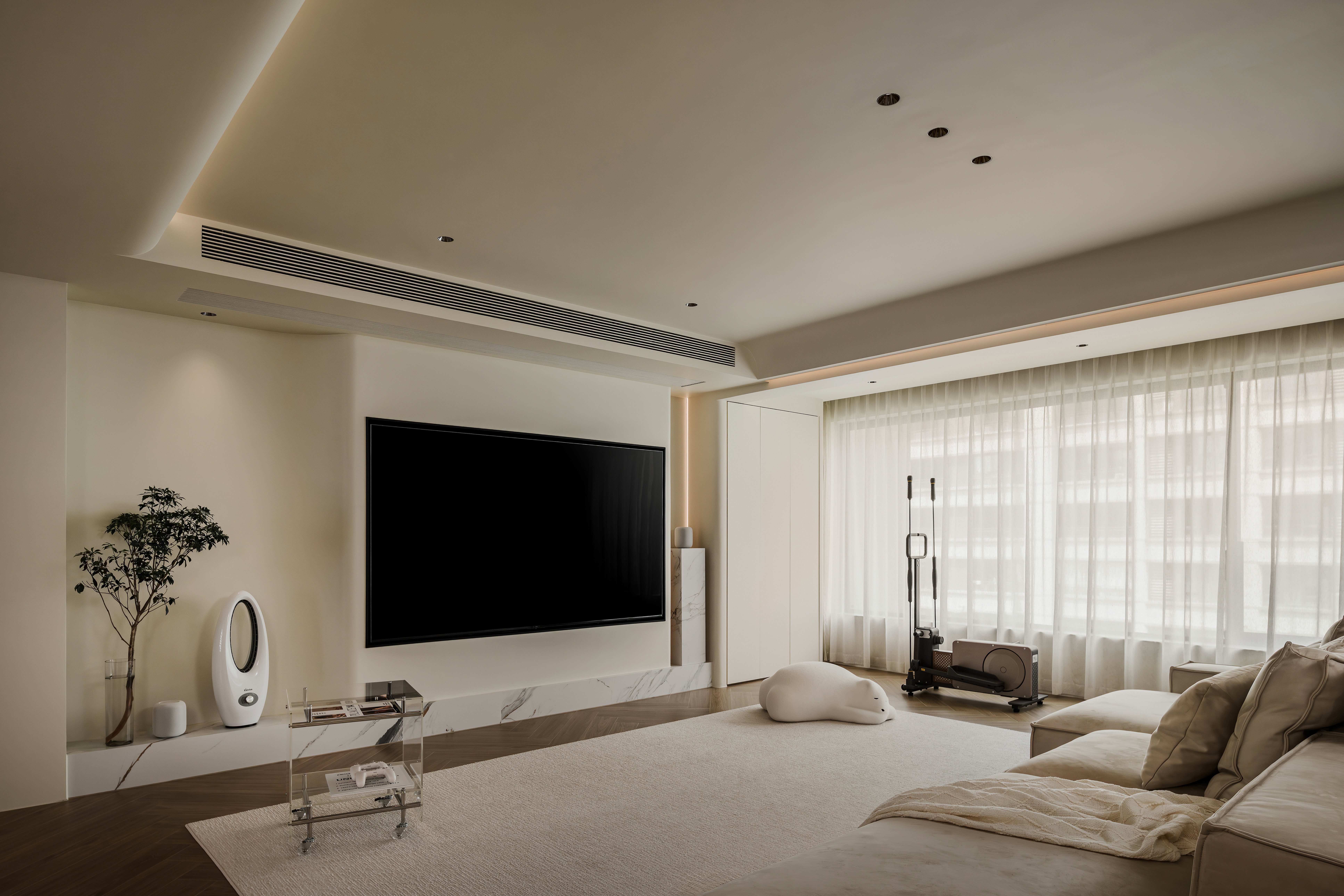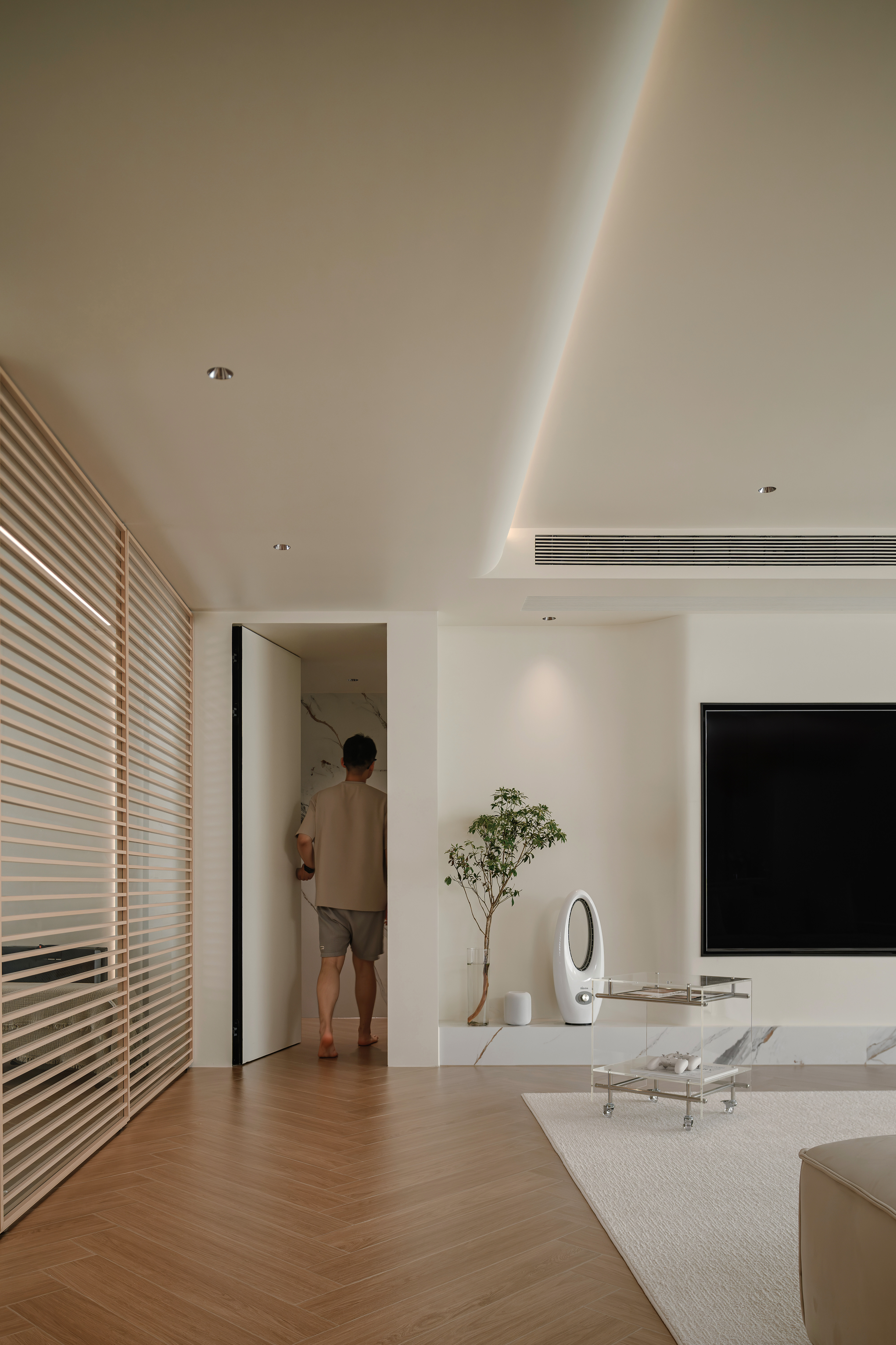 业主@阿七是一位自由职业者,他偏爱绿意盎然的居住环境,视自然为生活的底色,这与新居万科悦湾的自然之境不谋而合。装修前期他在网上做了大量功课,机缘巧合下选择了我们工作室。初次和小哥哥沟通,便能感受他对新居的个性化期待。对于家的构想中带着几分“随性”的色彩。面对原本规整的四室一厅格局,他决定“追随本心:,只保留一间卧室,将剩余的空间改造成多用途的灵动地带,在奶油极简风格的基调下,我们对这个居所进行了大胆的改造。
