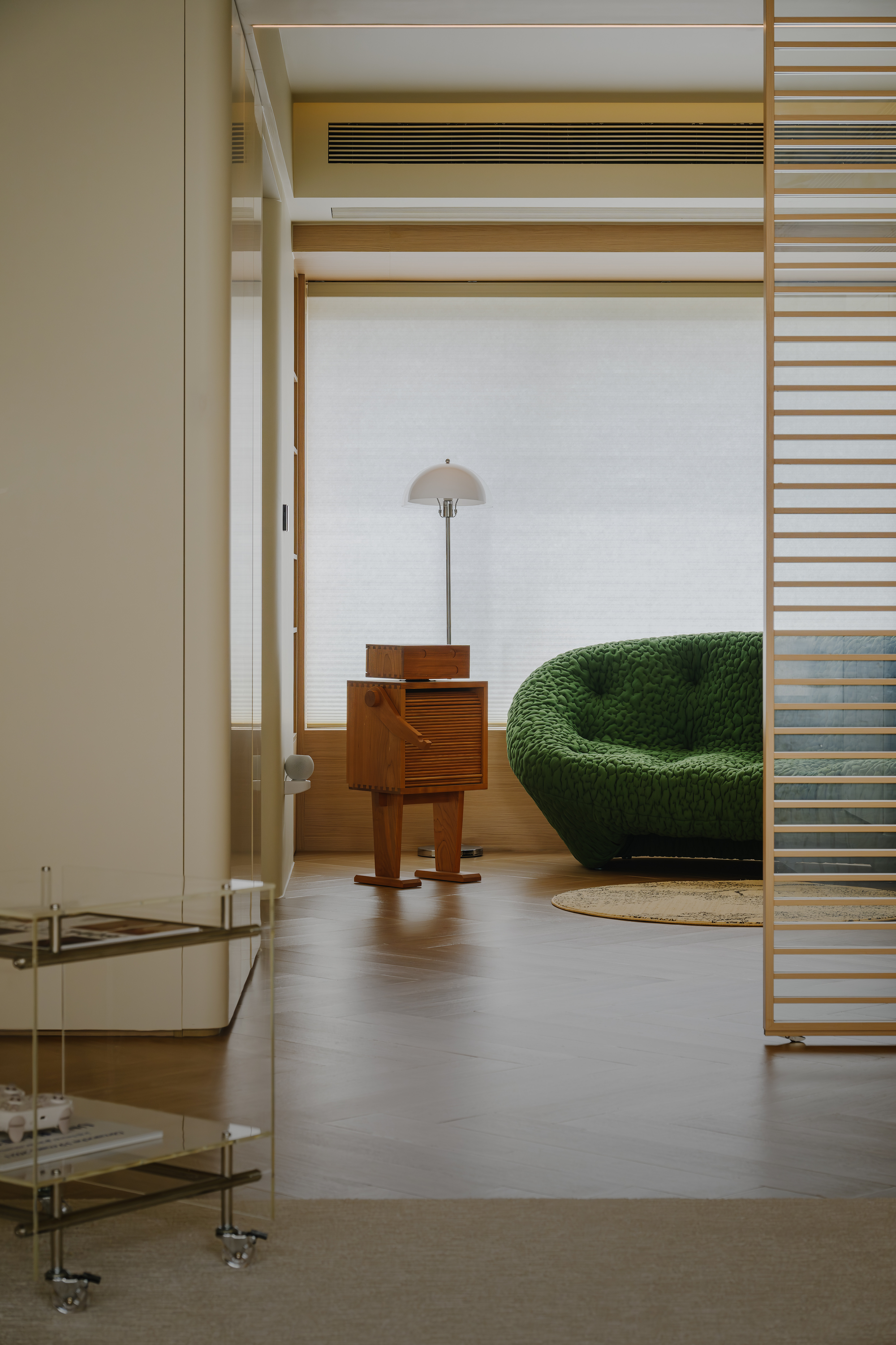 休闲区内,墨绿沙发自带复古滤镜,随意翻看几本喜爱的读物,为心灵的休憩与友人的欢聚开辟了一方幽静而雅致的天地。