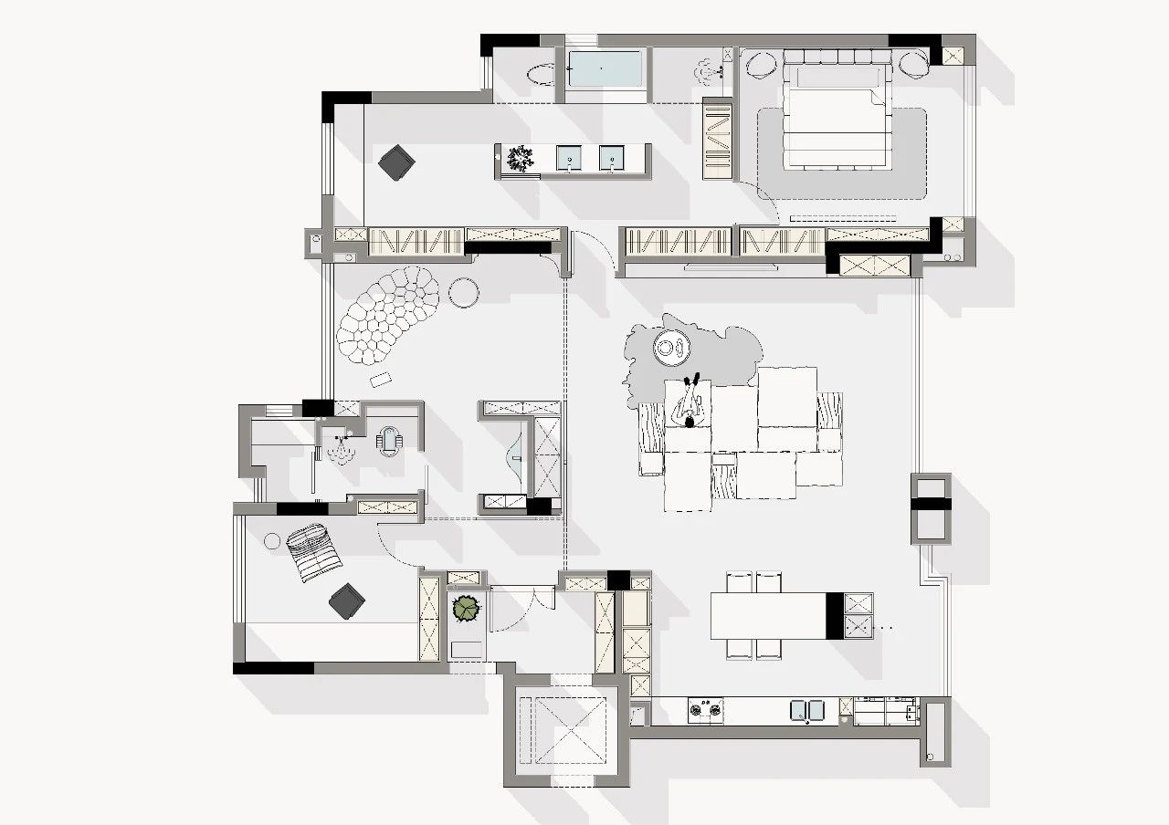 设计要点滑门系统灵活划分空间,实现休闲区与工作区的多变组合;多功能房概念,通过滑门可与客厅整合或独立为套房;独立工作区配备滑门,保障隐私,适合接待访客;开放式厨房与阳台融入客厅,优化生活动线;步入式衣帽间贴合生活习惯,提升居住品质;主卧环形设计,一体化卫生间,展现高级与私密。