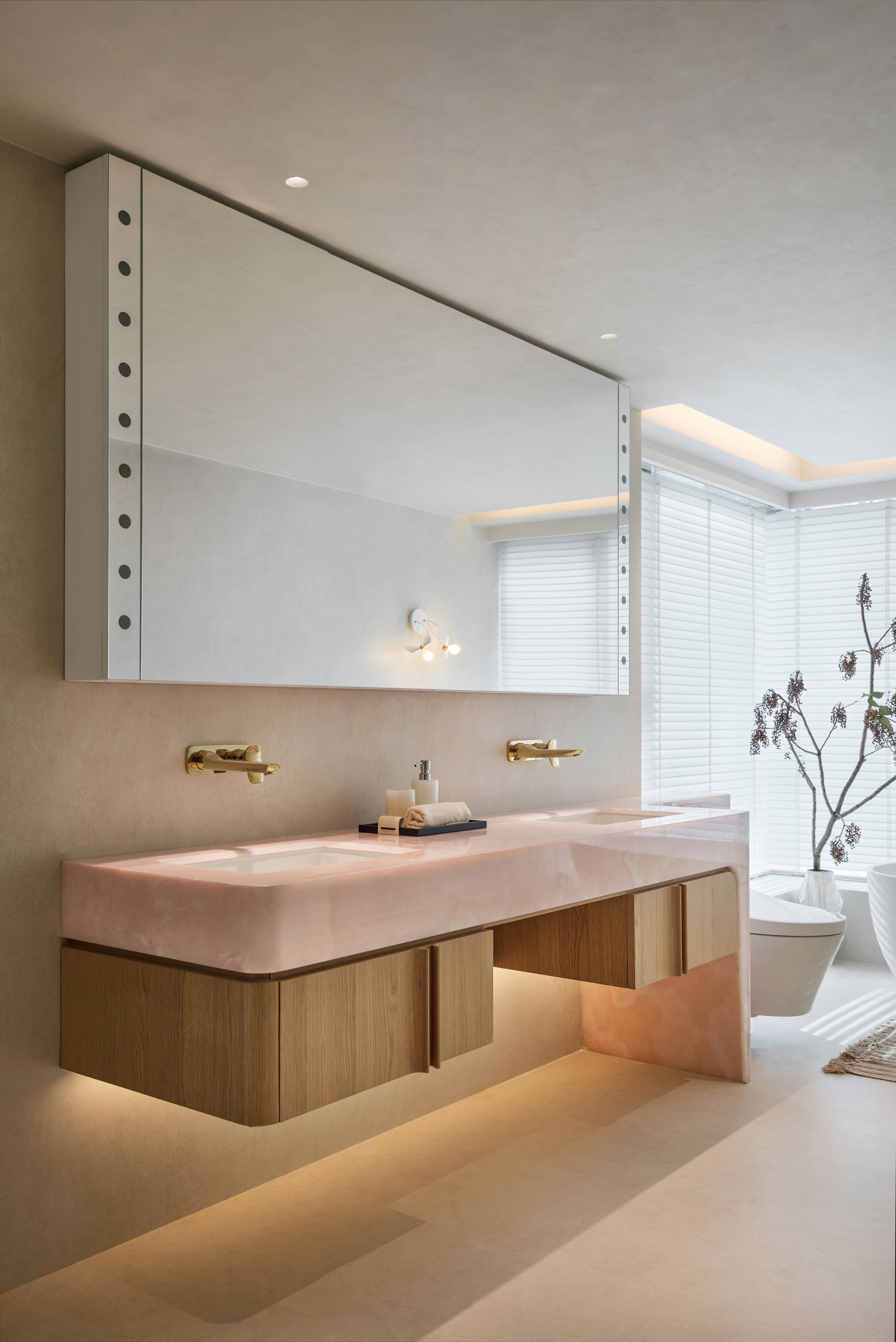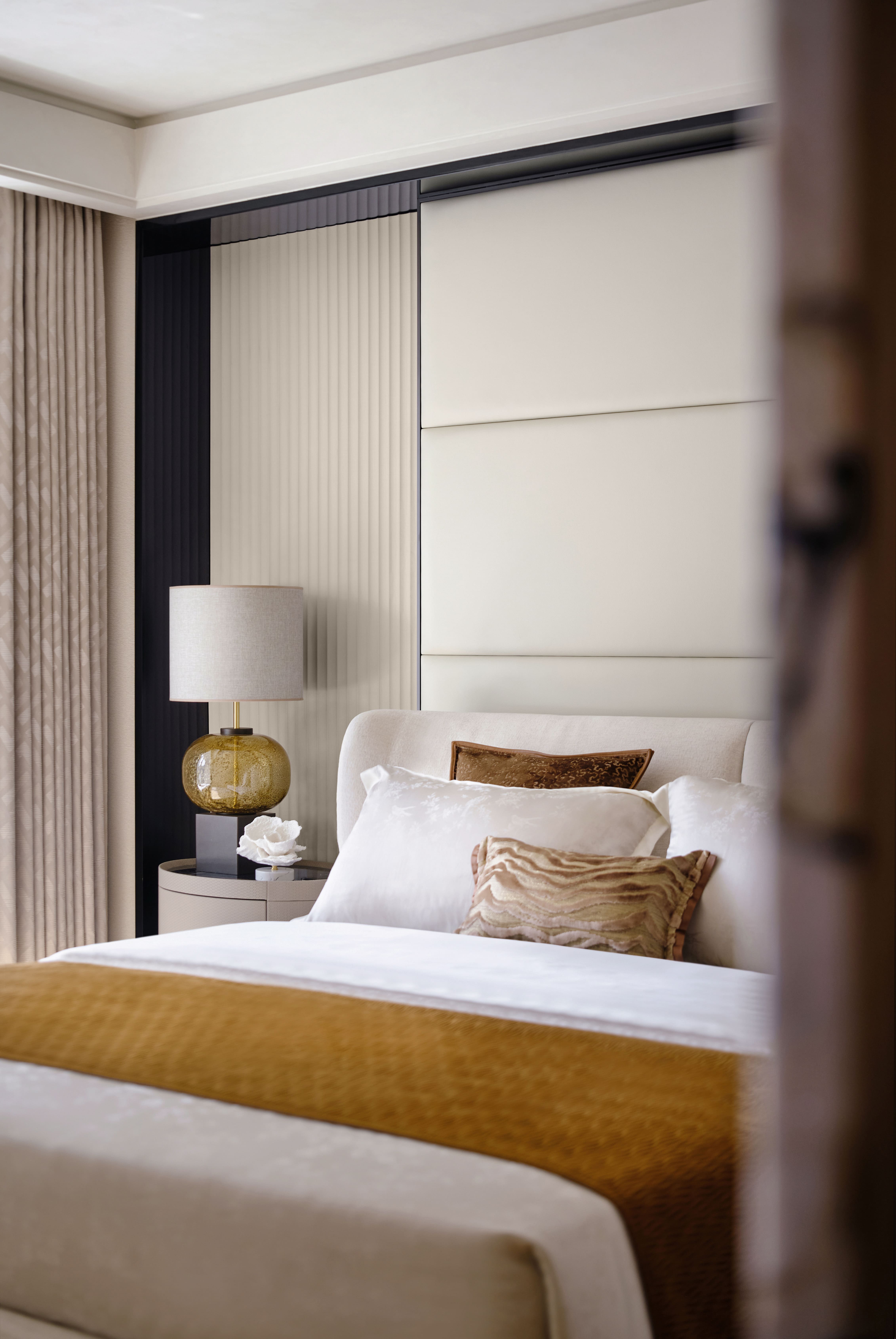 采用自然柔和的饰面材料:温润的木饰面、内嵌的贝壳把手、米白色壁布、肌理漆、宝格丽大理石。
