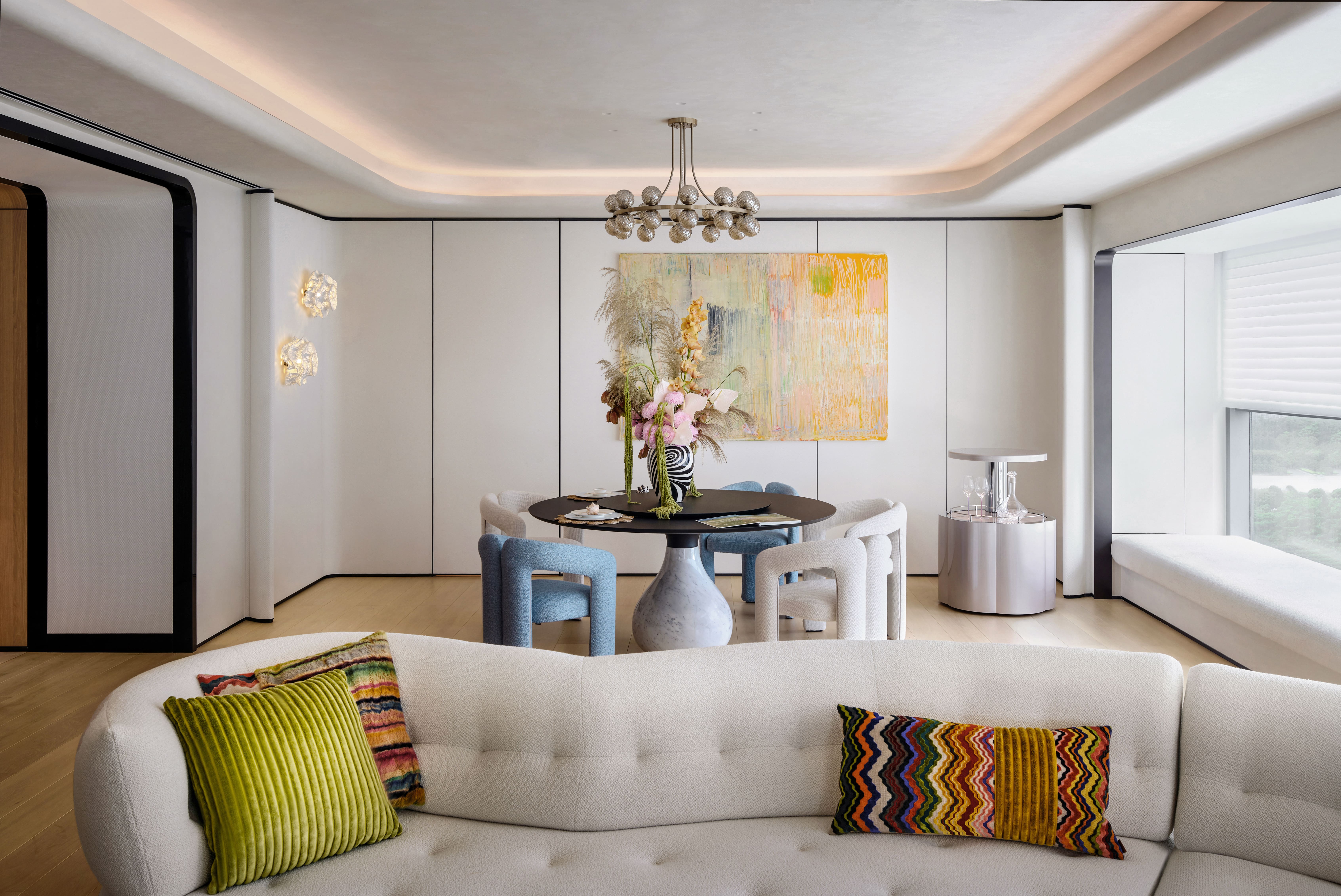 开放式公区视觉向自然无垠之处悠然延伸,客餐厅的6.5米超长飘窗如一幅画卷,优雅地铺陈着对美好生活的无限憧憬。米色壁布绘就的卷轴屏风,为静谧的空间添了灵动的呼吸感。
