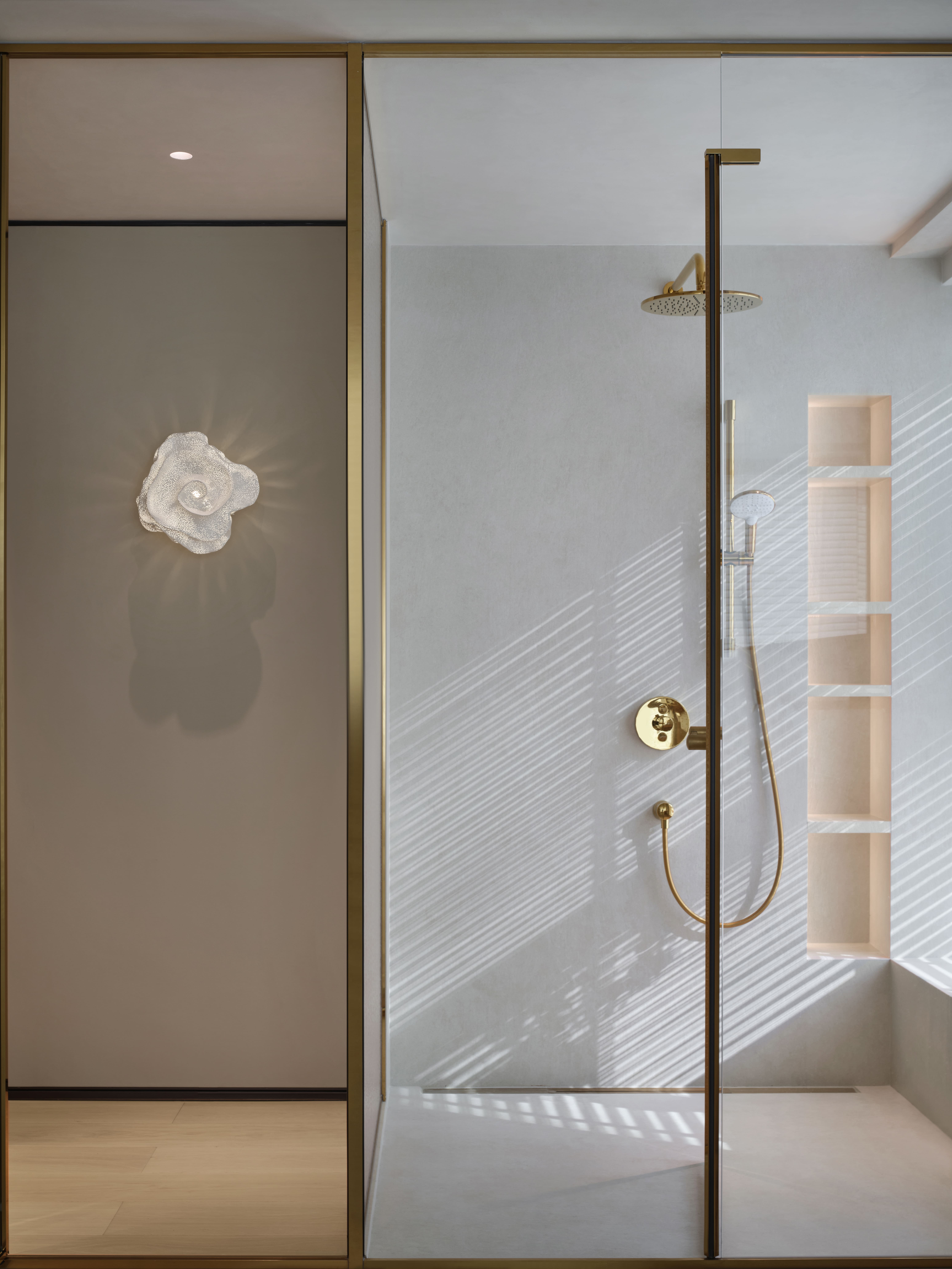 以玄关为轴,将家的场域以动、静划分。左侧为生活区,开放式客餐厅与茶室在这里和谐共生,通过唤醒感官体验,让每一次聚会、每一次欢笑,都能在宽敞明亮的空间中自由流淌,让温度与活力充斥于每个角。玄关右侧动线转向宁静,为疲惫的心灵提供一片宁静的港湾。