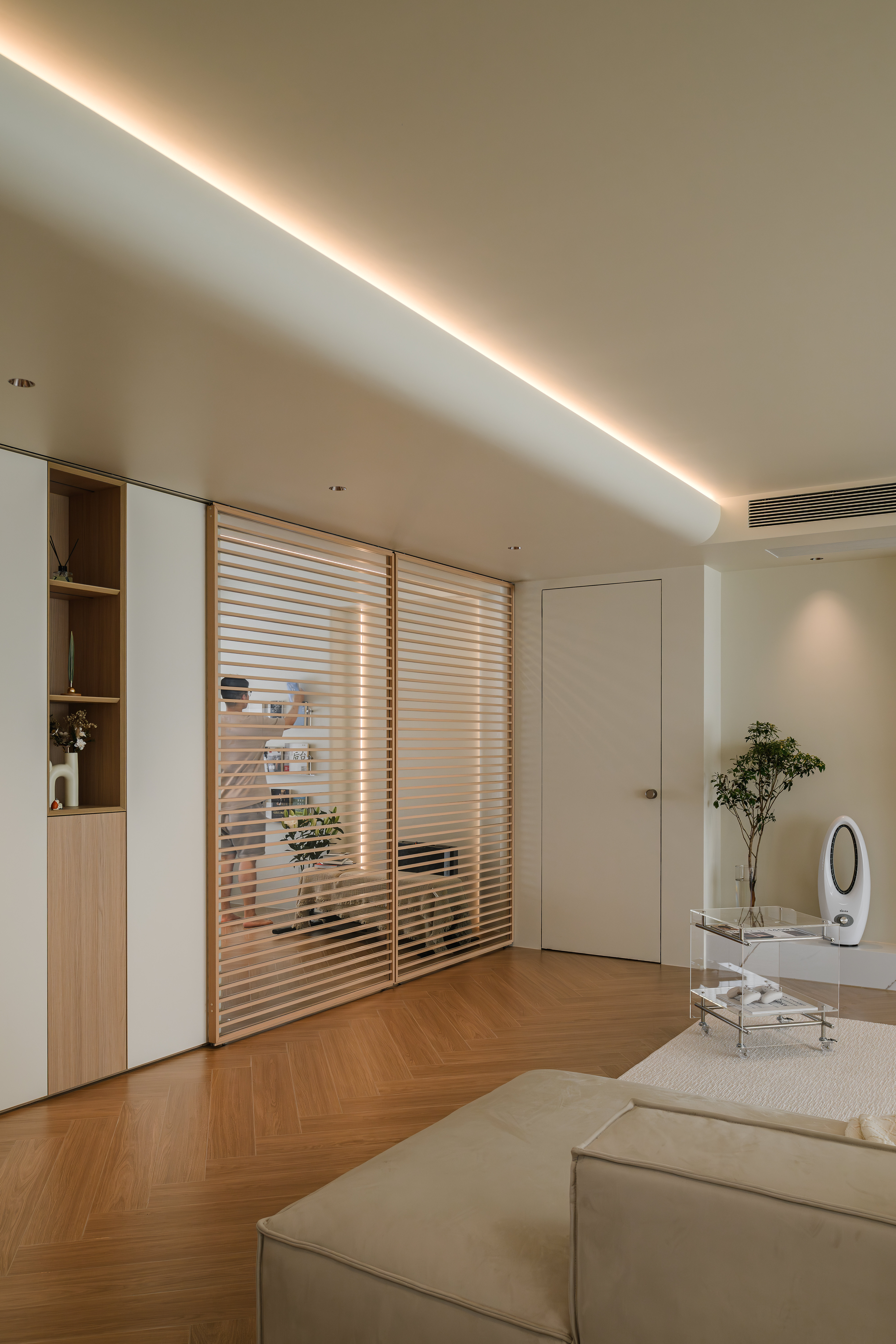 我们打通了家中不必要的隔墙,让空间变得开阔而通透。三扇滑门的巧妙运用,让空间功能随心切换。滑门关上后,瞬间变身高效工作室;另一扇滑门后则成为亲友相聚的理想之地,与客卫相连,闭合时可形成独立套间。