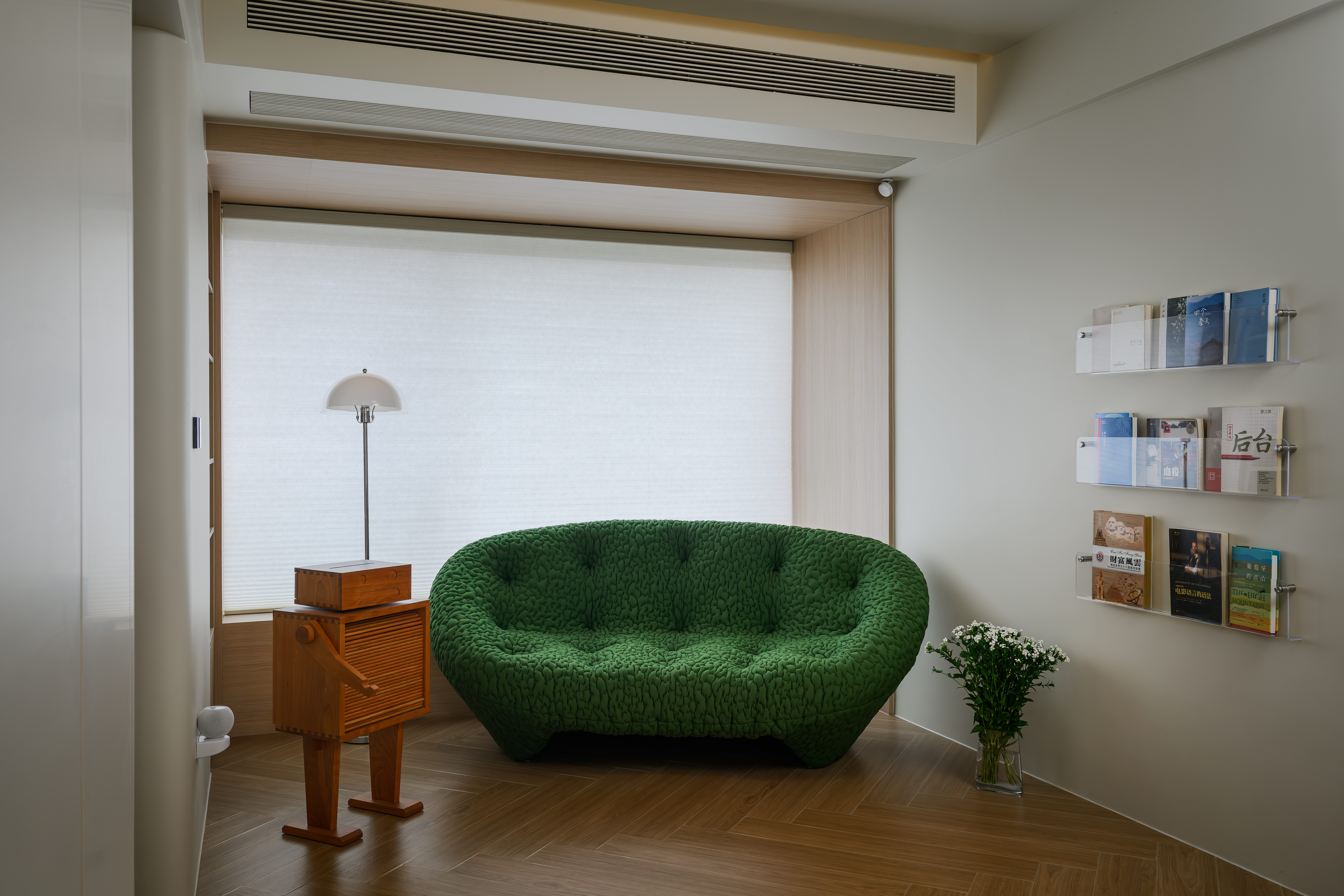 休闲区内,墨绿沙发自带复古滤镜,随意翻看几本喜爱的读物,为心灵的休憩与友人的欢聚开辟了一方幽静而雅致的天地。