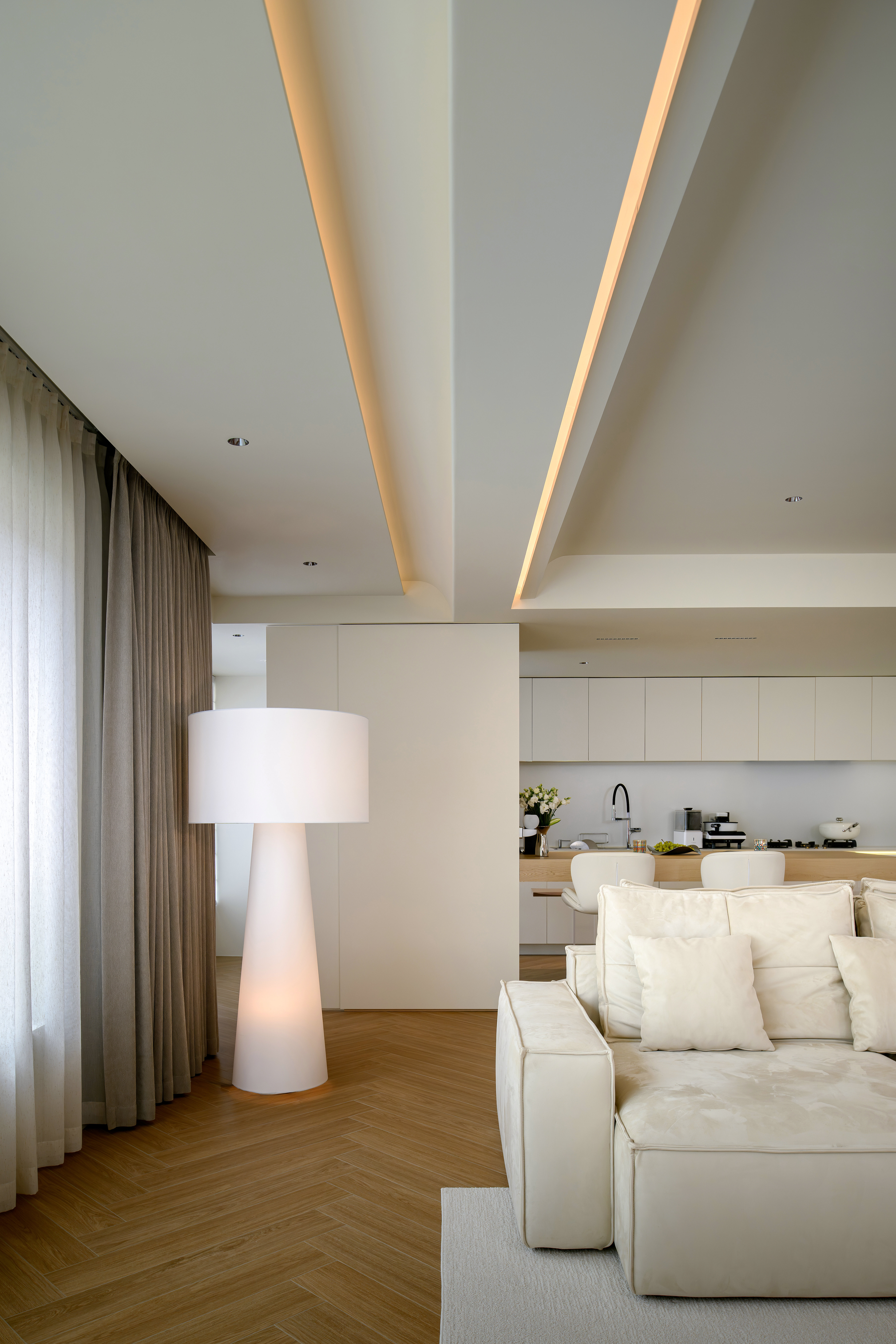 客餐厨一体化设计不仅空间开阔明亮,还能增进家人之间的互动。客厅做无主灯设计,隐藏式灯带作为辅助光源,满足不同场景的要求,给予生活满满的氛围感。