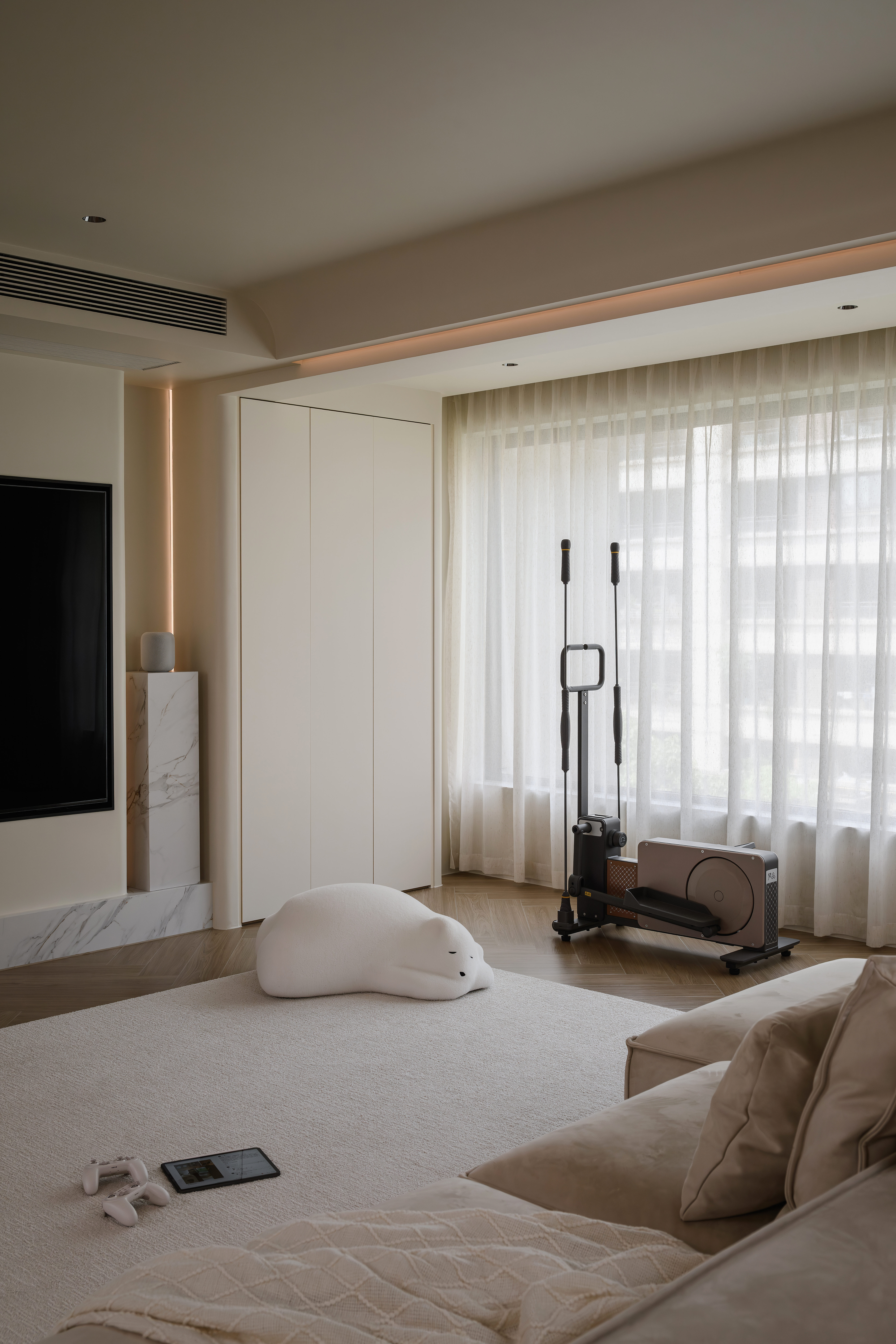 空间意境:阿七是一位自由职业者,他偏爱绿意盎然的居住环境,视自然为生活的底色,这与新居万科悦湾的自然之境不谋而合。装修前期他在网上做了大量功课,机缘巧合下选择了我们工作室。初次和小哥哥沟通,便能感受他对新居的个性化期待。对于家的构想中带着几分“随性”的色彩。面对原本规整的四室一厅格局,他决定“追随本心:,只保留一间卧室,将剩余的空间改造成多用途的灵动地带,在奶油极简风格的基调下,我们对这个居所进行了大胆的改造。