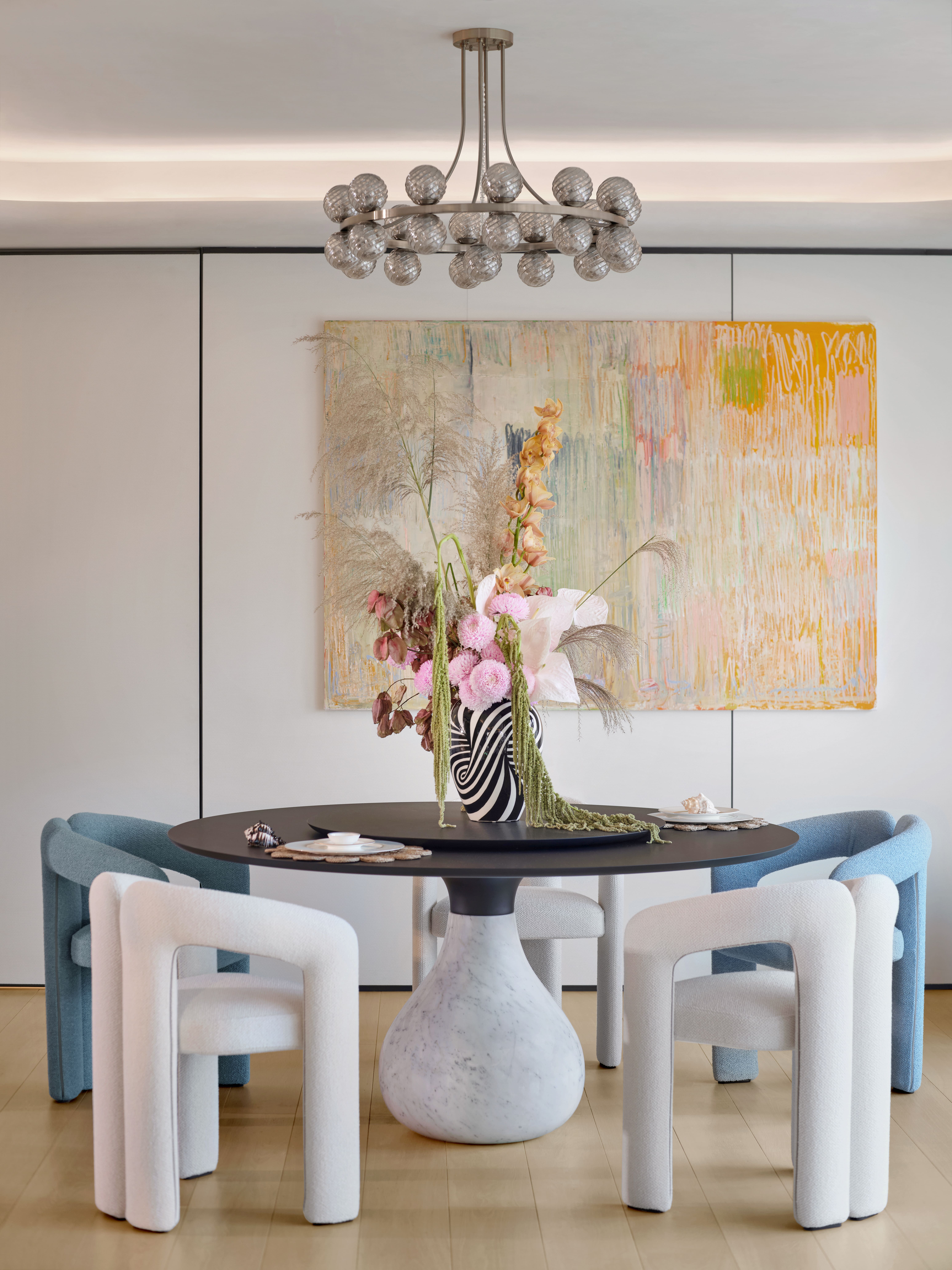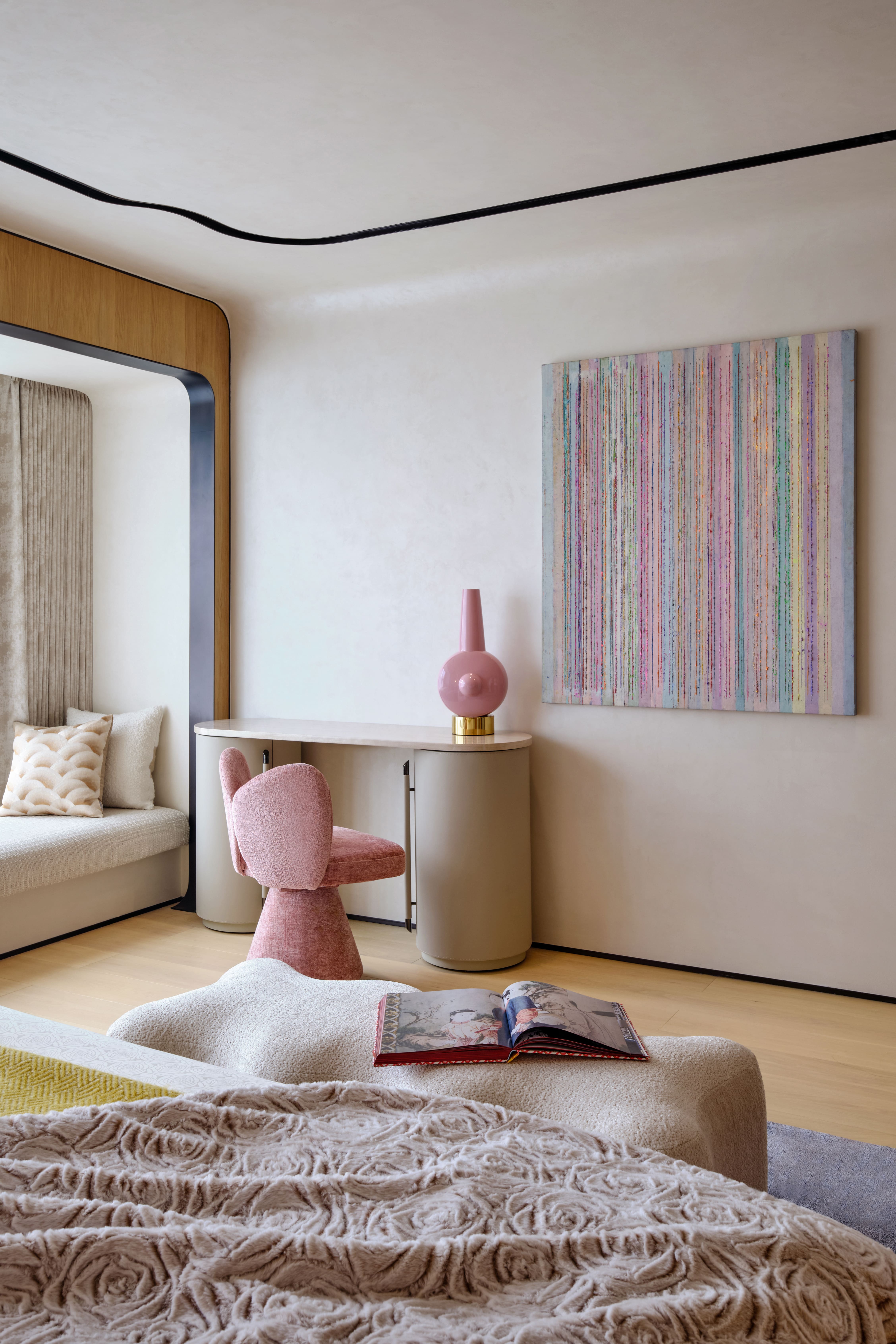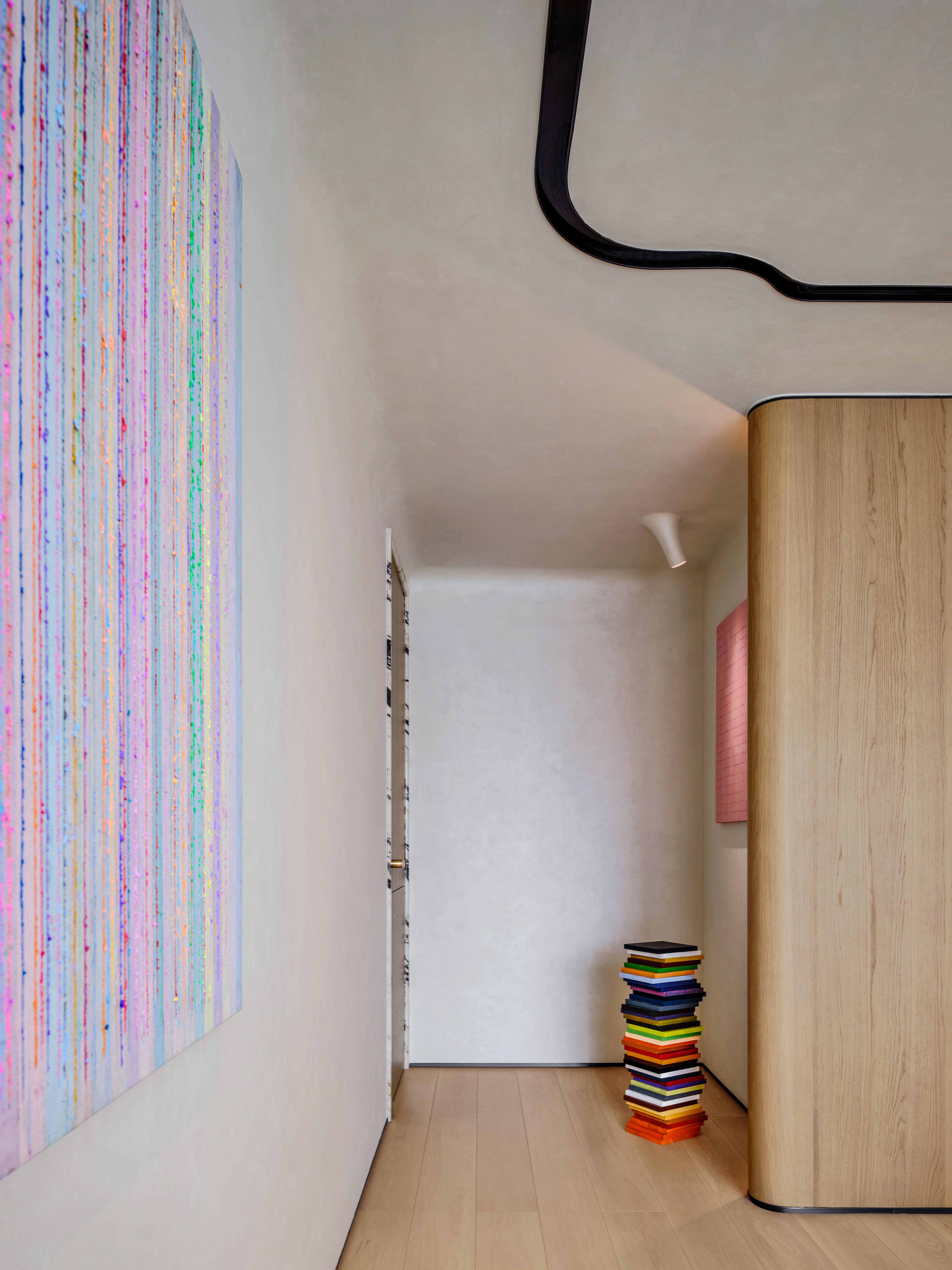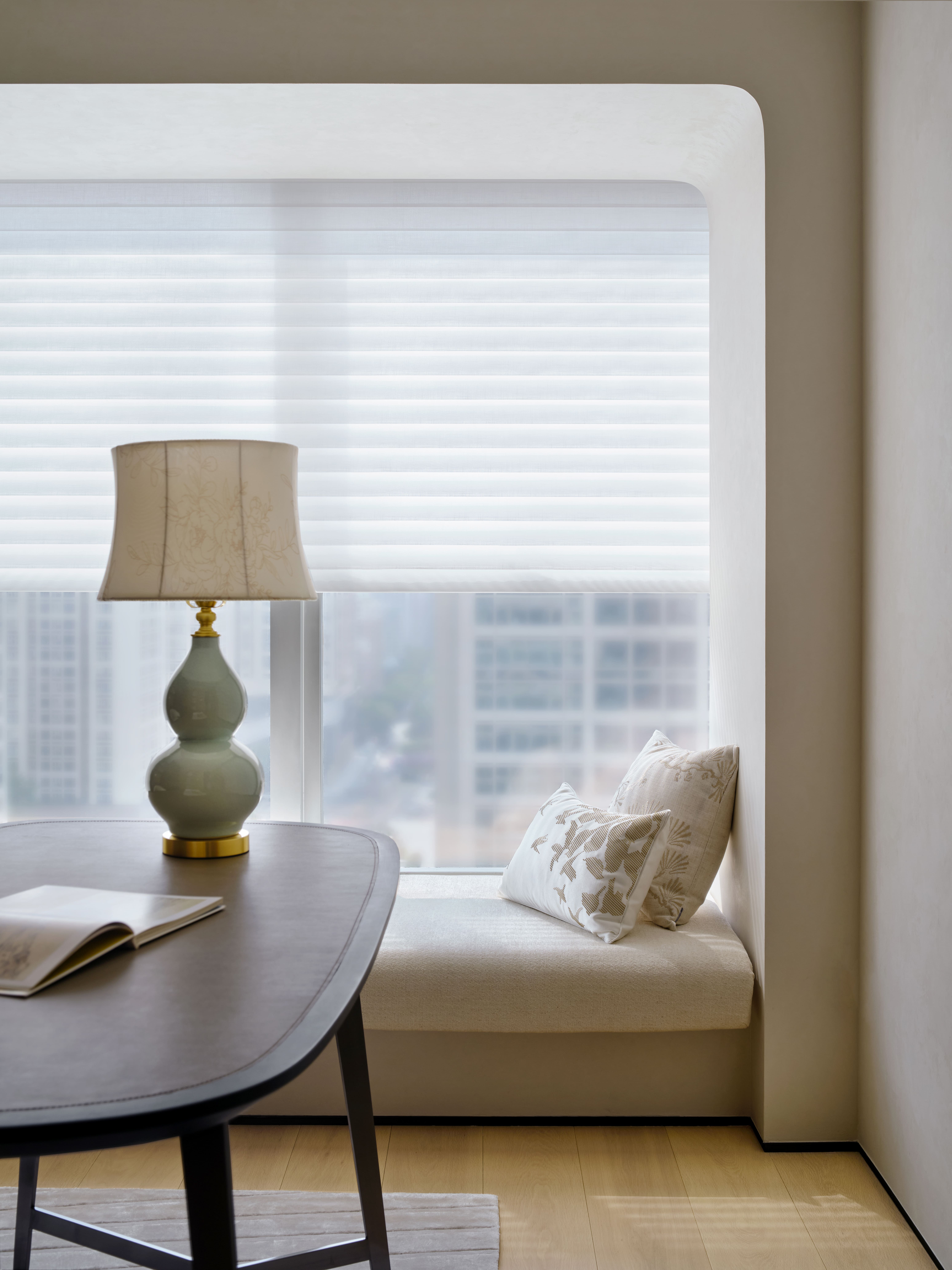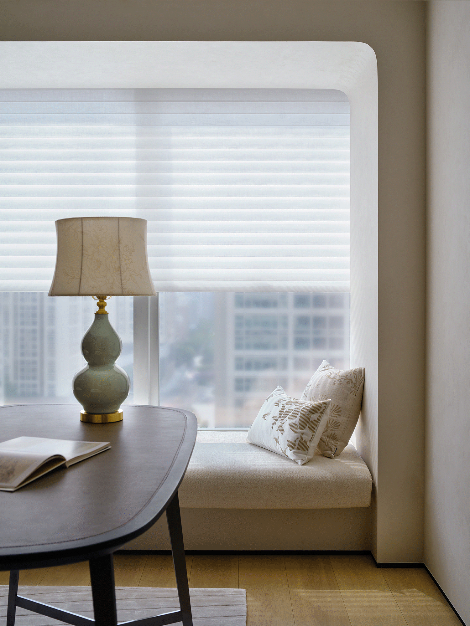开放式公区视觉向自然无垠之处悠然延伸,客餐厅的6.5米超长飘窗如一幅画卷,优雅地铺陈着对美好生活的无限憧憬。米色壁布绘就的卷轴屏风,为静谧的空间添了灵动的呼吸感。