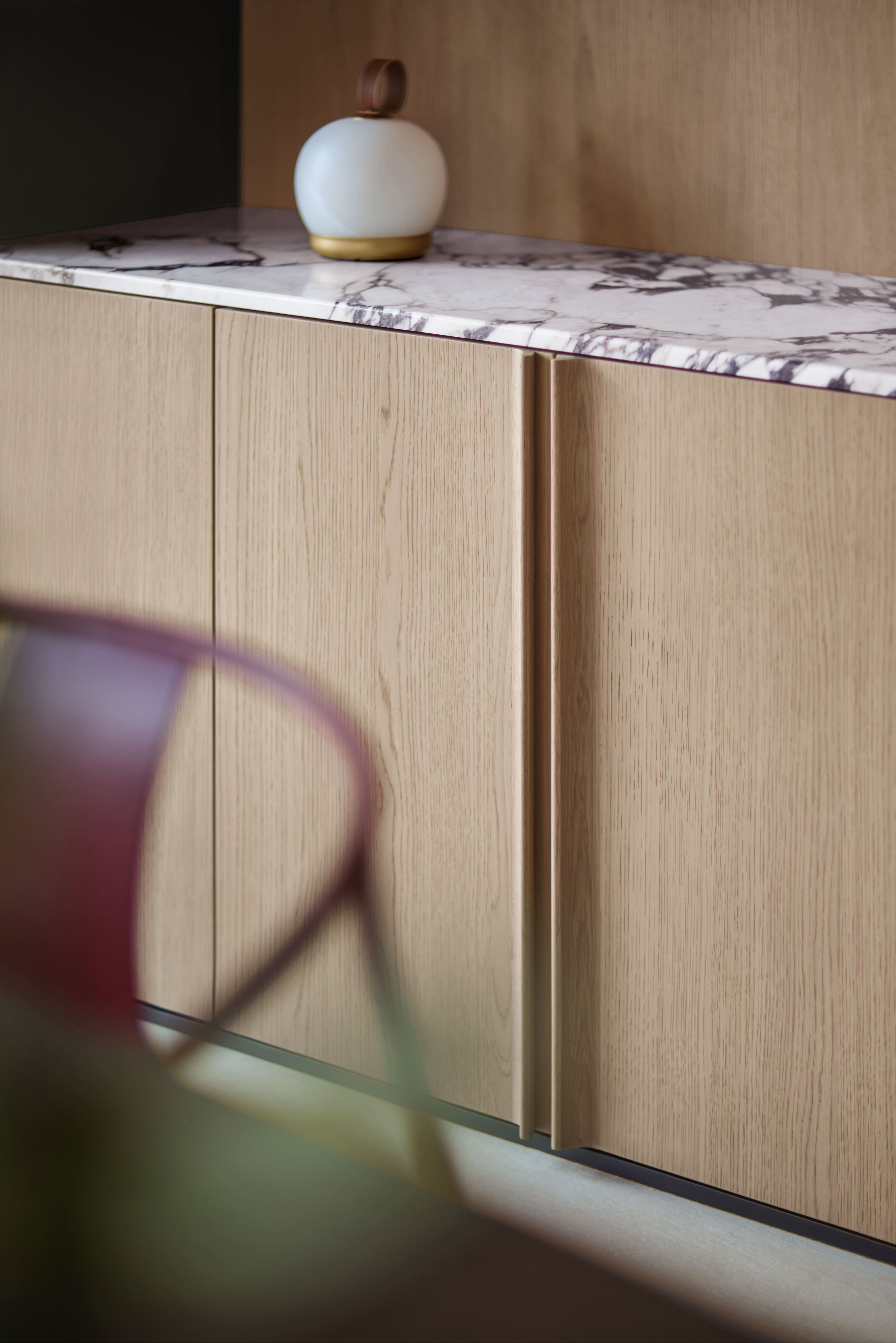 采用自然柔和的饰面材料:温润的木饰面、内嵌的贝壳把手、米白色壁布、肌理漆、宝格丽大理石。