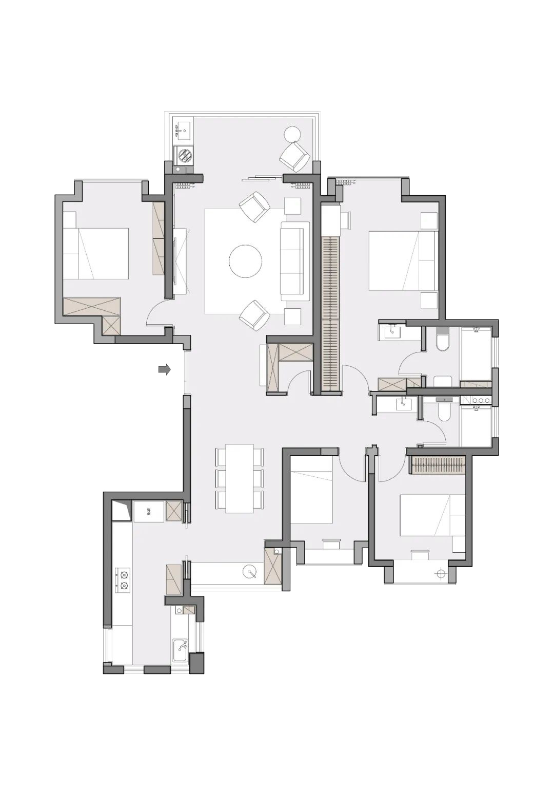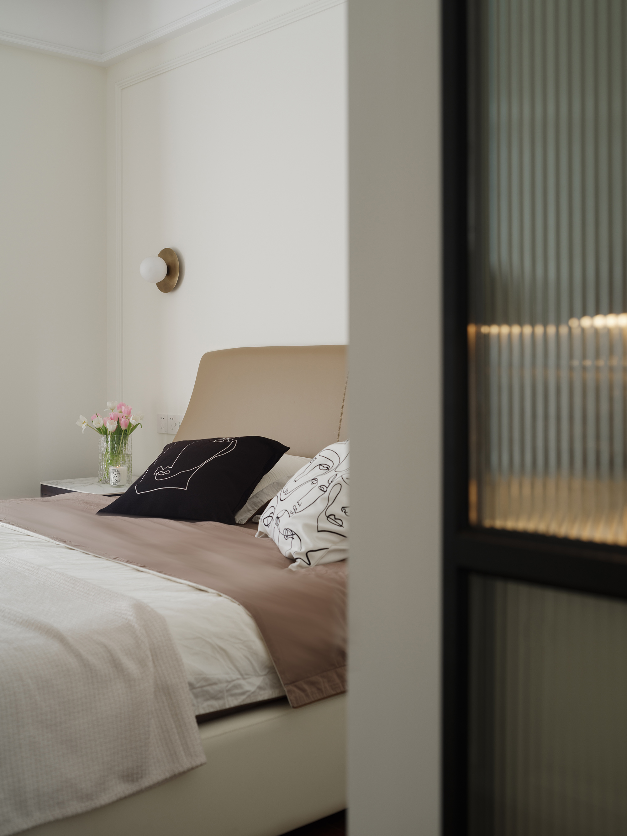 空间布局:·拆除空间所有不必要的墙体,玄关、餐厨、主卧瞬间变大,获得更开阔的空间体验;