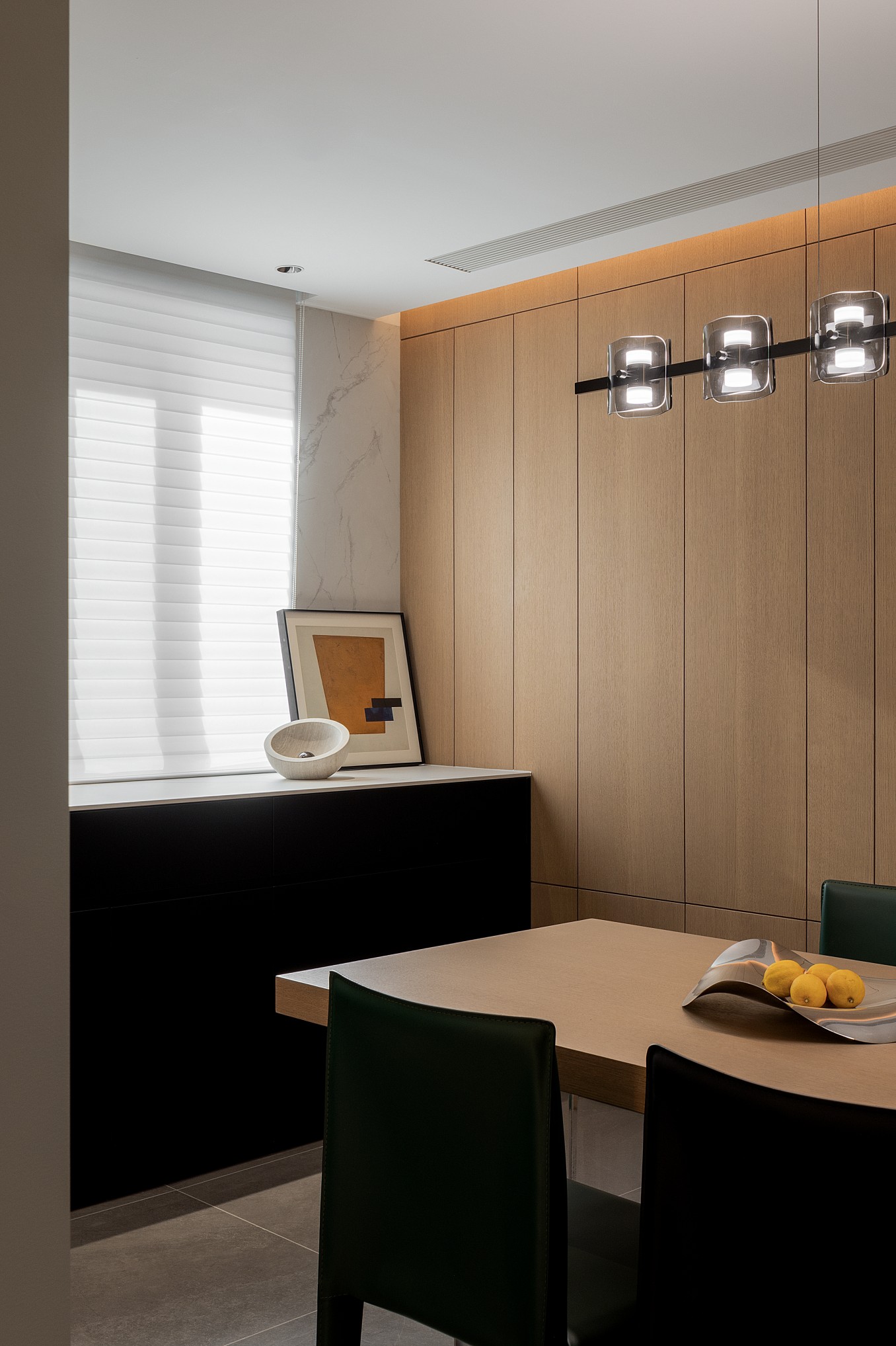2、辅助光源:床头灯、悬吊灯和书房台灯为特定区域提供功能性照明,并强调设计的趣味性。例如餐厅上方的简约吊灯,突出了空间的仪式感。