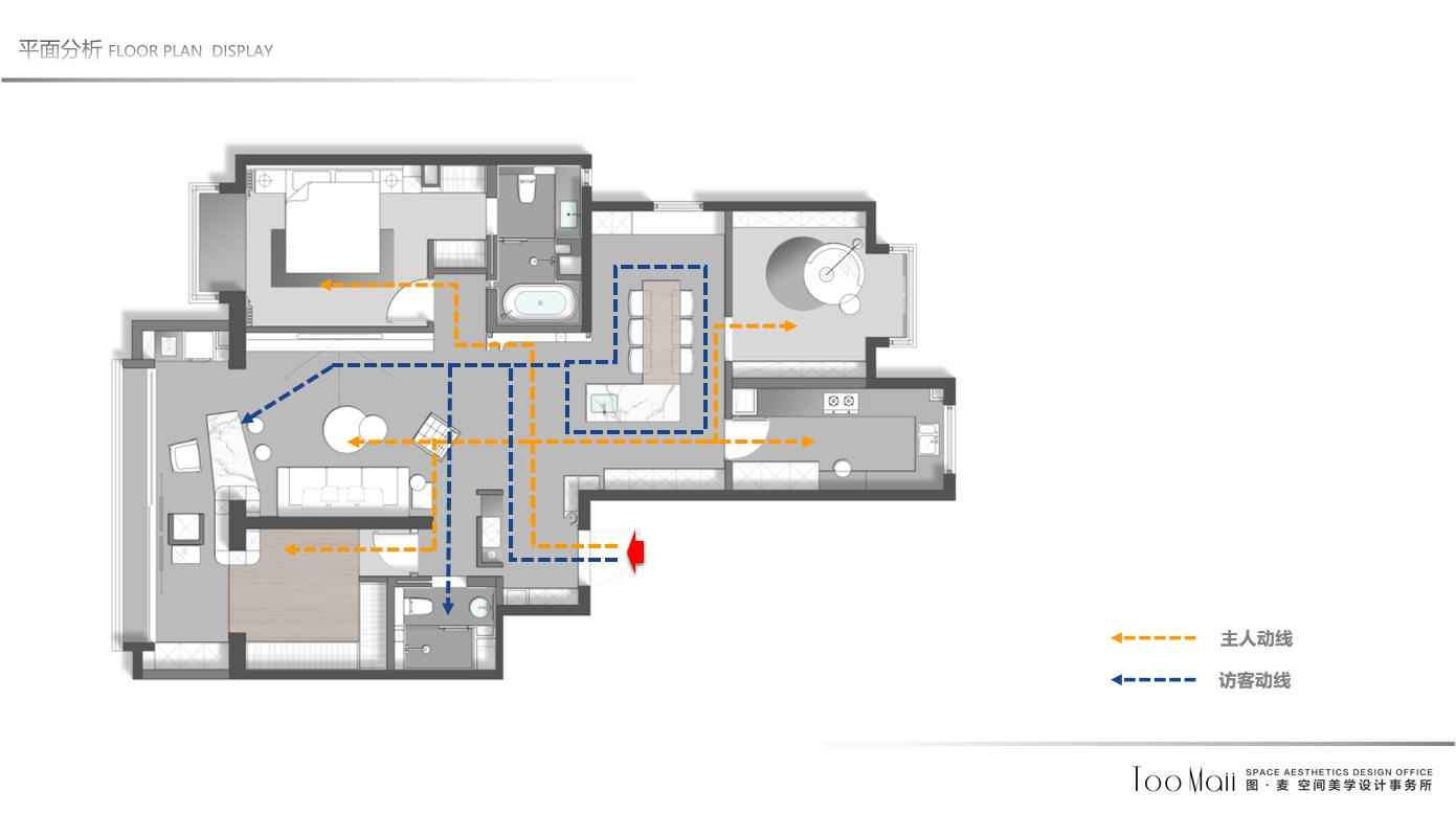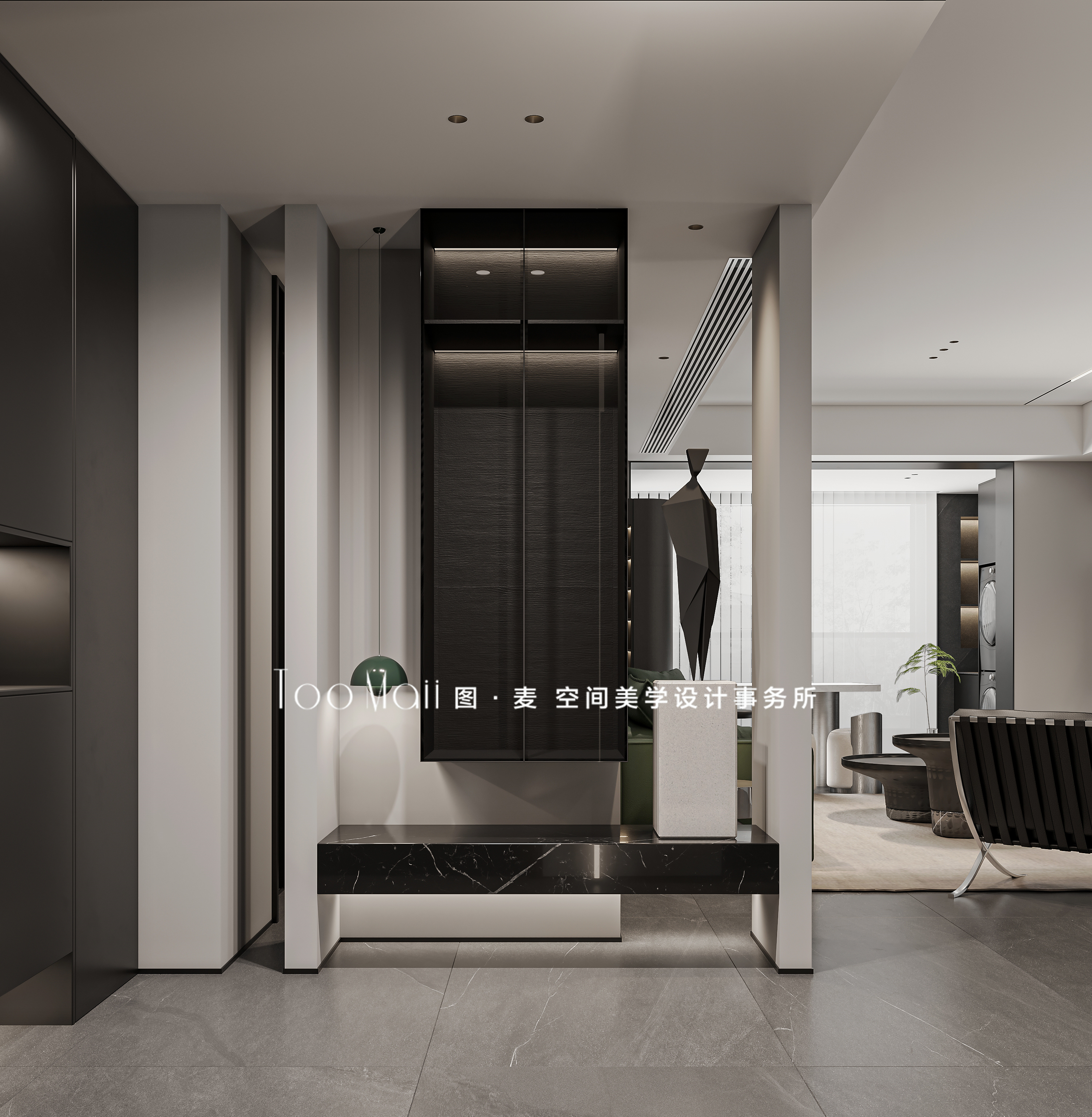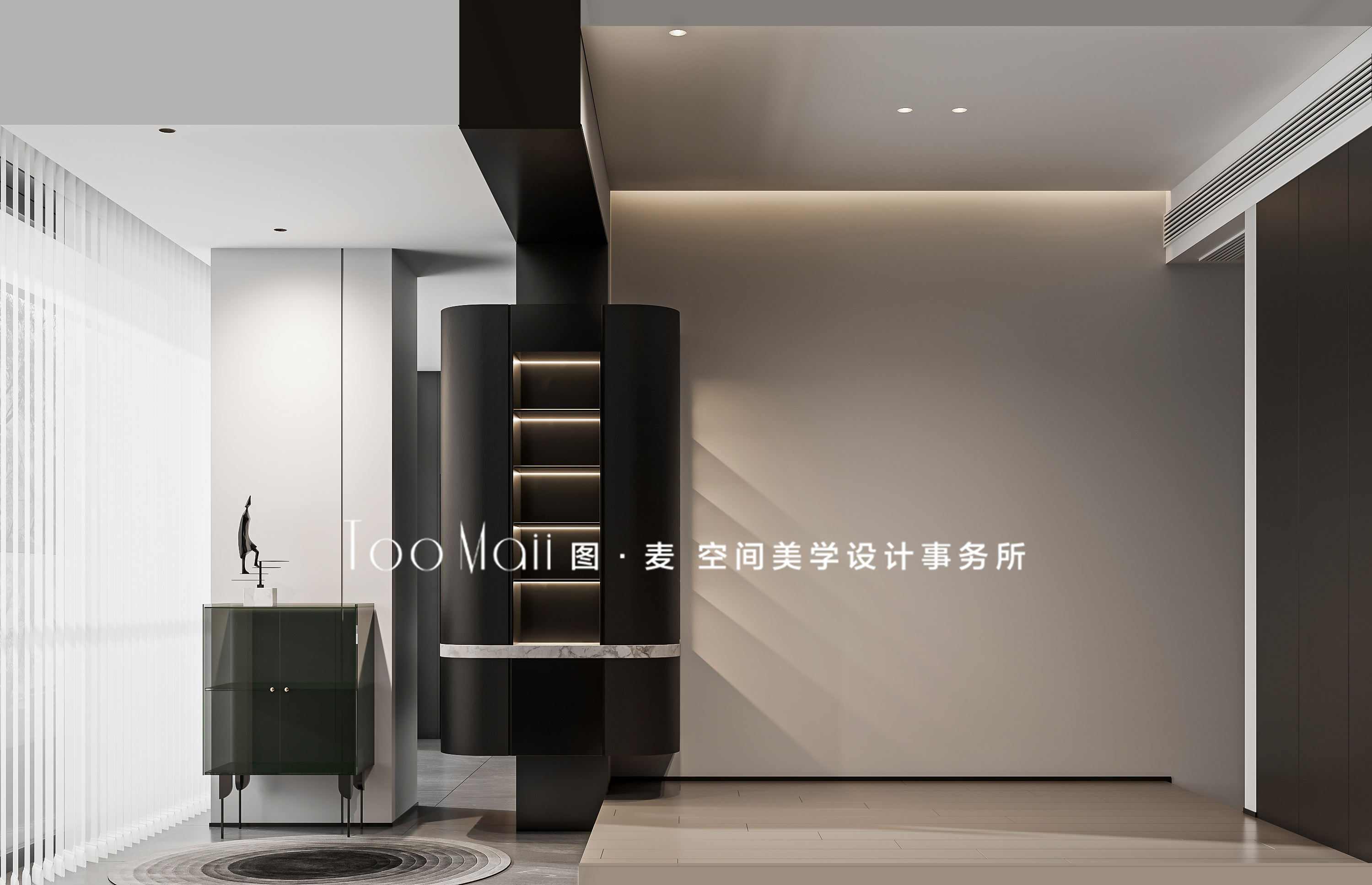 私人区域则更注重功能与隐私的平衡。卧室与书房采用软隔断和独立动线进行分离,保证了功能性与私密性兼具。玄关区域以大理石台面与隐藏式储物柜设计为亮点,既提升了实用功能,也成为空间的视觉焦点。书房与休闲区域灵活配置,可随需求调整为工作、阅读或社交场所,充分满足现代家庭多样化的生活方式。