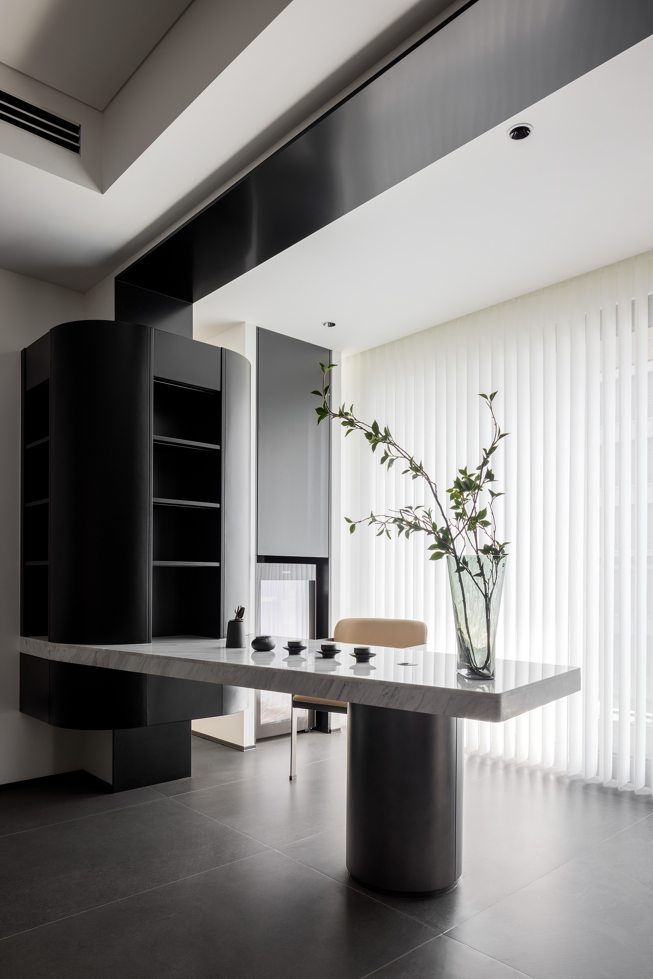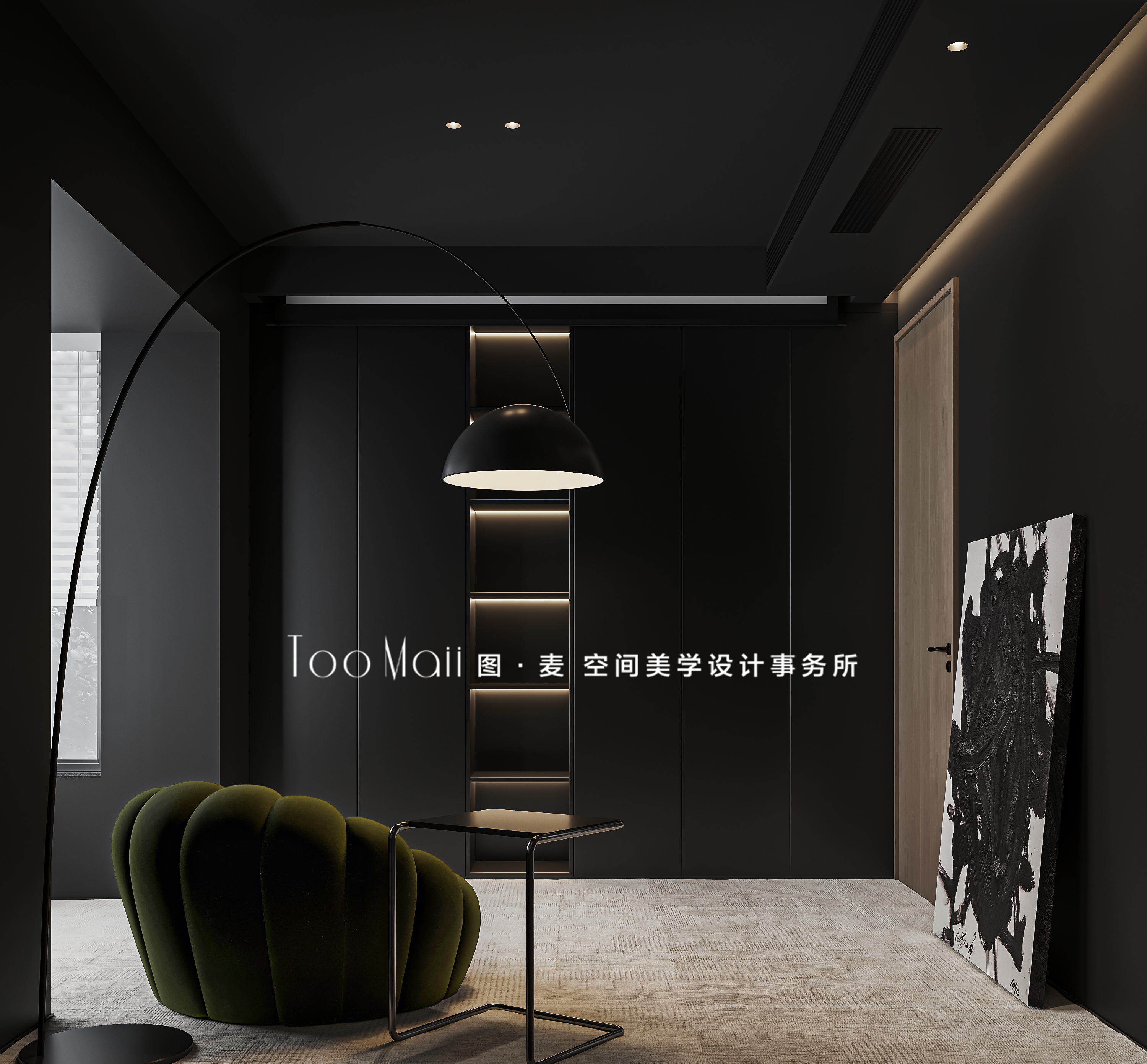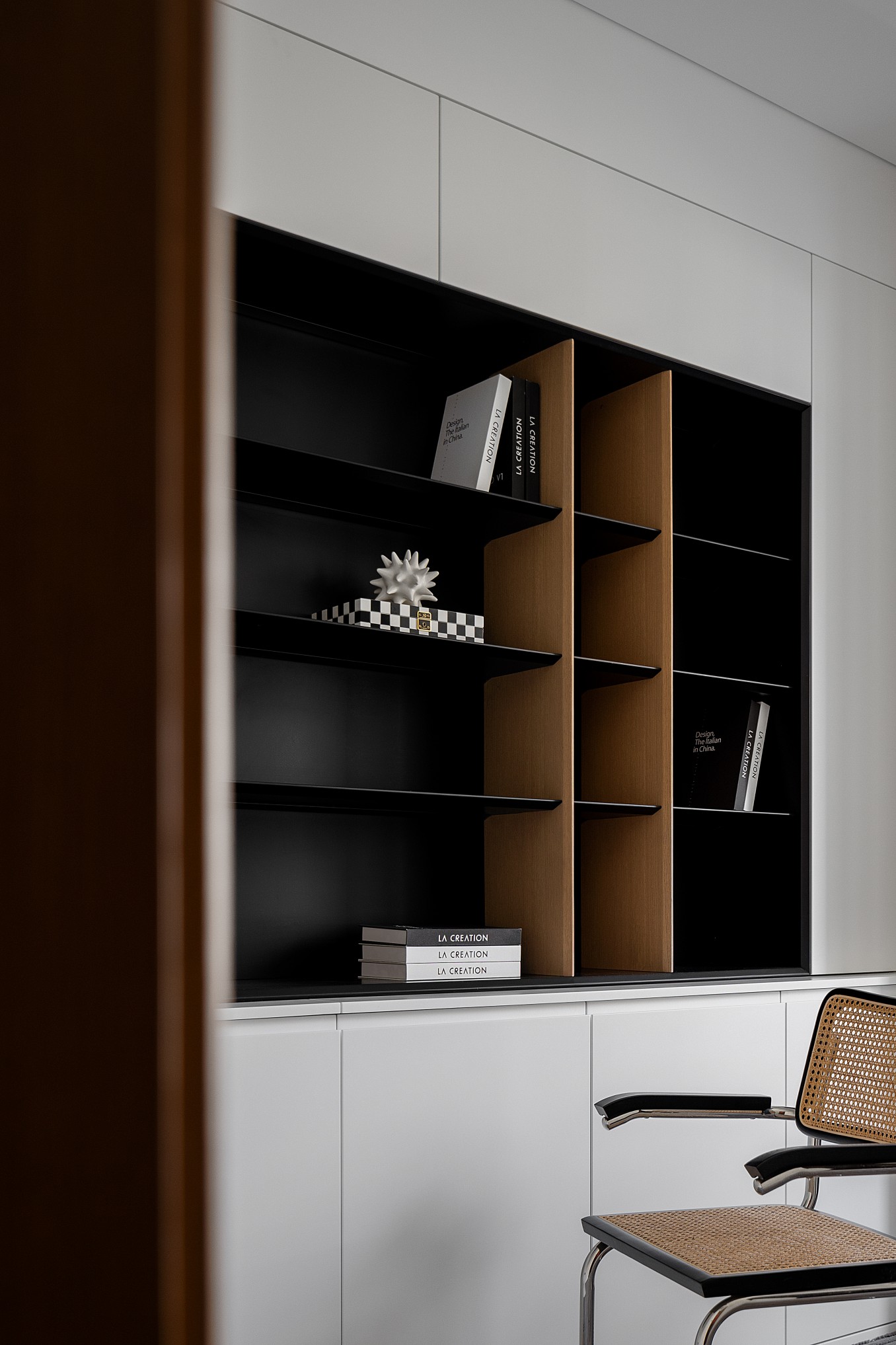 【功能与美学的结合】家具设计注重功能与美学的完美平衡,例如书房区域的悬浮式书桌与展示柜,不仅提升了储物功能,也强化了艺术氛围。