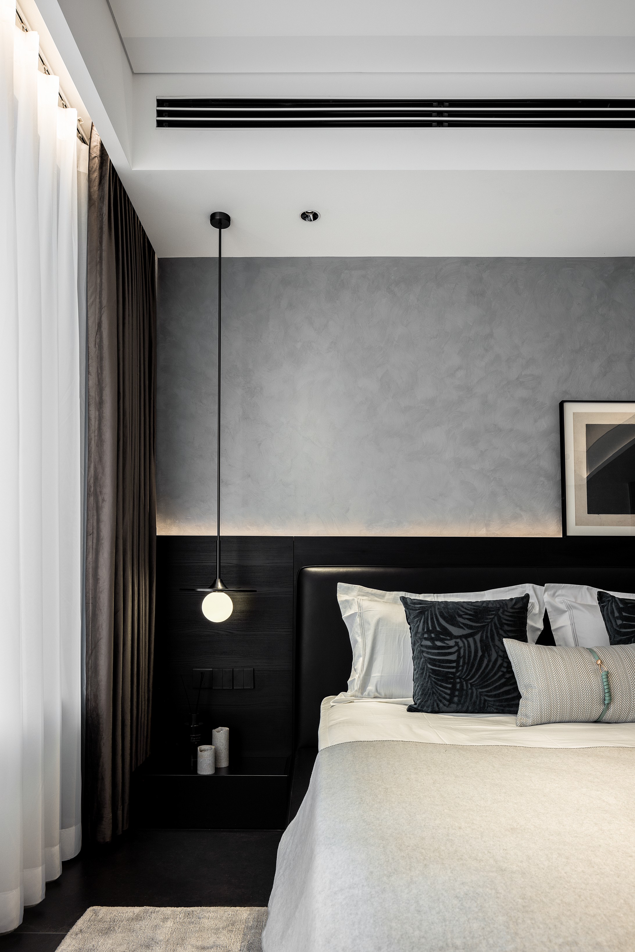 【墙面与天花板】墙面主要采用灰色调微水泥、木质护墙板和局部软包装饰,体现低调奢华的氛围。天花板则以简洁的白色吊顶设计为主,辅以隐藏灯带和线性灯具,丰富空间的层次感和现代感。
