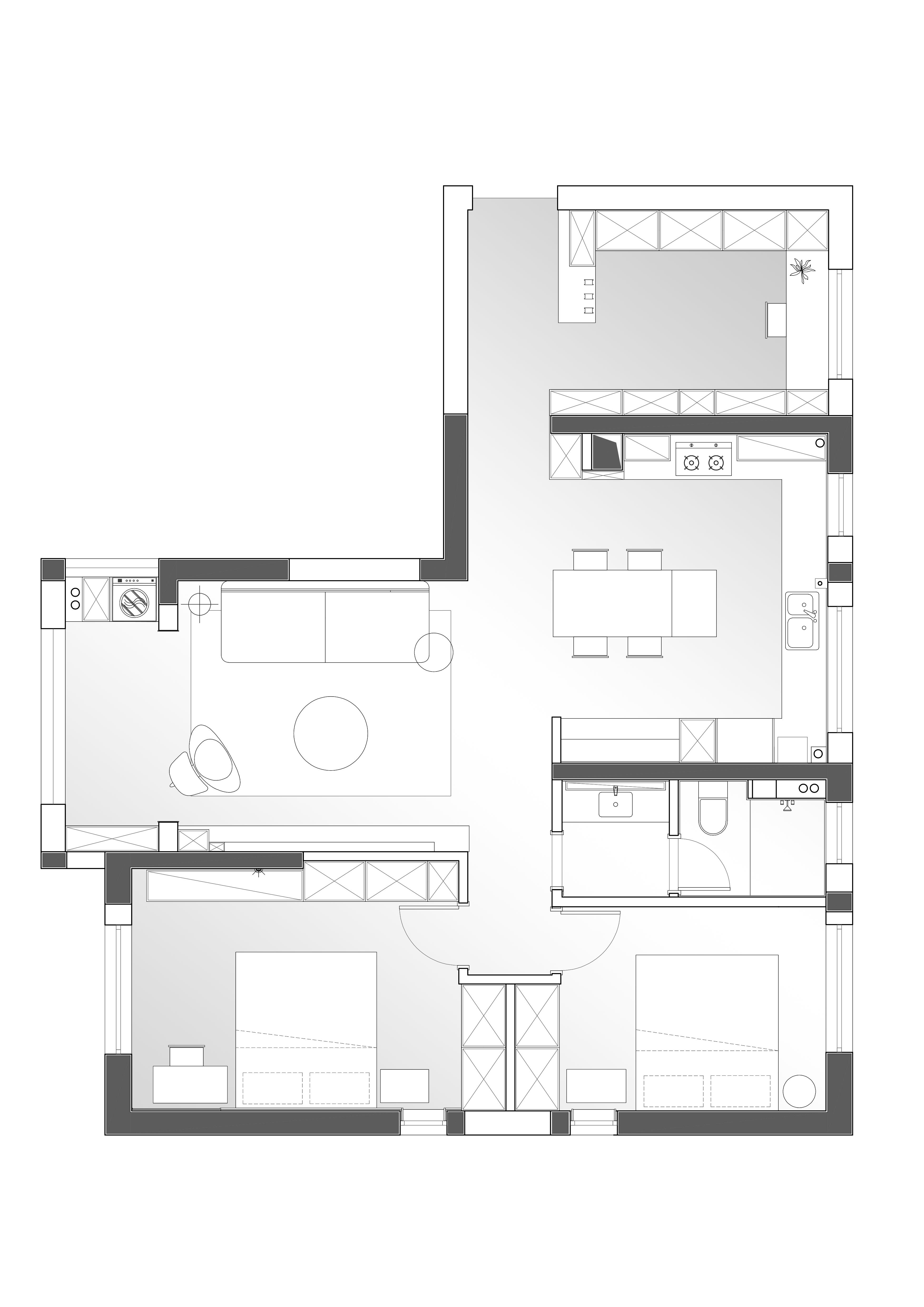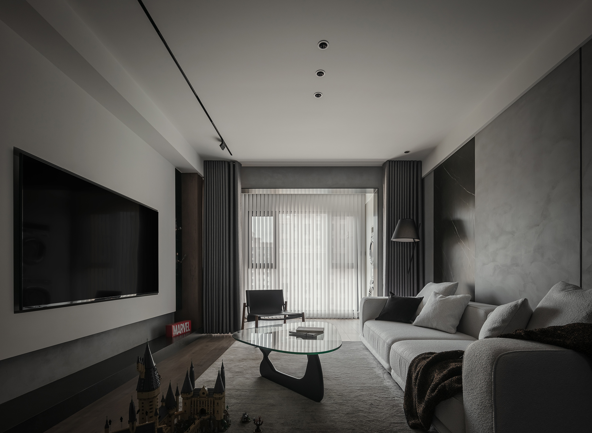 空间布局:本案主要为屋主一人居住,喜欢拼大型模型、拼图,经常邀好友来家中聚会的她,需要更开阔的空间。