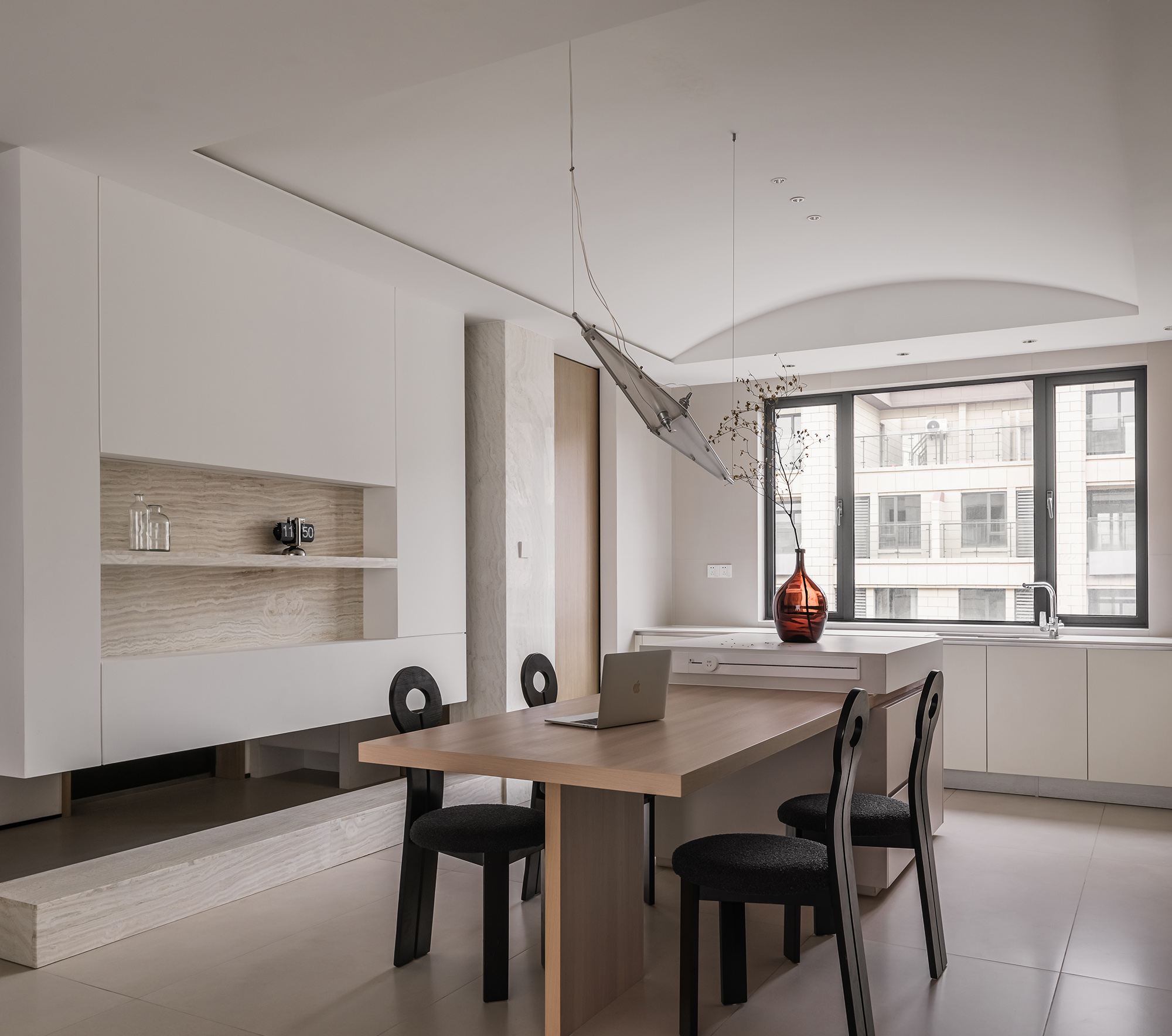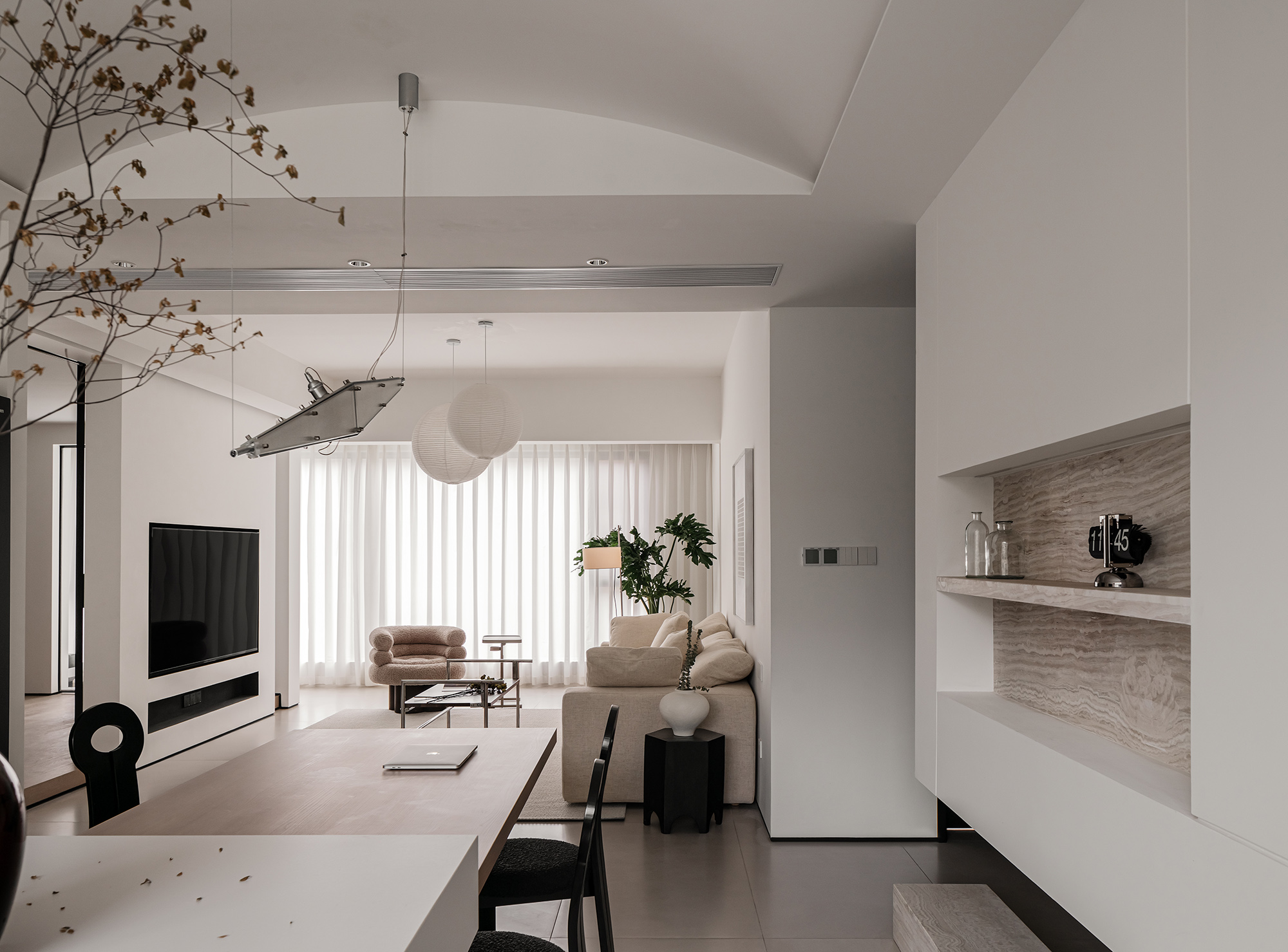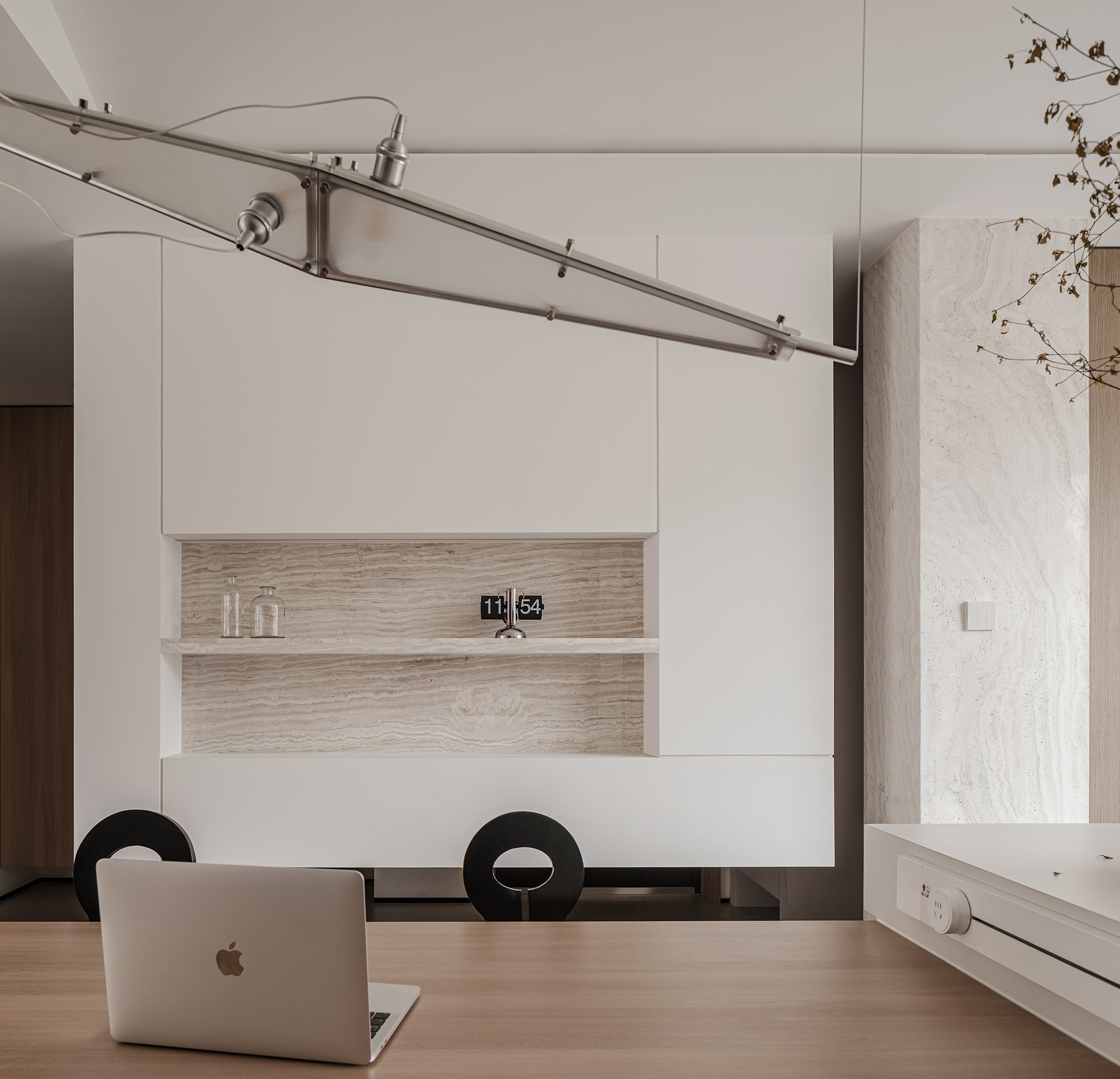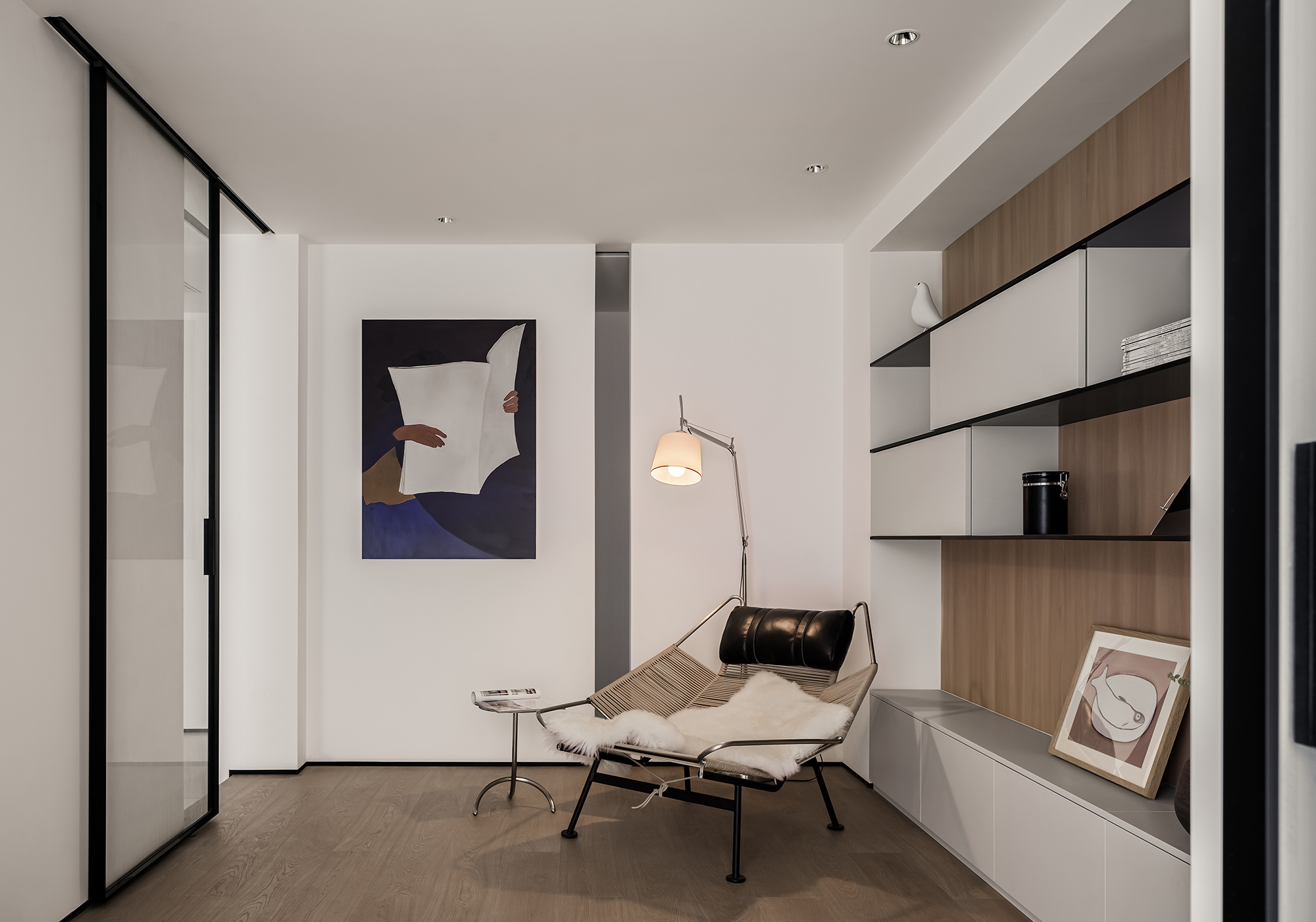 空间意境:整个公共区域都是开放且自由的,吊滑门和口袋门灵活开合空间,墙与墙之间特意留出的间距,是可以让屋主的两只小狗任意穿梭的秘密通道。