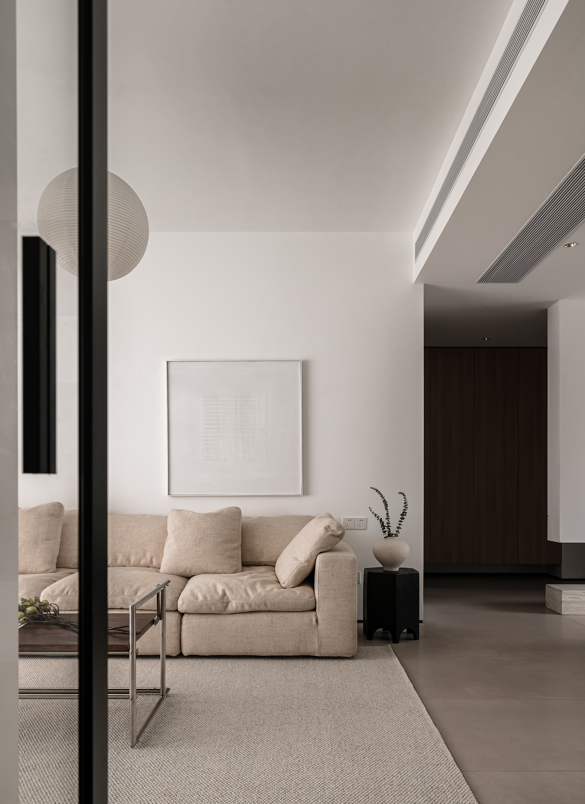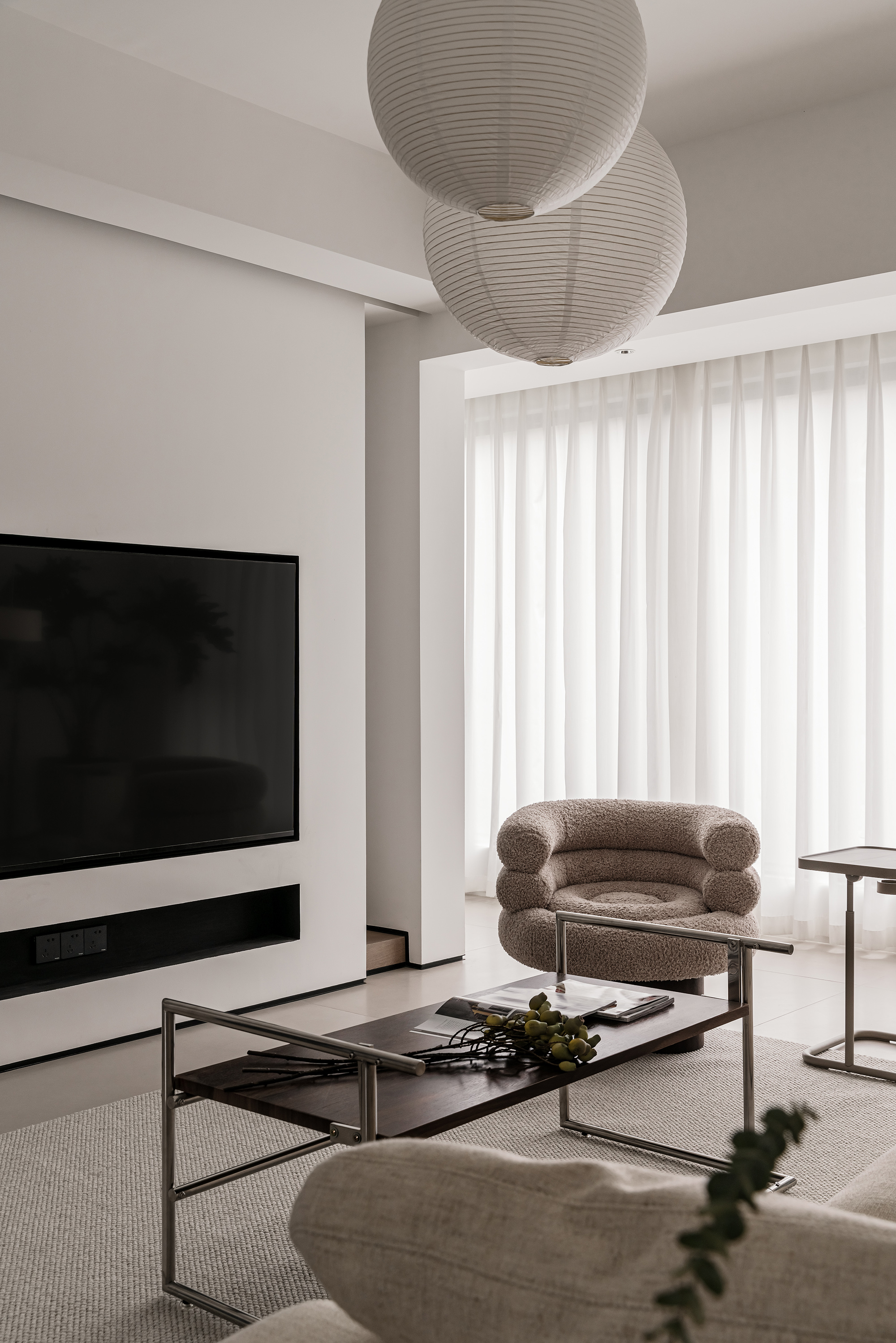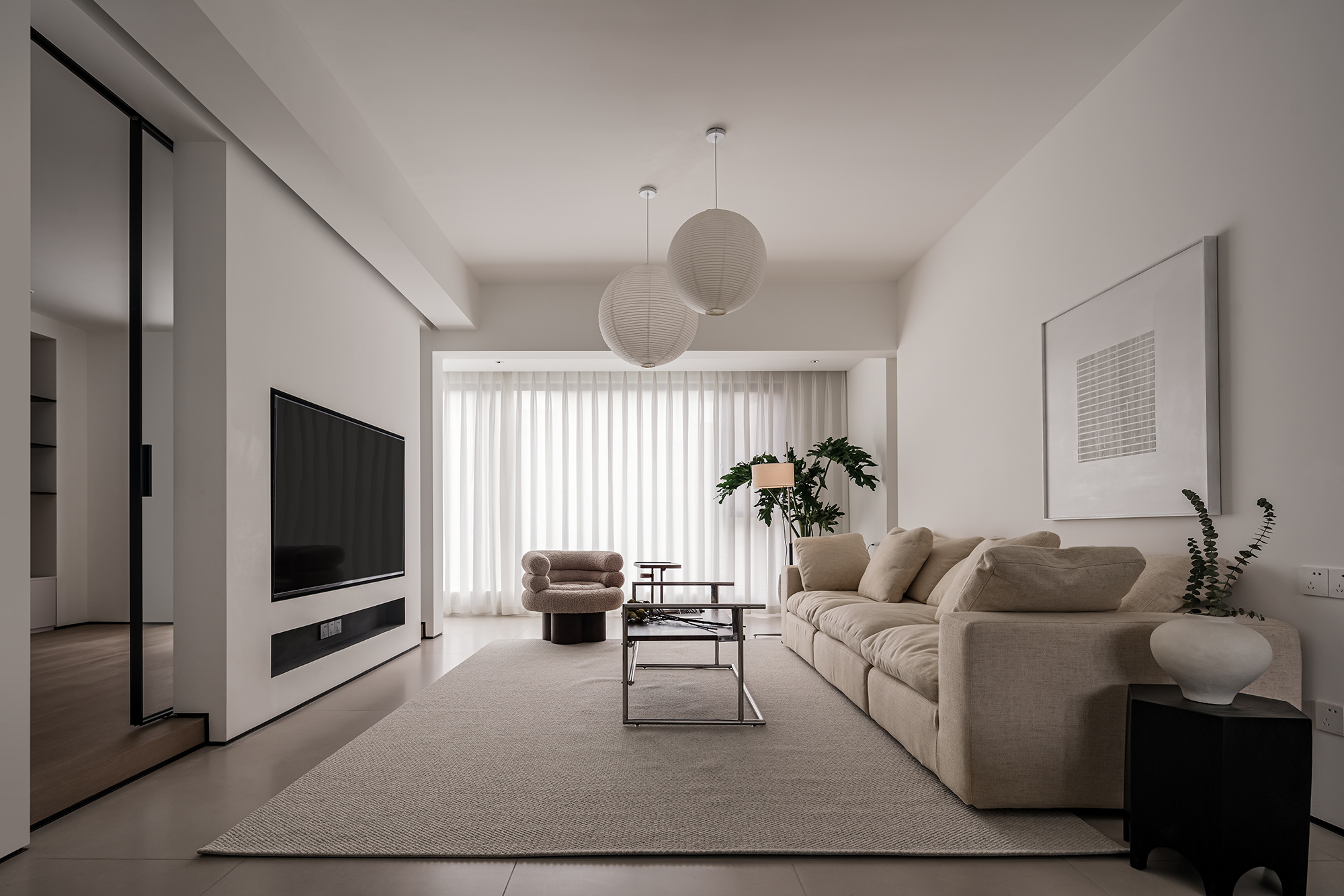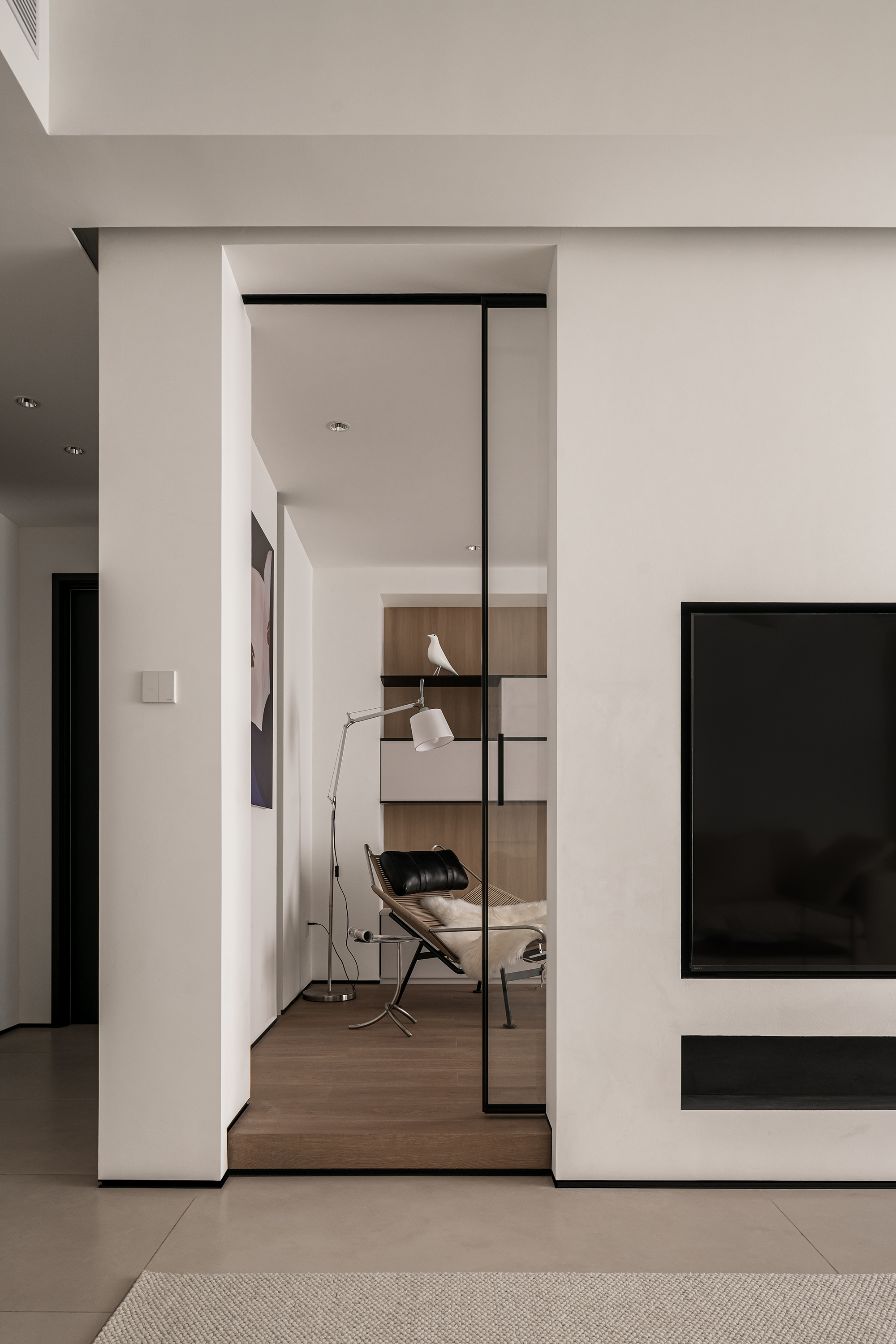 空间意境:整个公共区域都是开放且自由的,吊滑门和口袋门灵活开合空间,墙与墙之间特意留出的间距,是可以让屋主的两只小狗任意穿梭的秘密通道。
