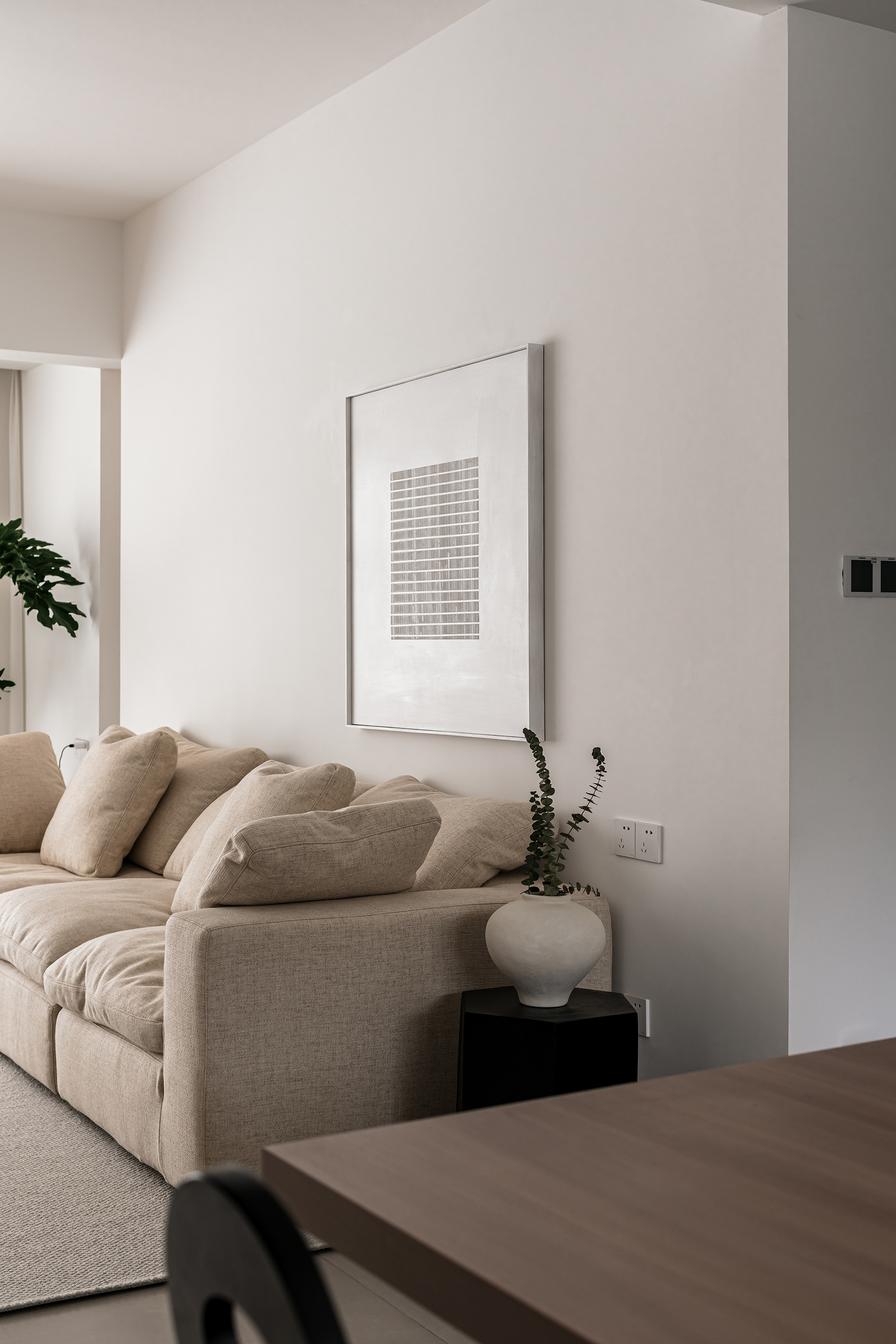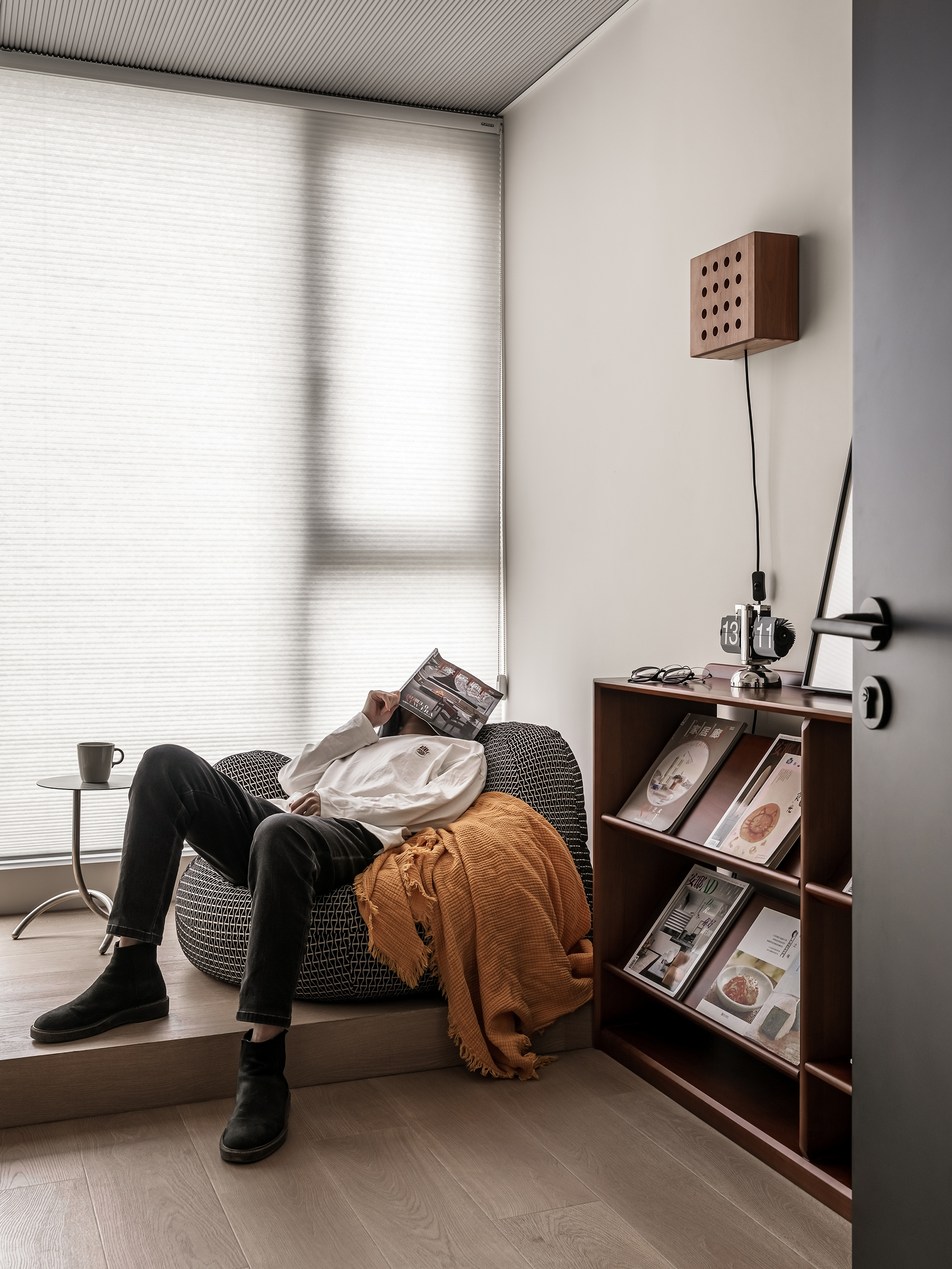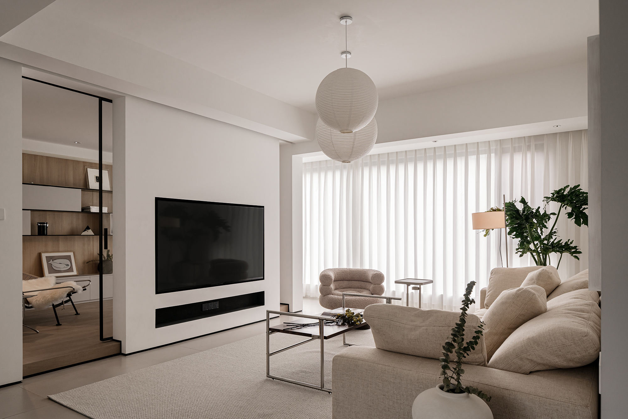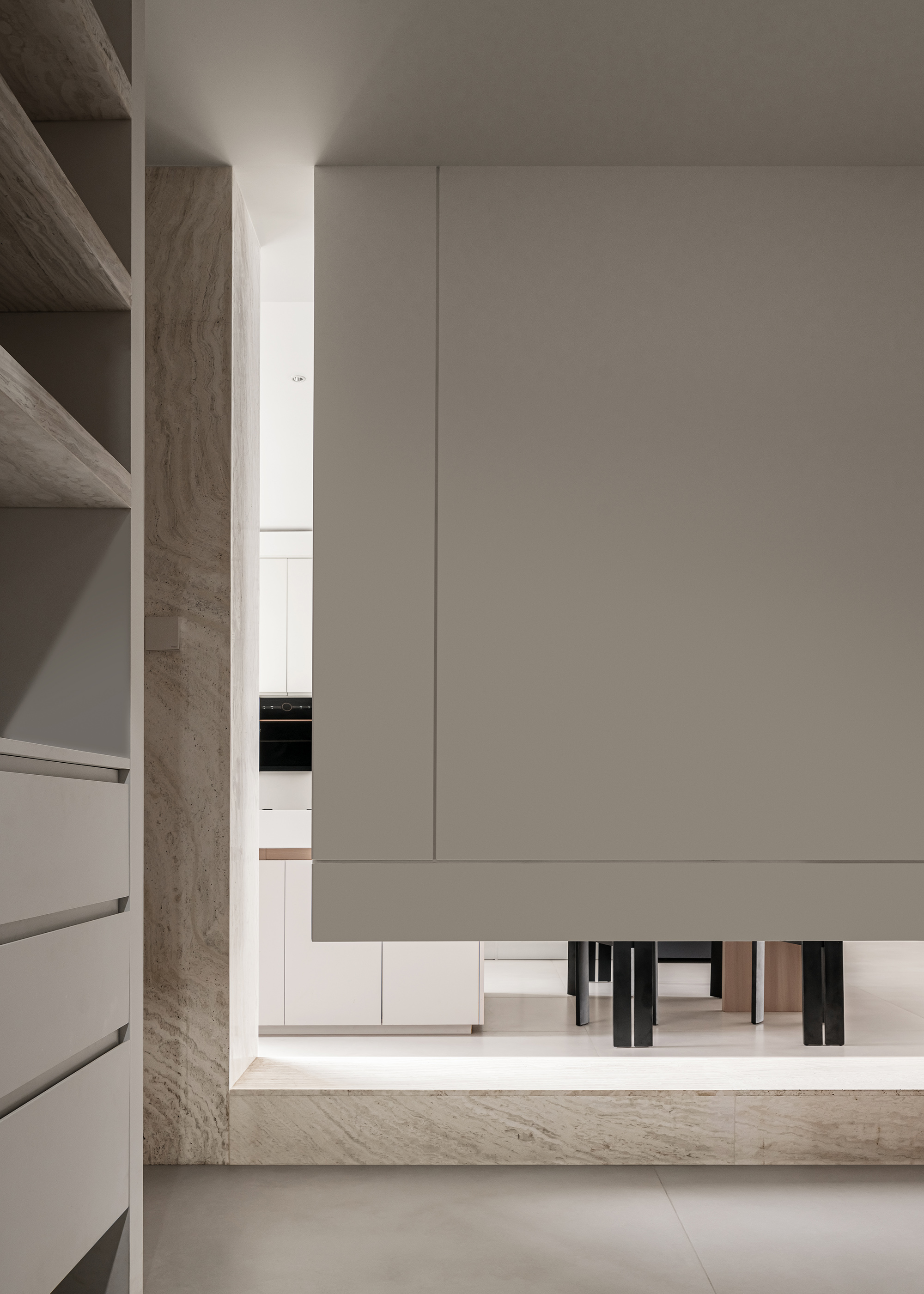 空间意境:整个公共区域都是开放且自由的,吊滑门和口袋门灵活开合空间,墙与墙之间特意留出的间距,是可以让屋主的两只小狗任意穿梭的秘密通道。