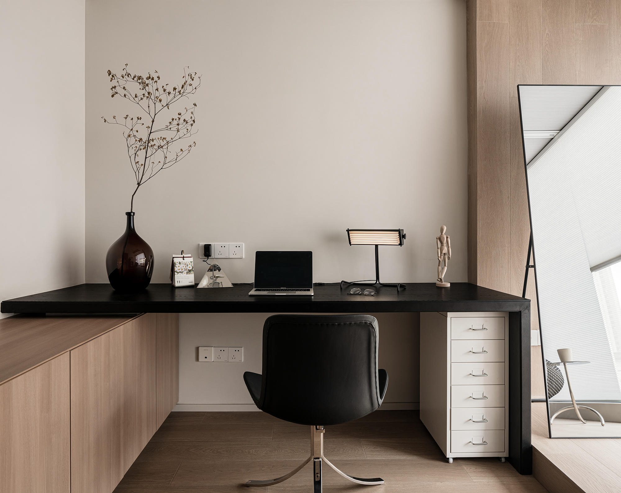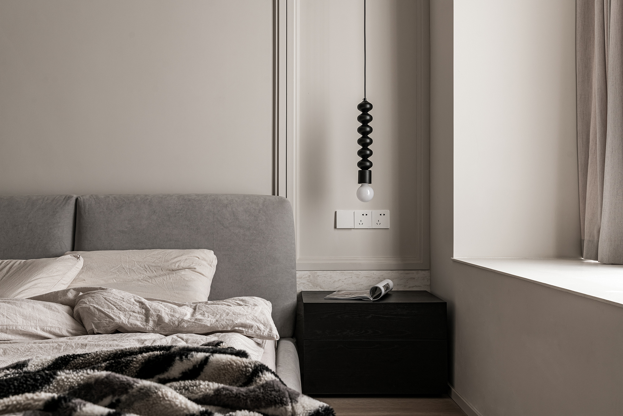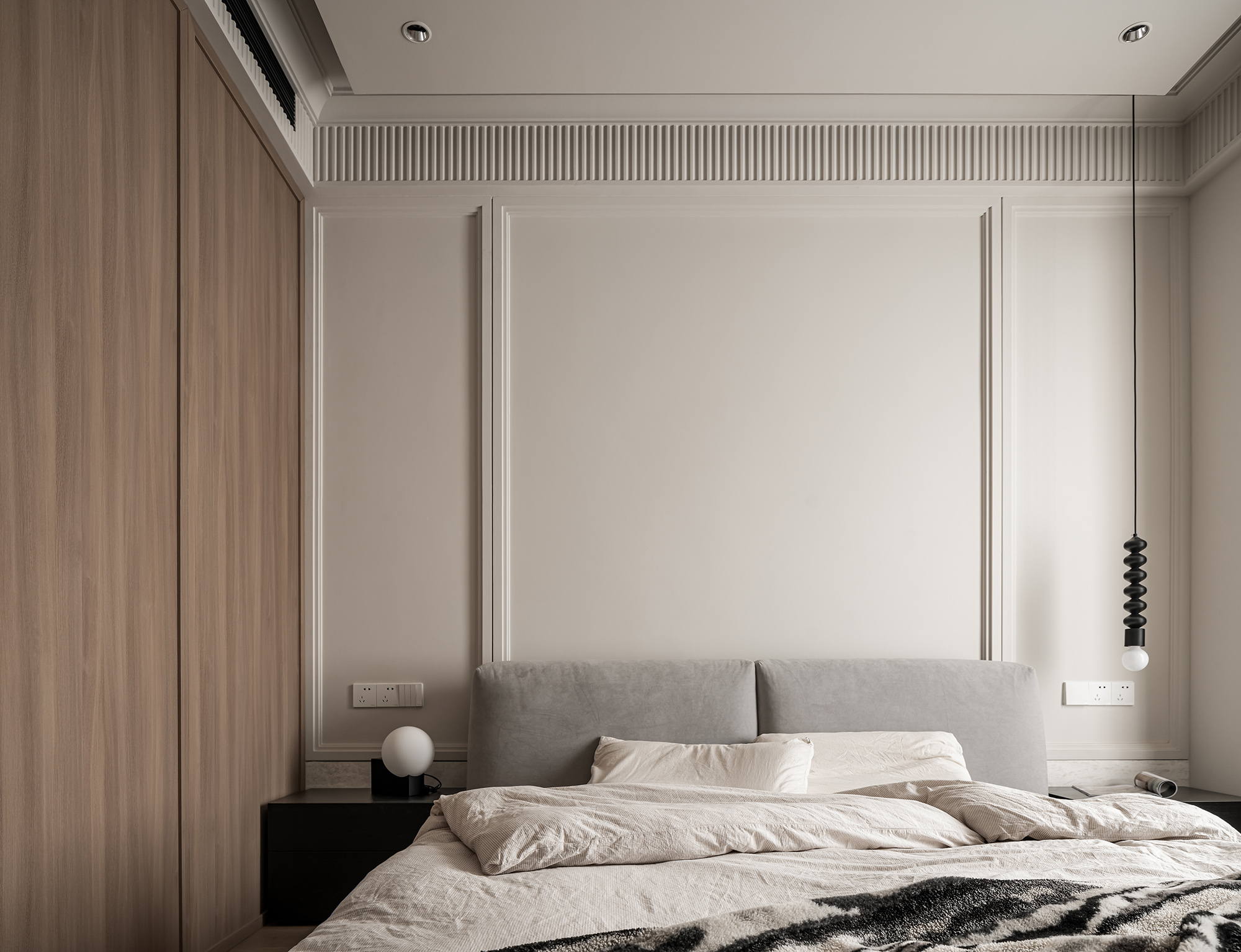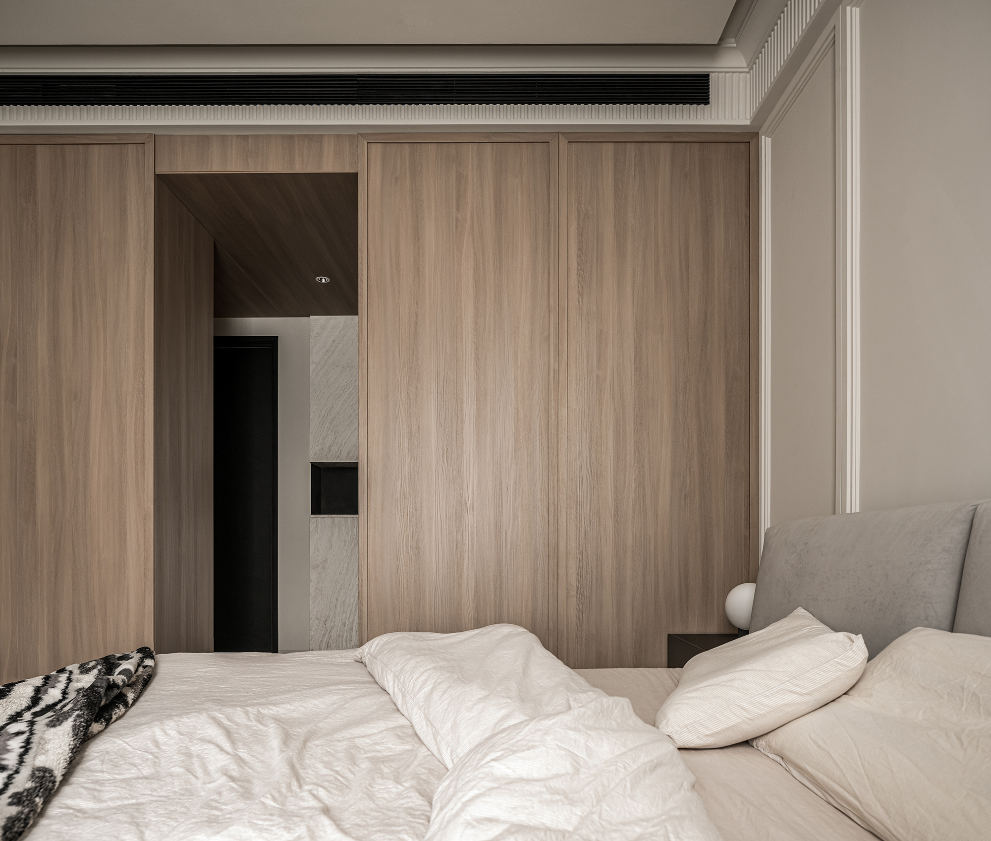 主卧套间内则强调私密性与围合感,这也是安全感的来源;巧妙利用过道空间,提高储物量的同时,增加空间利用率。 -
