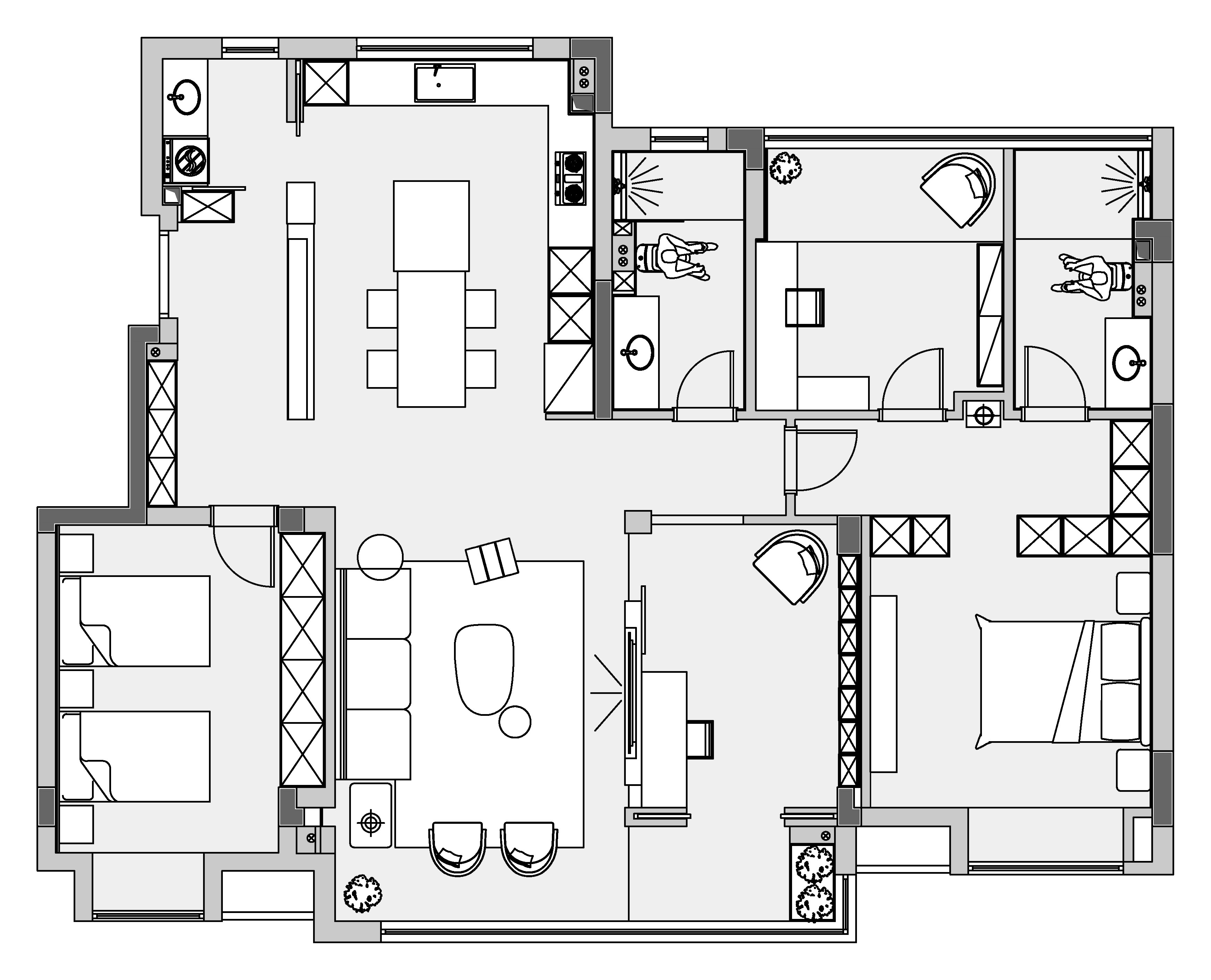 空间布局:空间的流动性是本案关注的重点,我们尽可能将公共空间最大化,并彼此联通,减少动线上的阻碍,将自由自在、无拘无束体现的淋漓尽致;