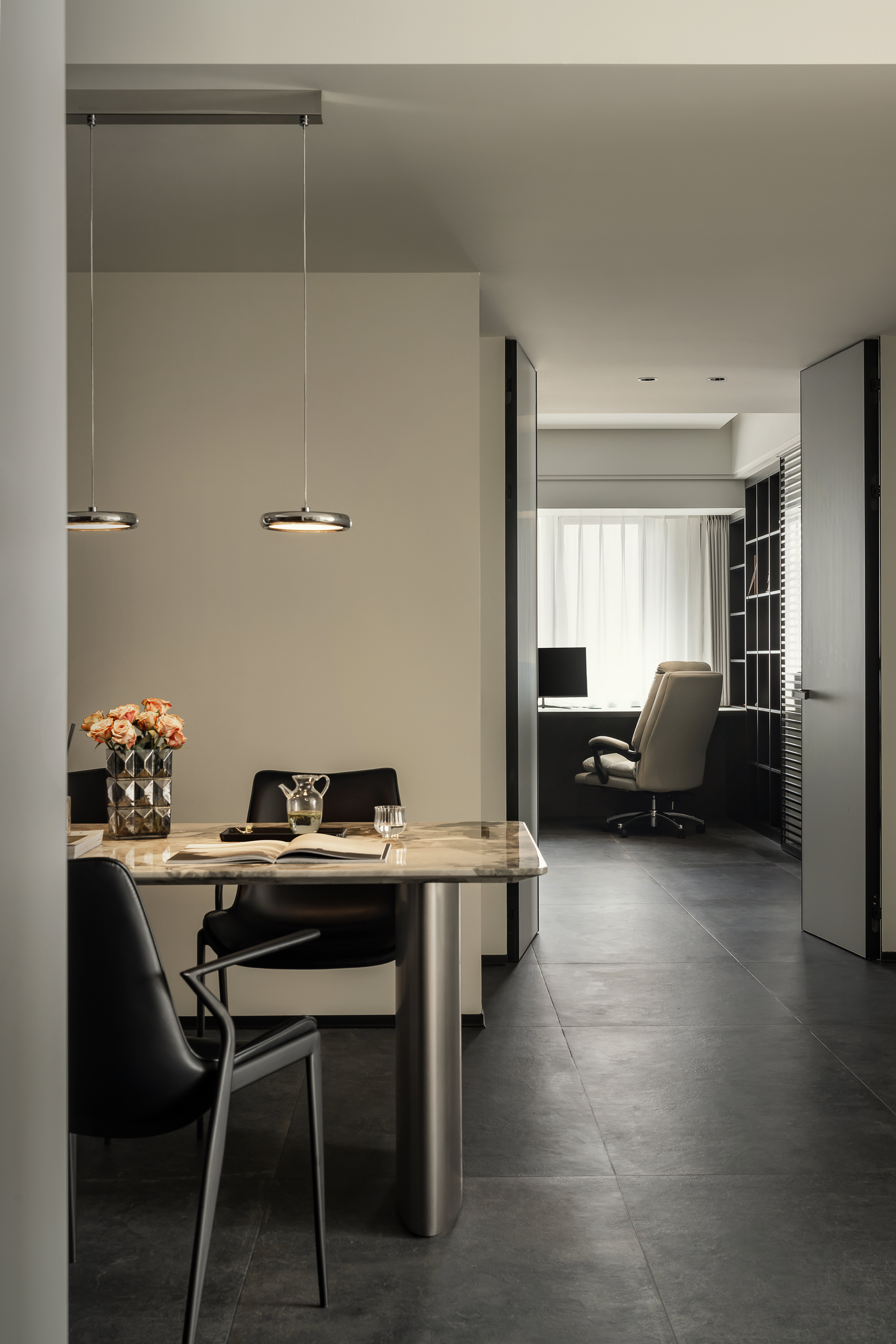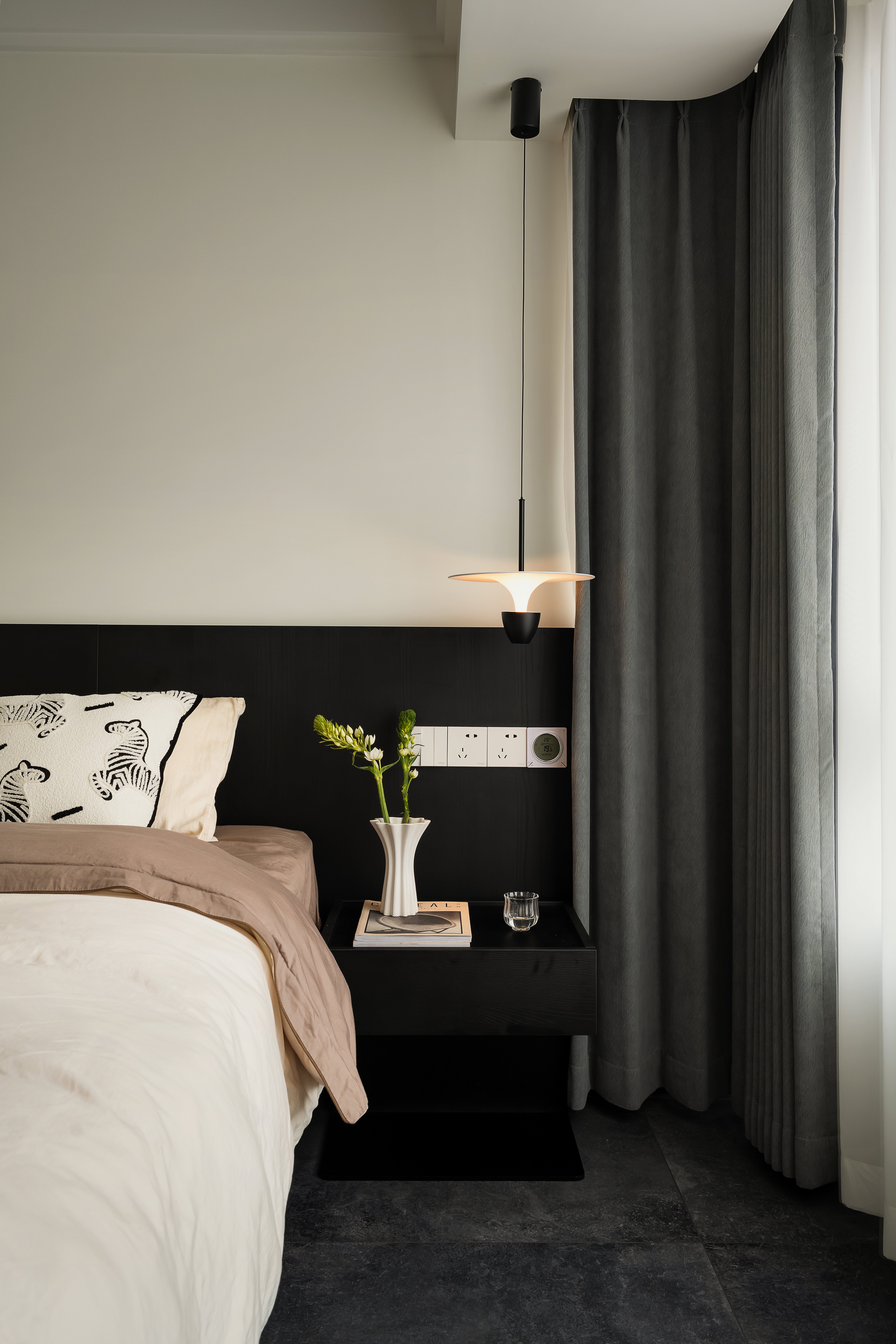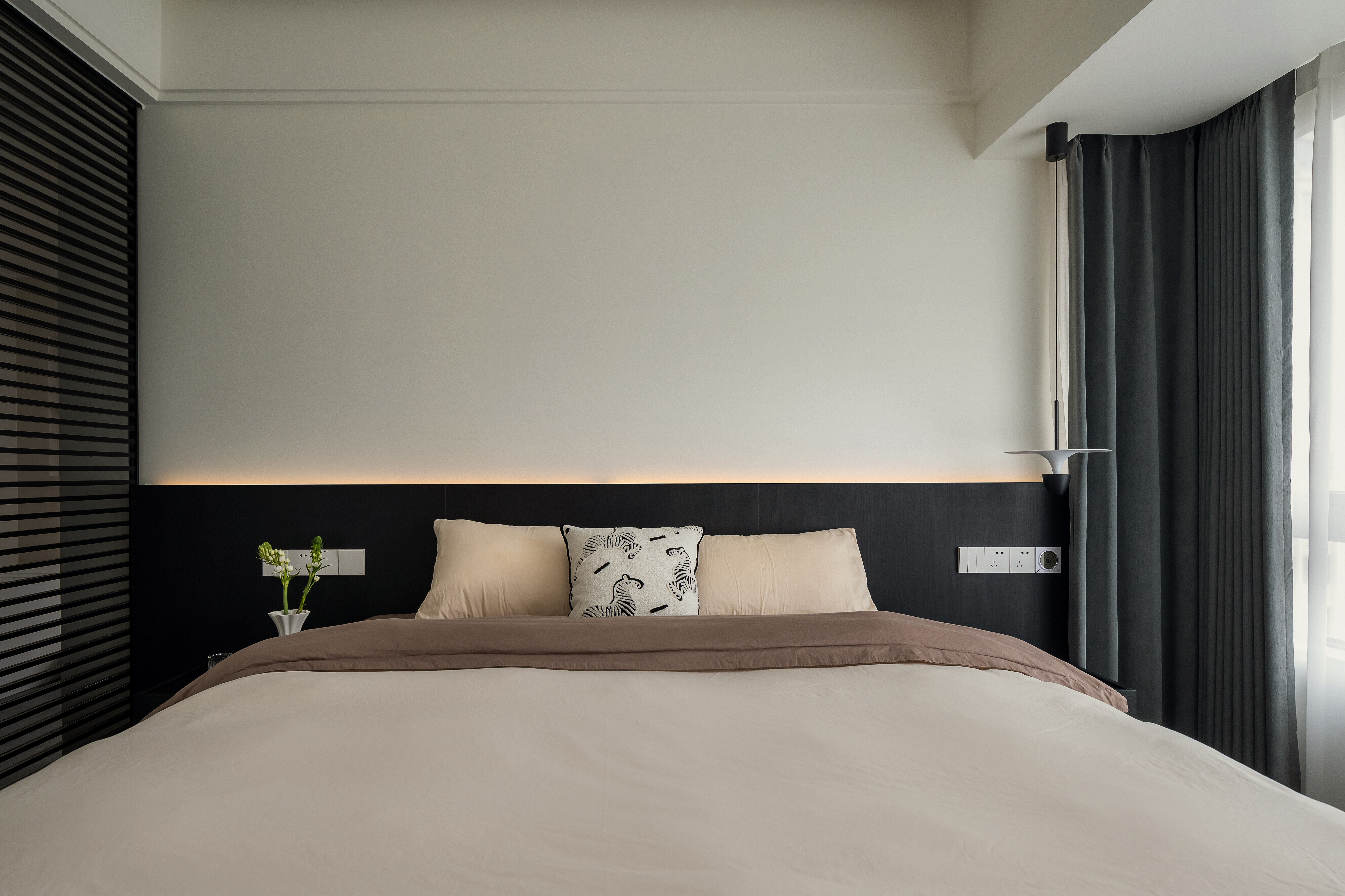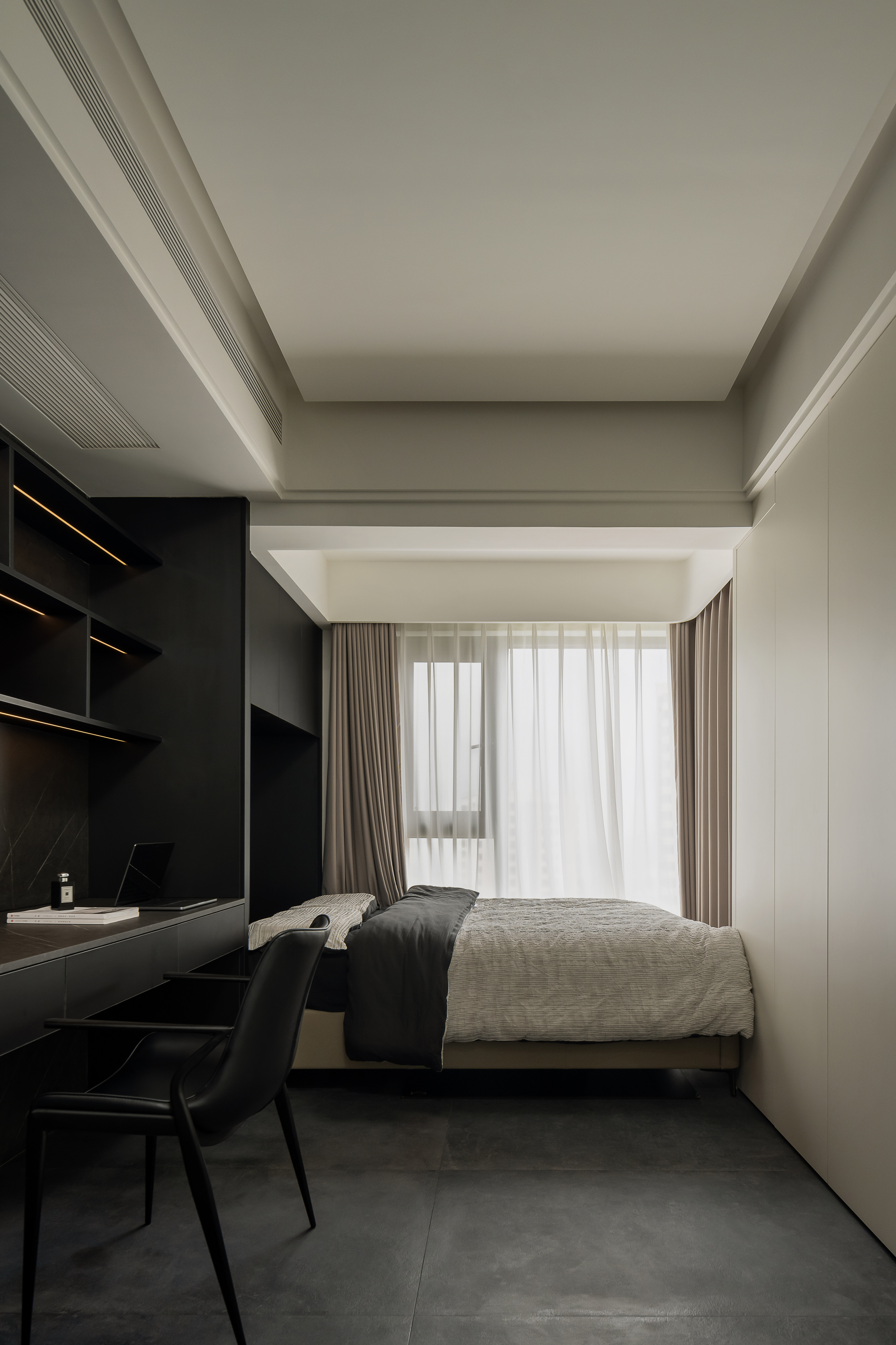 主卧沿袭整体的简约黑白色调,巧妙将闲置的次卧空间融入书房设计之中,从而创造出一个与主卧紧密相连、浑然一体的豪华大套间。这样的布局不仅最大化利用了空间,更实现了主卧与书房功能的无缝对接,为屋主打造出集休憩、阅读、工作于一体的私享领域。