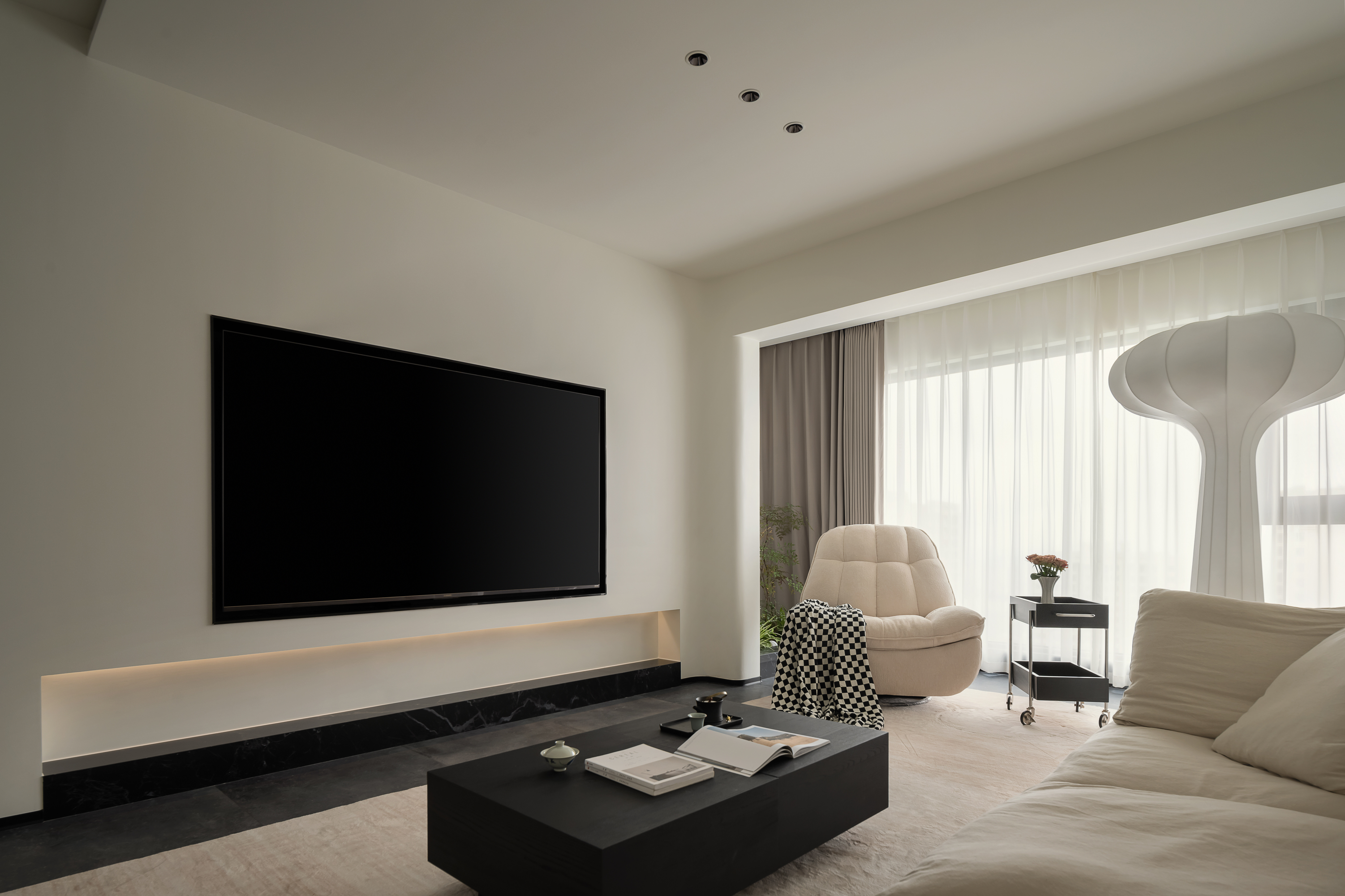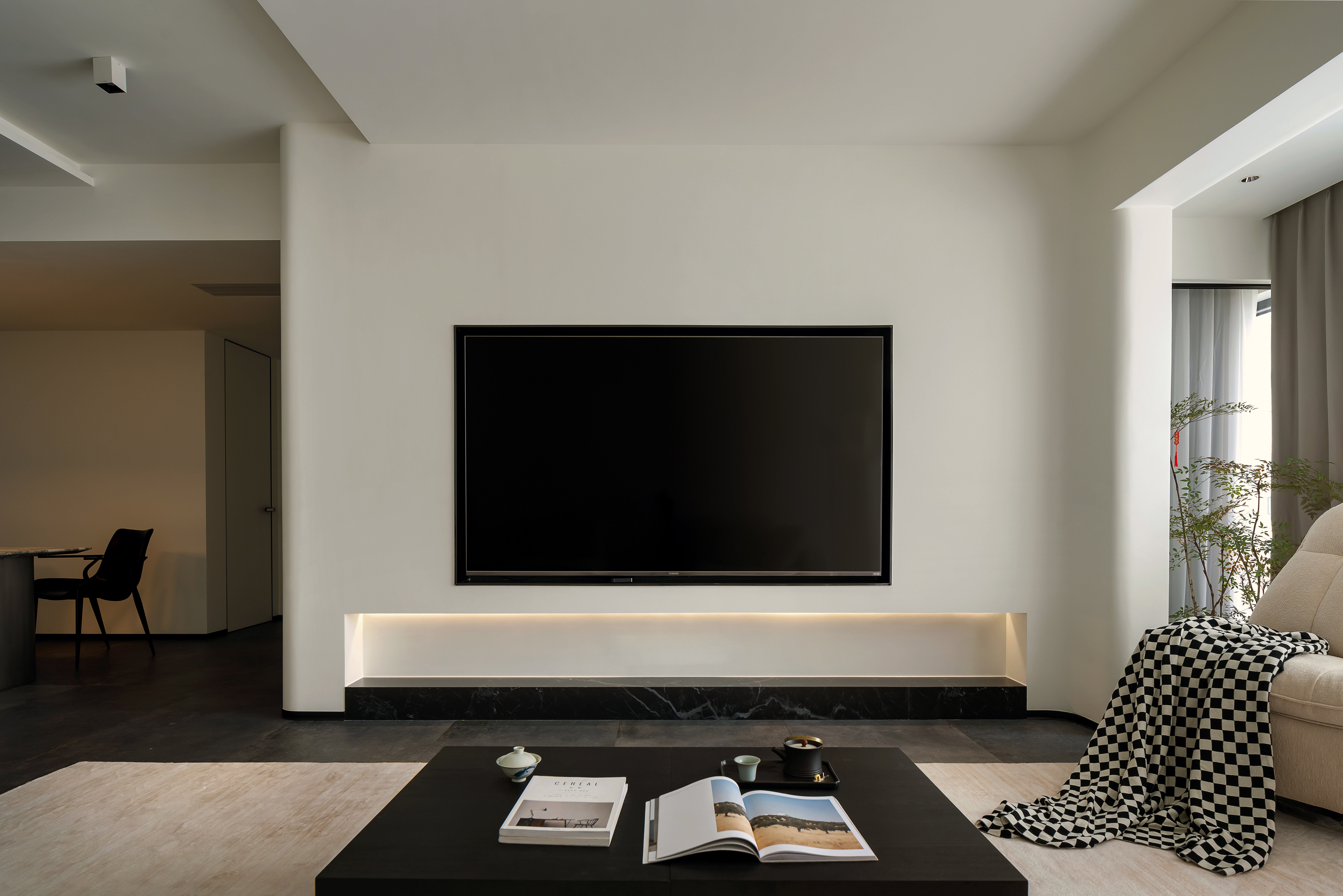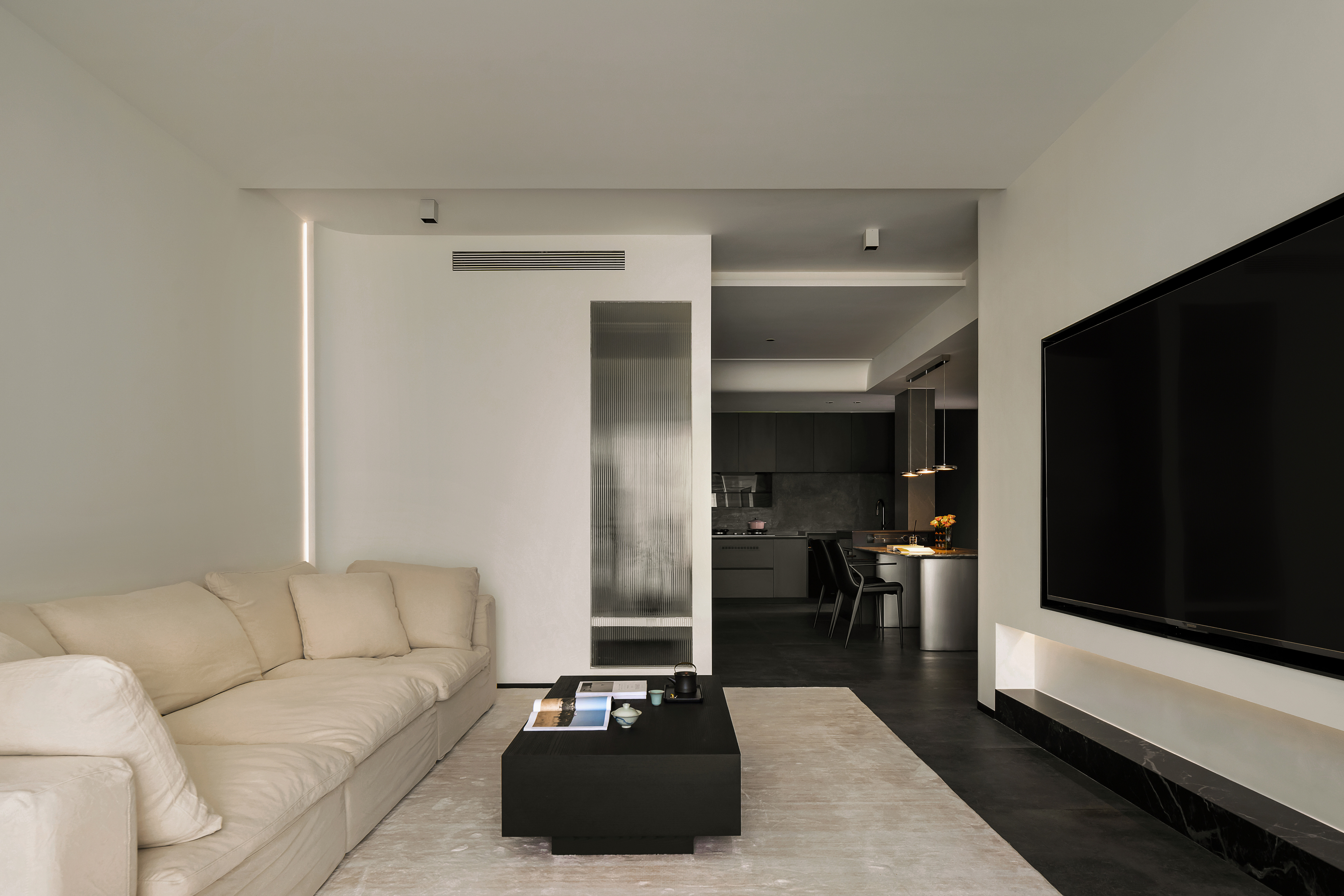 电视墙与嵌入式电视机、灯带设计相得益彰,进一步强化了客厅区域的极简美感与时尚气质。