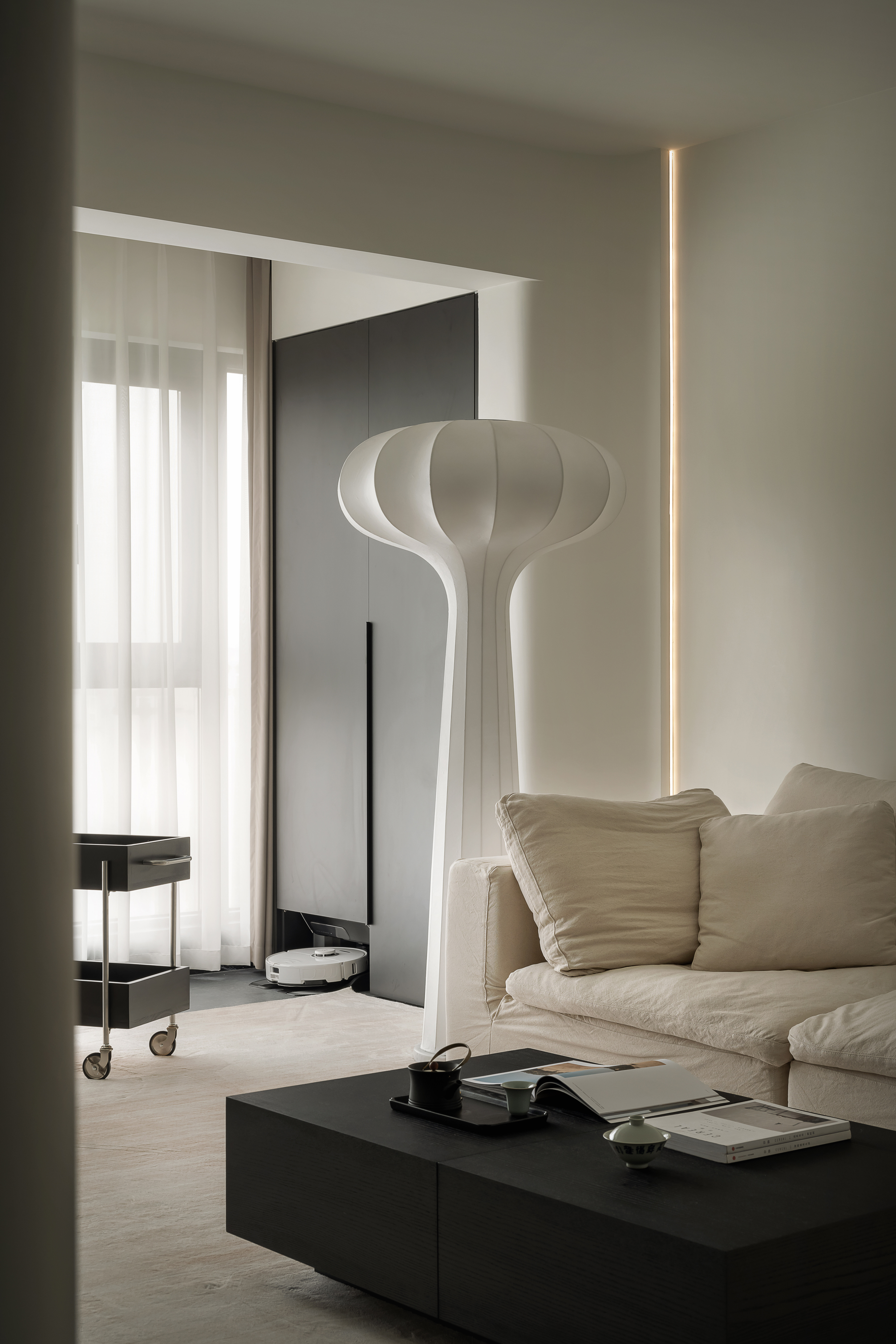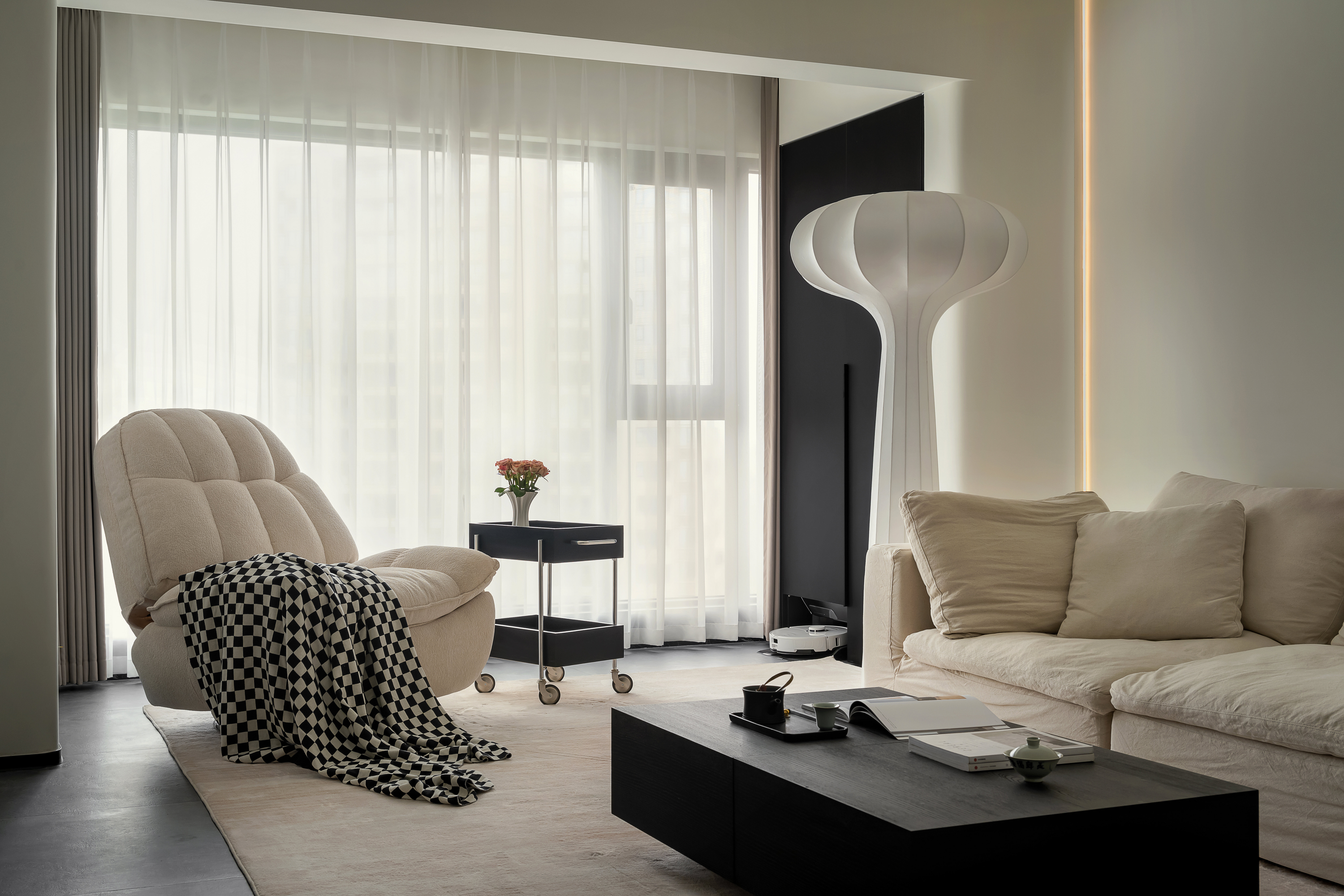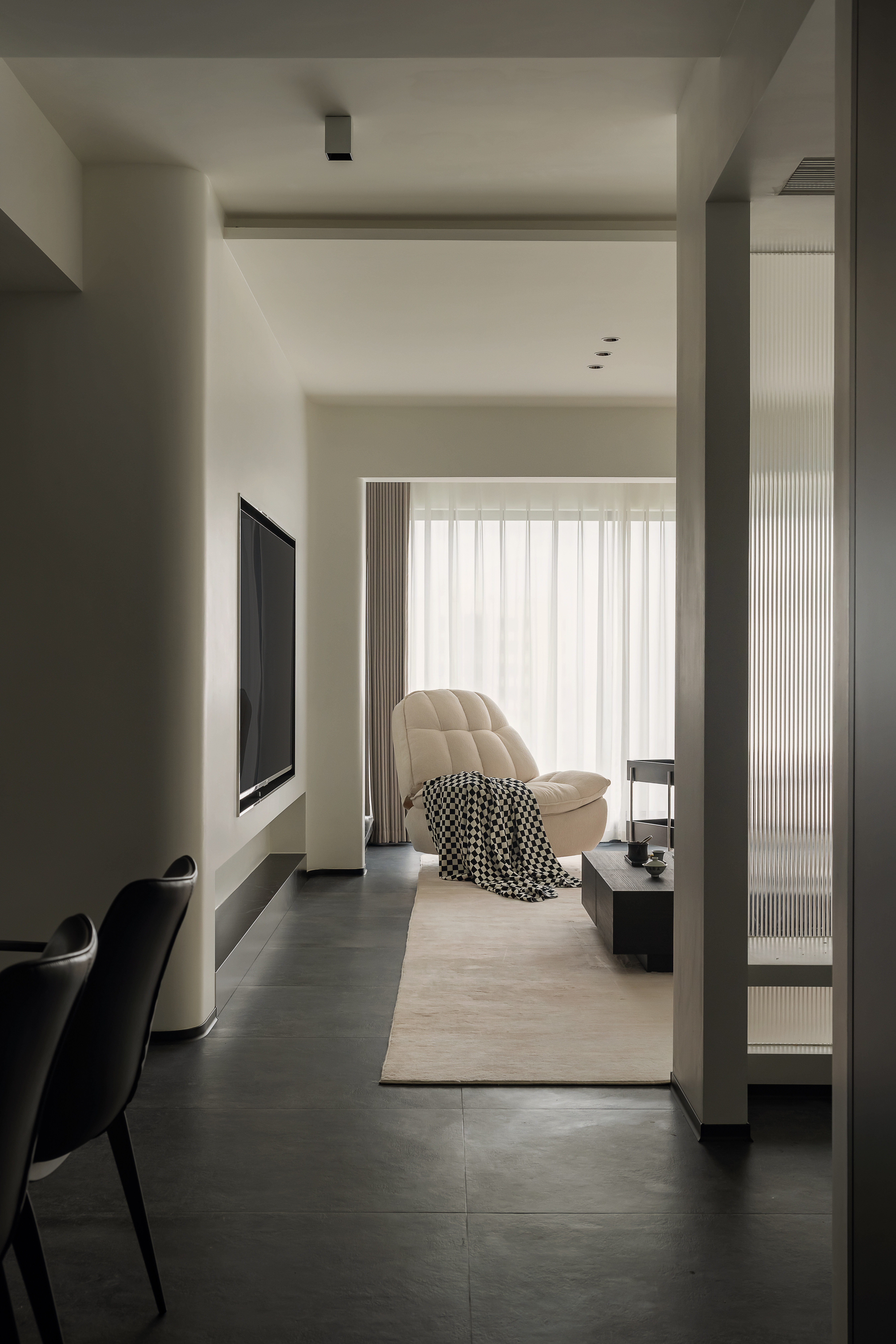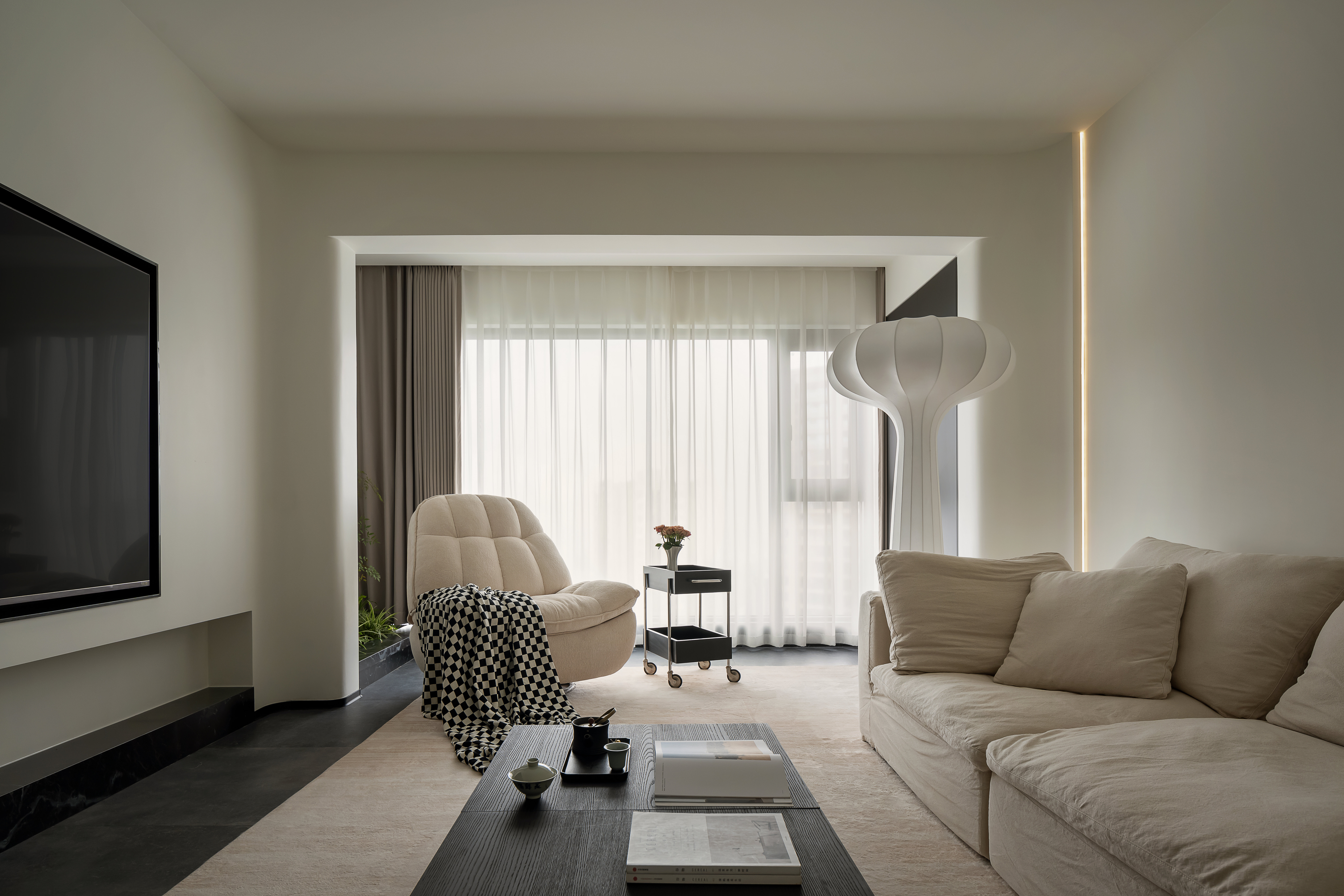 电视墙与嵌入式电视机、灯带设计相得益彰,进一步强化了客厅区域的极简美感与时尚气质。
